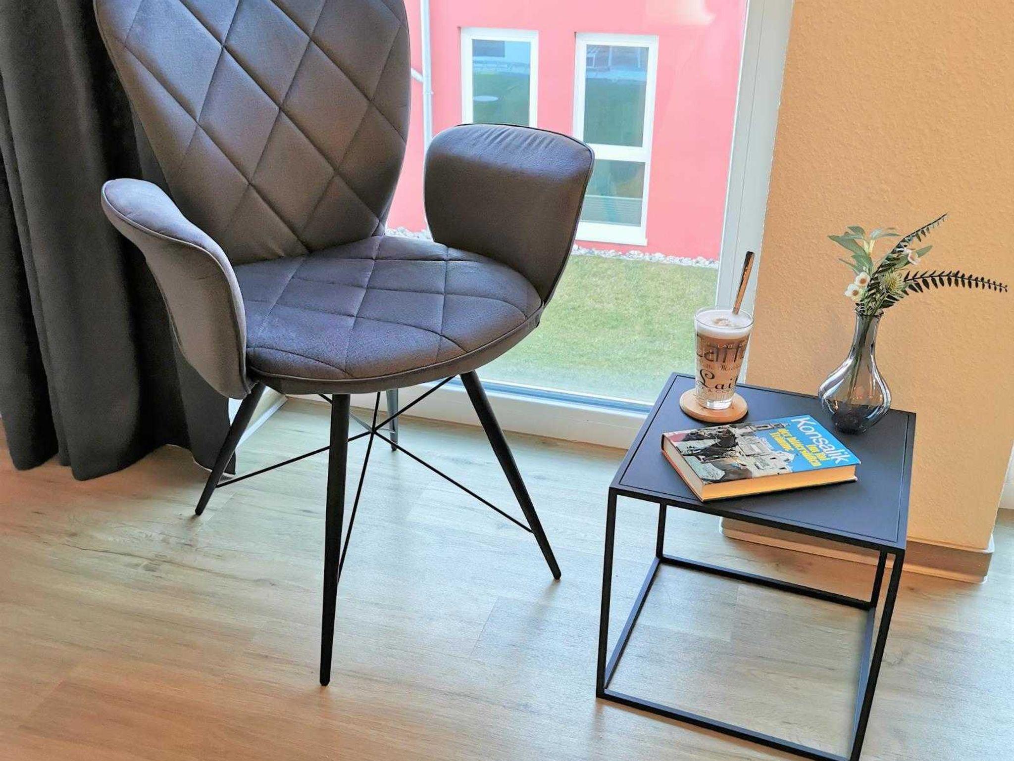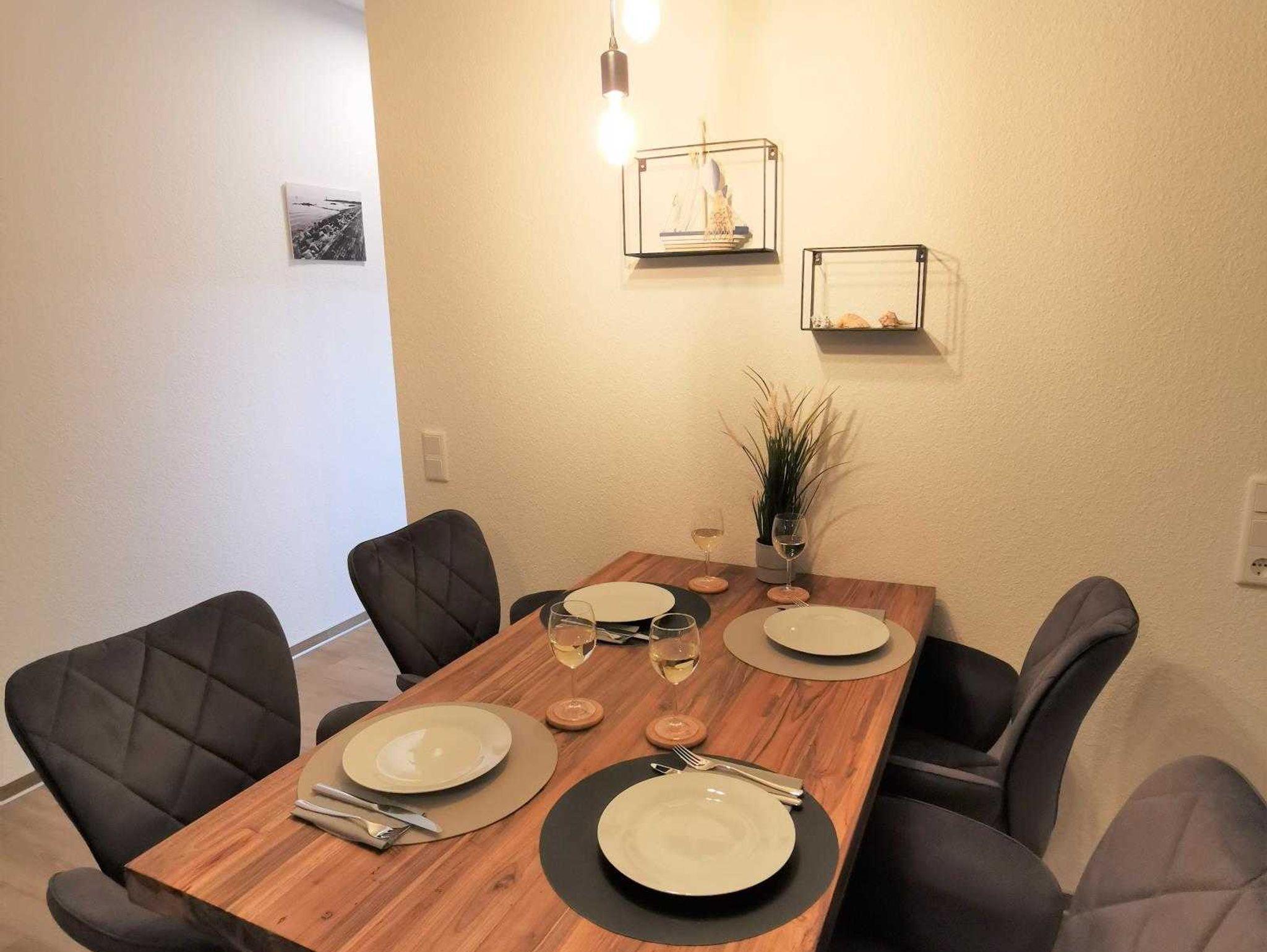 Wohn-/Esszimmer: Schlafcouch, Smart TV 50 Zoll mit SAT-TV und Sky Kanälen. Amazon Prime, Netflix, Disney +, DAZN, Apple TV (Login notwendig), Esstisch mit fünf Stühlen.
