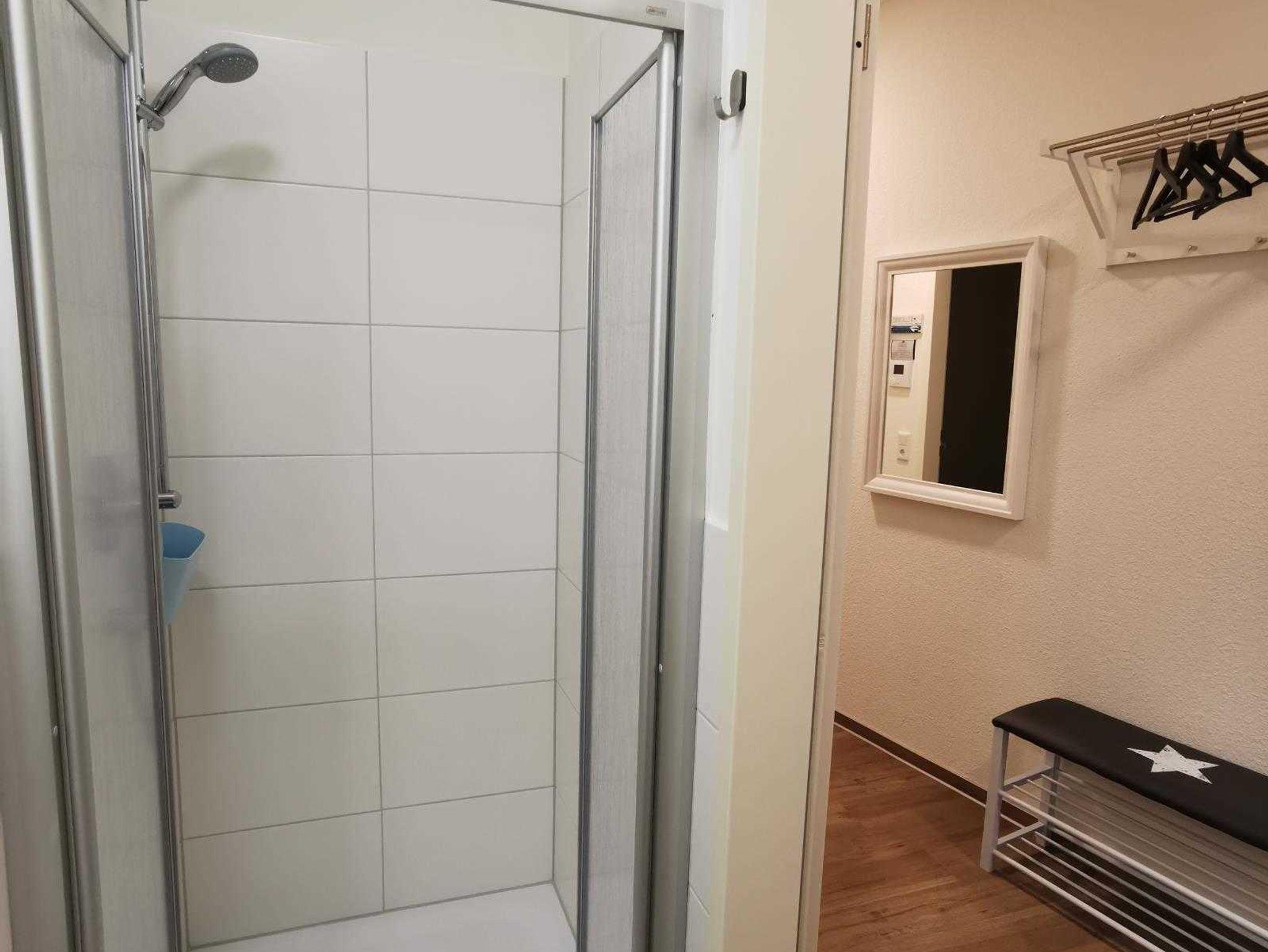 Bodentiefe geflieste Dusche, Wandspiegel und Kosmetikspiegel, Haartrockner, Handtuchhalter.
