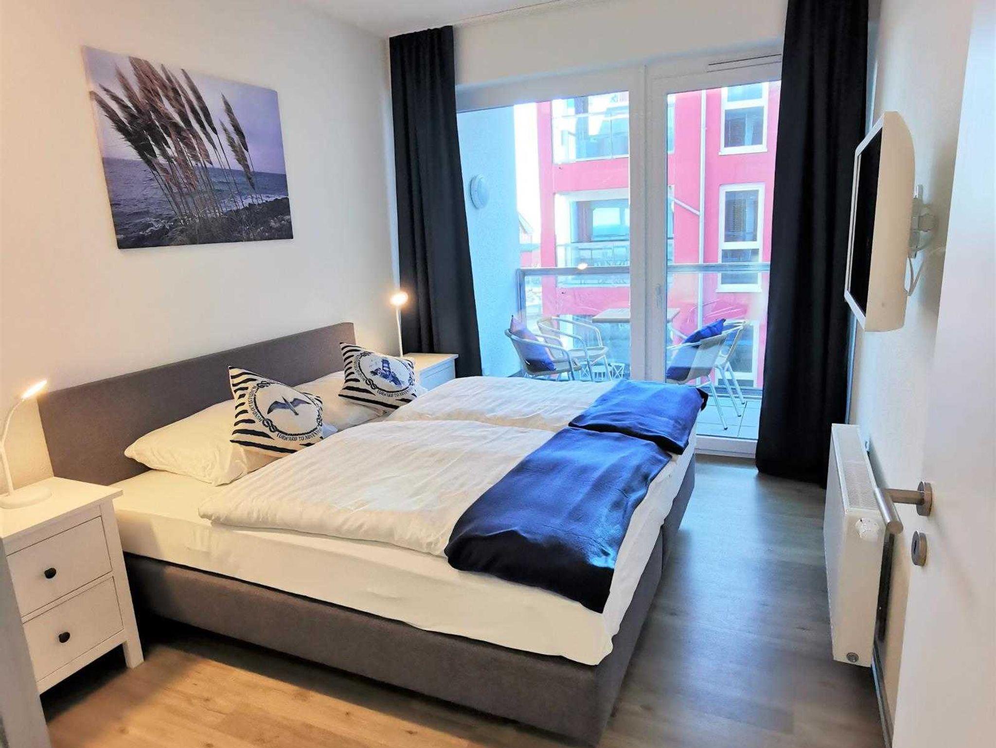 Boxspringbett 180 cm x 200 cm Tonnentaschenfederkern, Zugang zum Balkon mit Blick auf die Ostsee.