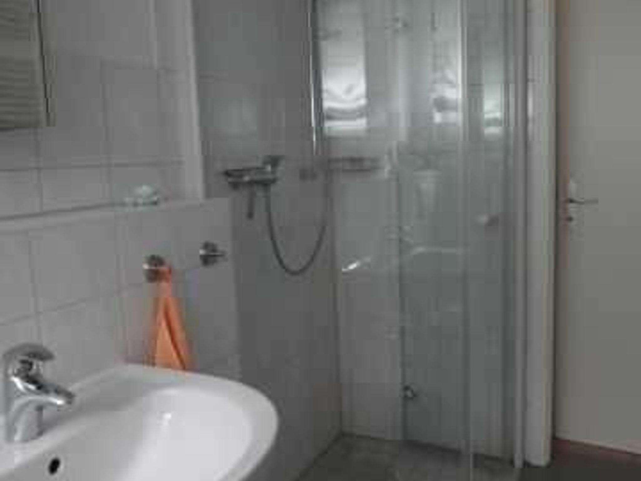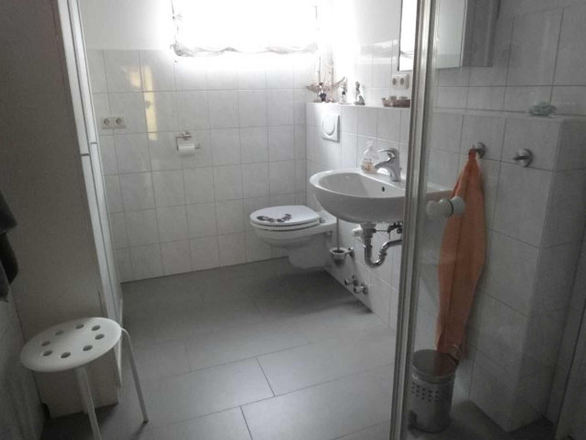 Das Tageslicht-Bad ist mit einer bodengleichen Dusche, WC, Waschbecken, Spiegelschrank und Schrank ausgestattet. Im Herbst und Winter bereitet Ihnen die Fußbodenheizung angenehm warme Füße während und nach dem Duschen.