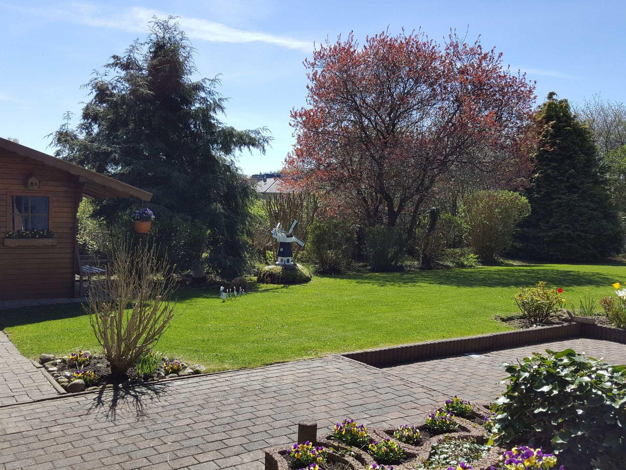 Unser gepflegter Rasen darf zum Sonnen oder zum Spielen genutzt werden. Eine Ruhebank lädt zum Lesen und Sonnen ein.