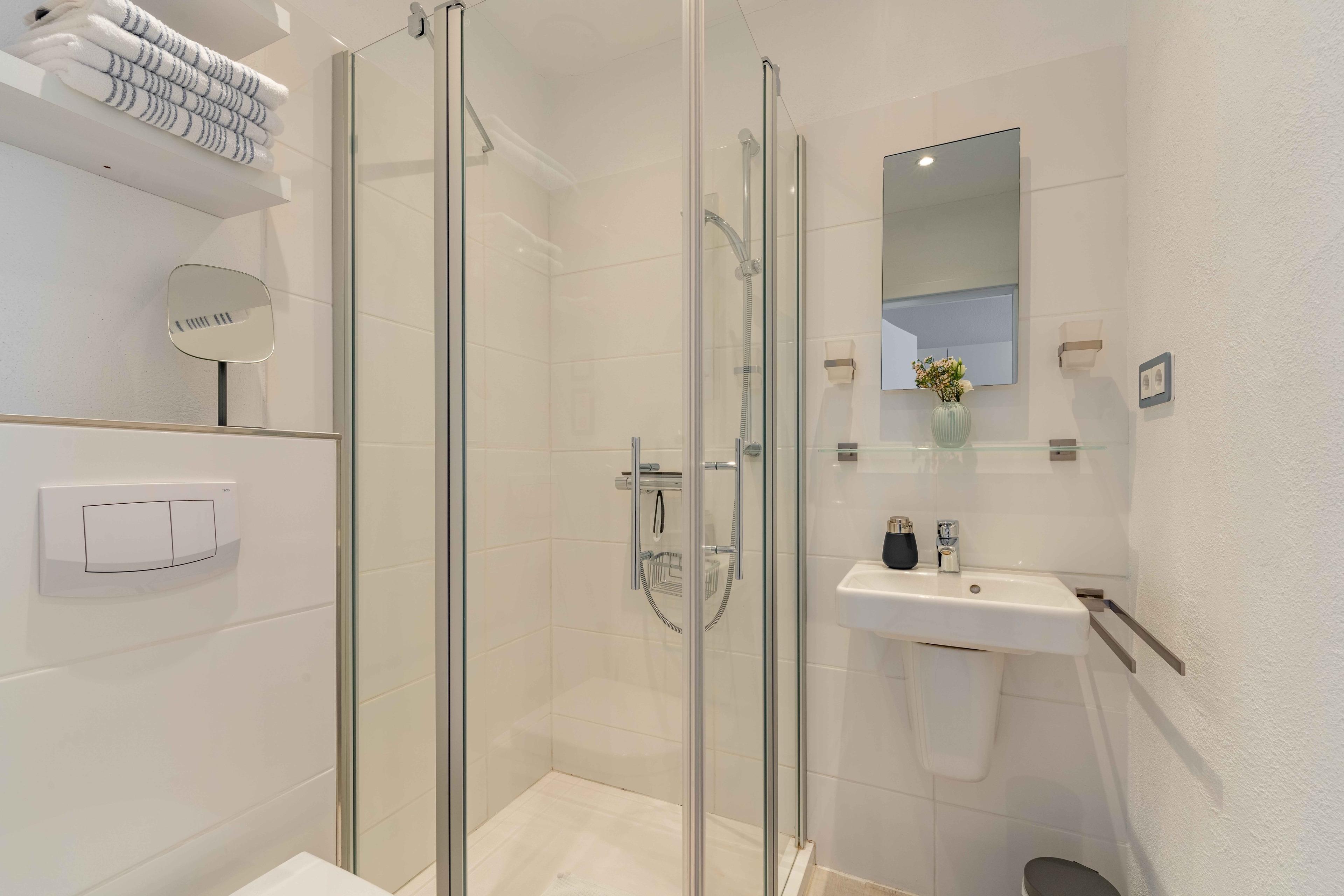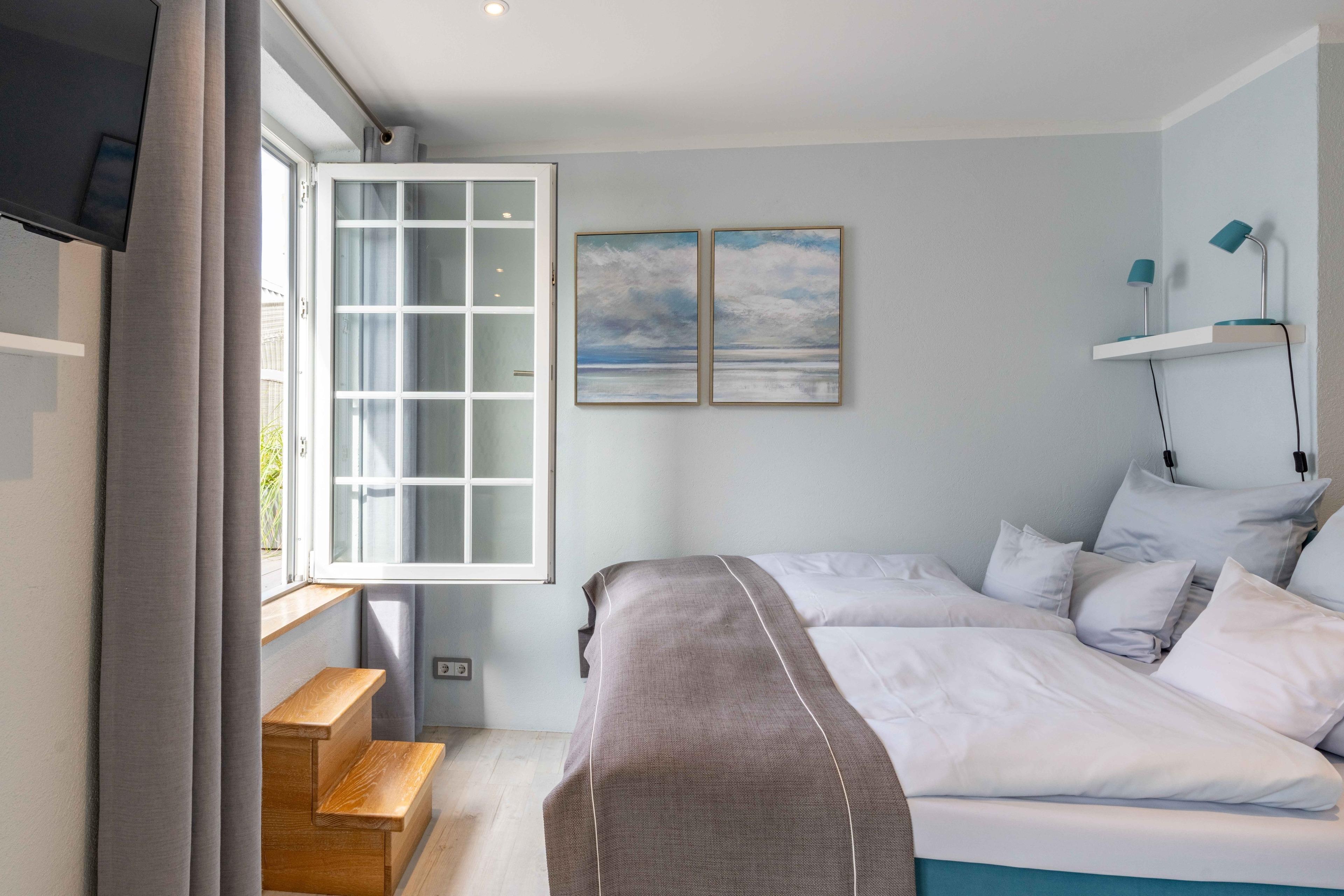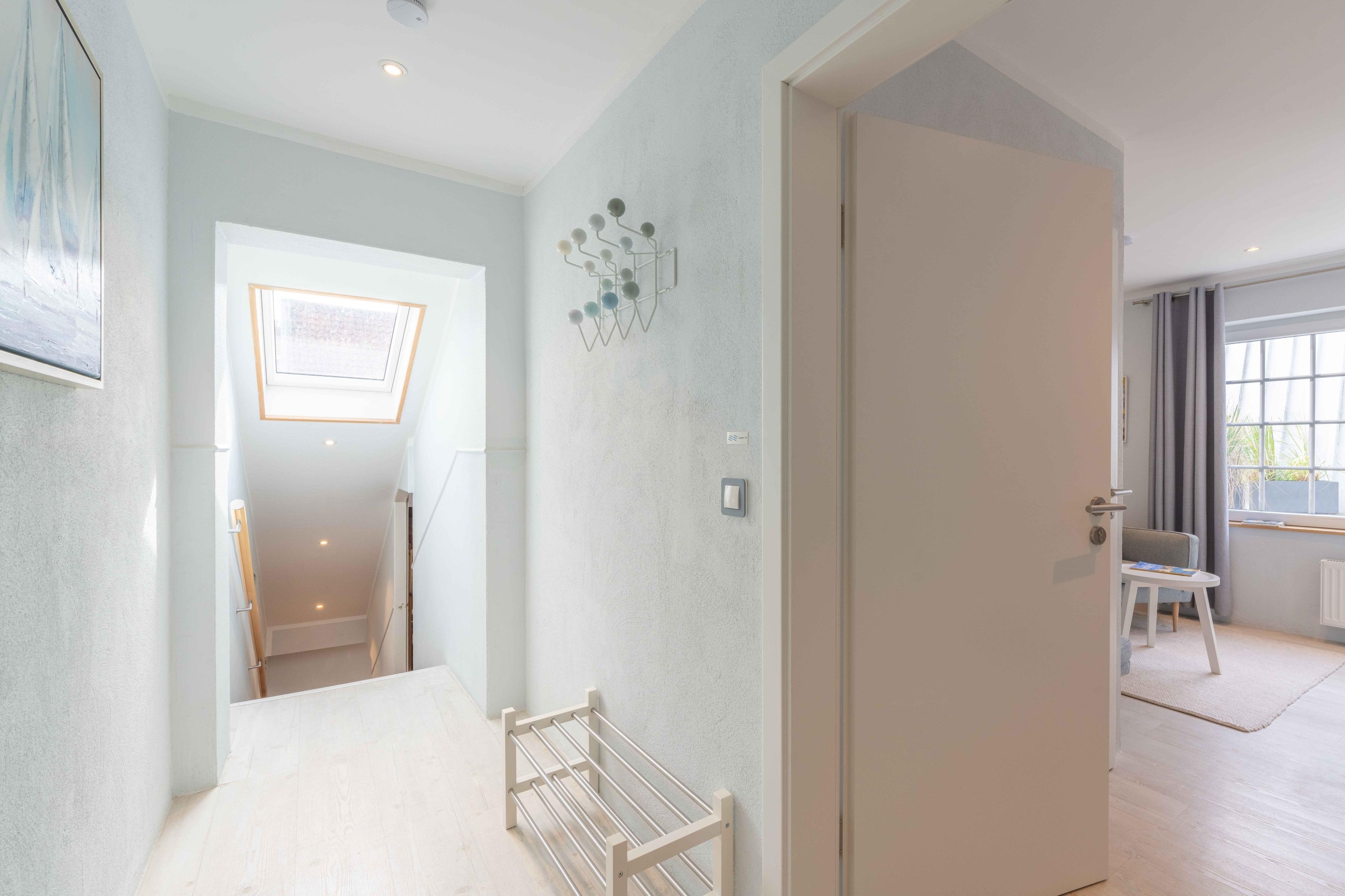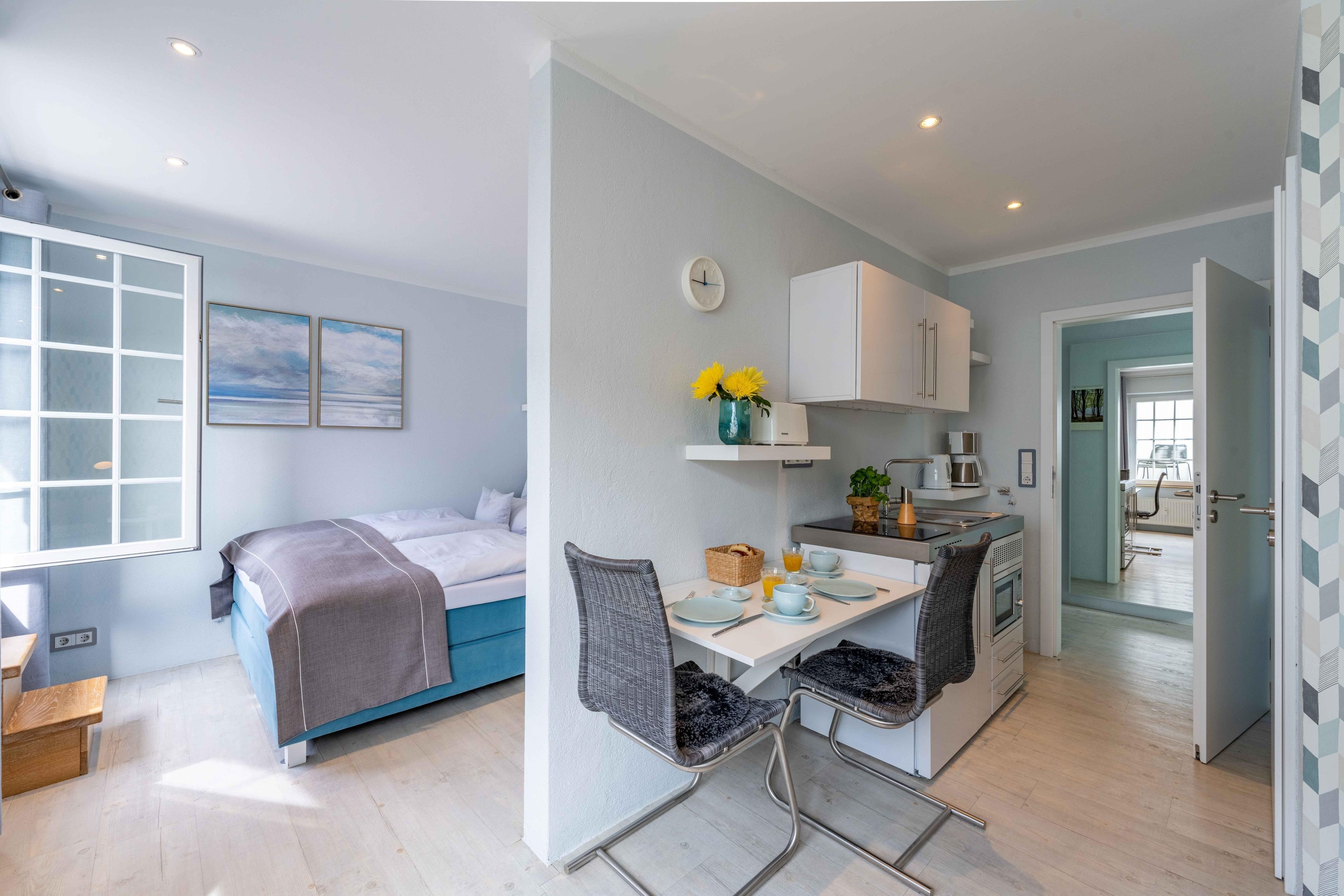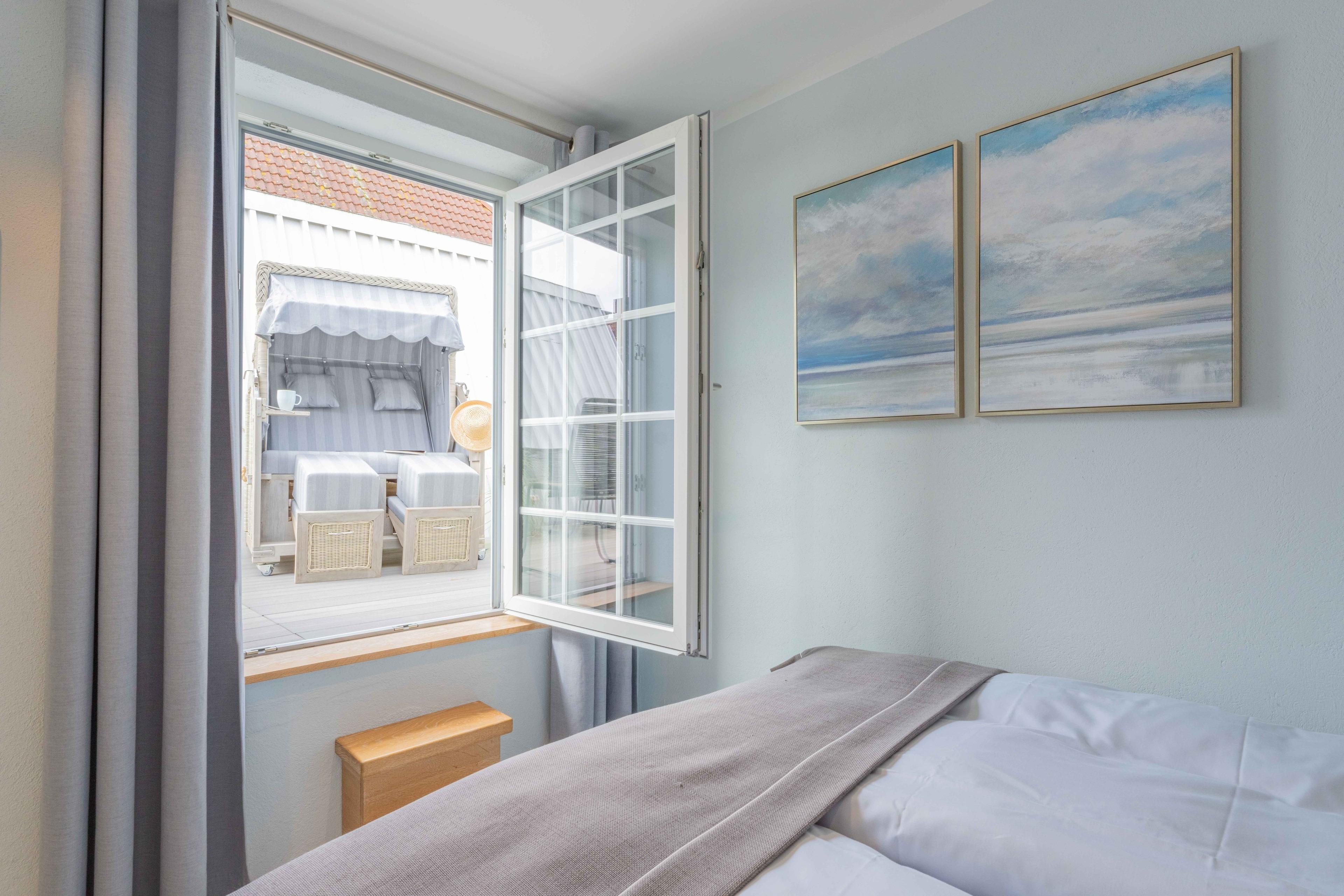Auf 4 Sterne-Niveau und im norddeutschen Design wurde ein schönes und neues Apartment auf 47 m2 eingerichtet. 18 m2 davon gehören zu einer eigenen Dachterrasse. Das Apartment besitzt ein neues Bad mit WC, Dusche mit bodennahem Eintritt, einem Waschbecken mit Ablage, Wandhaken und Ablagefläche für Kosmetikutensilien. Außerdem stehen je 2 Handtücher, 2 Duschtücher sowie 2 Bademäntel, eine Badematte sowie ein Föhn zur Verfügung. Im Wohnbereich befinden sich am Eingang eine Garderobe und ein Ganzkörperspiegel. Die Pantryküche besteht aus Kühlschrank, Kochceranfeld, Mikrowelle und Kaffeemaschine, Toaster und Wasserkocher. Zur weiteren Ausstattung gehören Esstisch, Wandklapptisch, 2 komfortable Sesselstühle, ein HD TV und WLAN, ein Boxspringbett (1,60x2,00m) mit Superiortopper und zwei Leselampen + Ablage im Schlafbereich. Das Highlight ist eine eigene Dachterrasse, auf der man sich "weit weg vom Alltag - nur den Wolken und Möwen ganz nah" fühlt. Hier stehen Strandkorb, Lounge Chair und eine Essecke bereit. Im Innenhof mit mehreren Sitzecken warten zudem Strandkorb und Grill. Eine sichere abschließbare Fahrradunterstellmöglichkeit ist vorhanden. Parkgarage nach Verfügbarkeit.