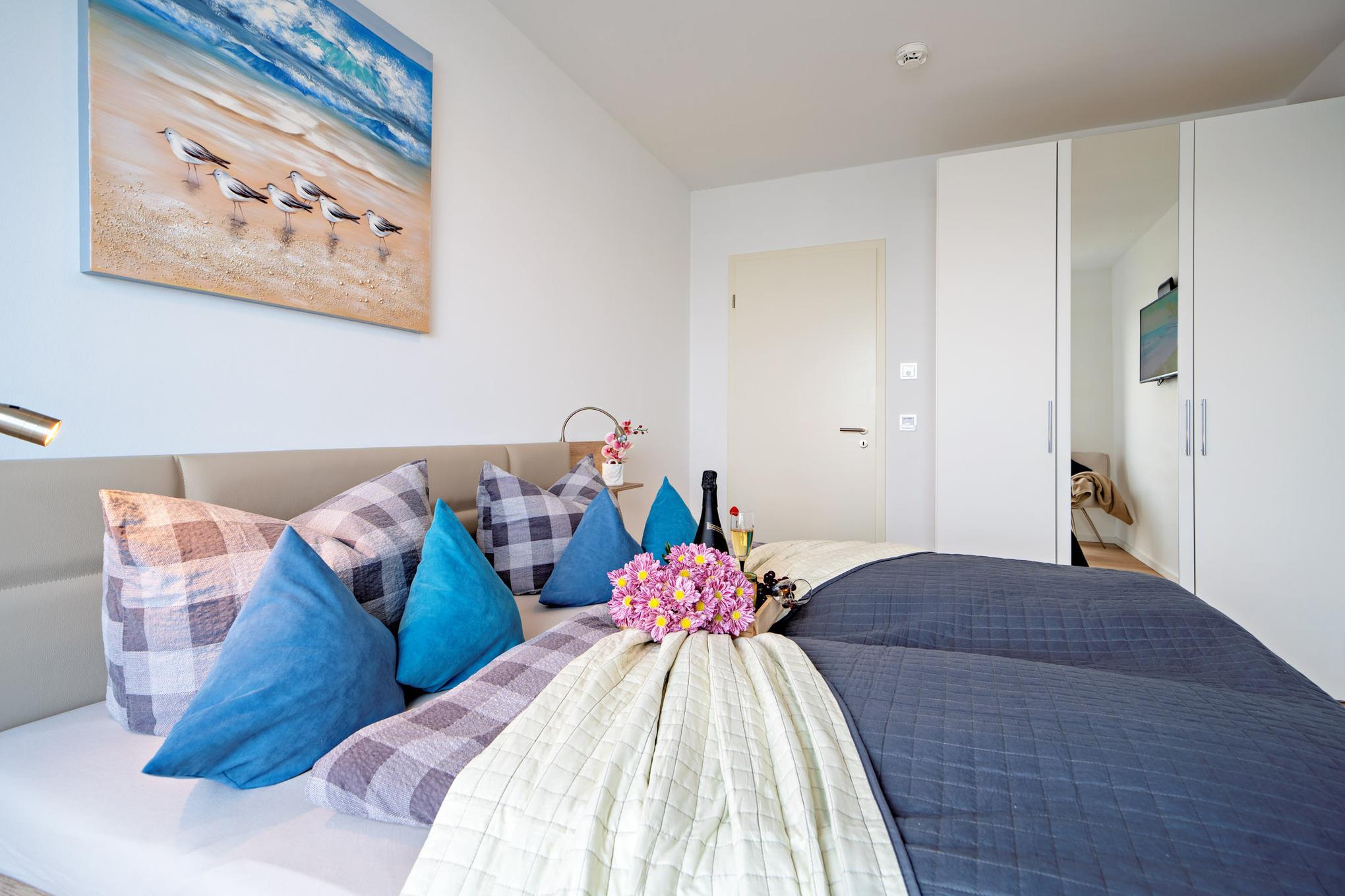 Bei dieser Wohnung sind spektakuläre Sonnenlichtspiele durch die zwei Balkone in Süd- und Nordausrichtung zu erwarten. Der Einrichtungsstil entspricht der exklusiven Lage der Ferienwohnung: Landhausstil gepaart mit klaren Farben und Formen versprechen Ruhe und Rückzug, während einzelne Farbakzente für erfrischende Leichtigkeit sorgen.