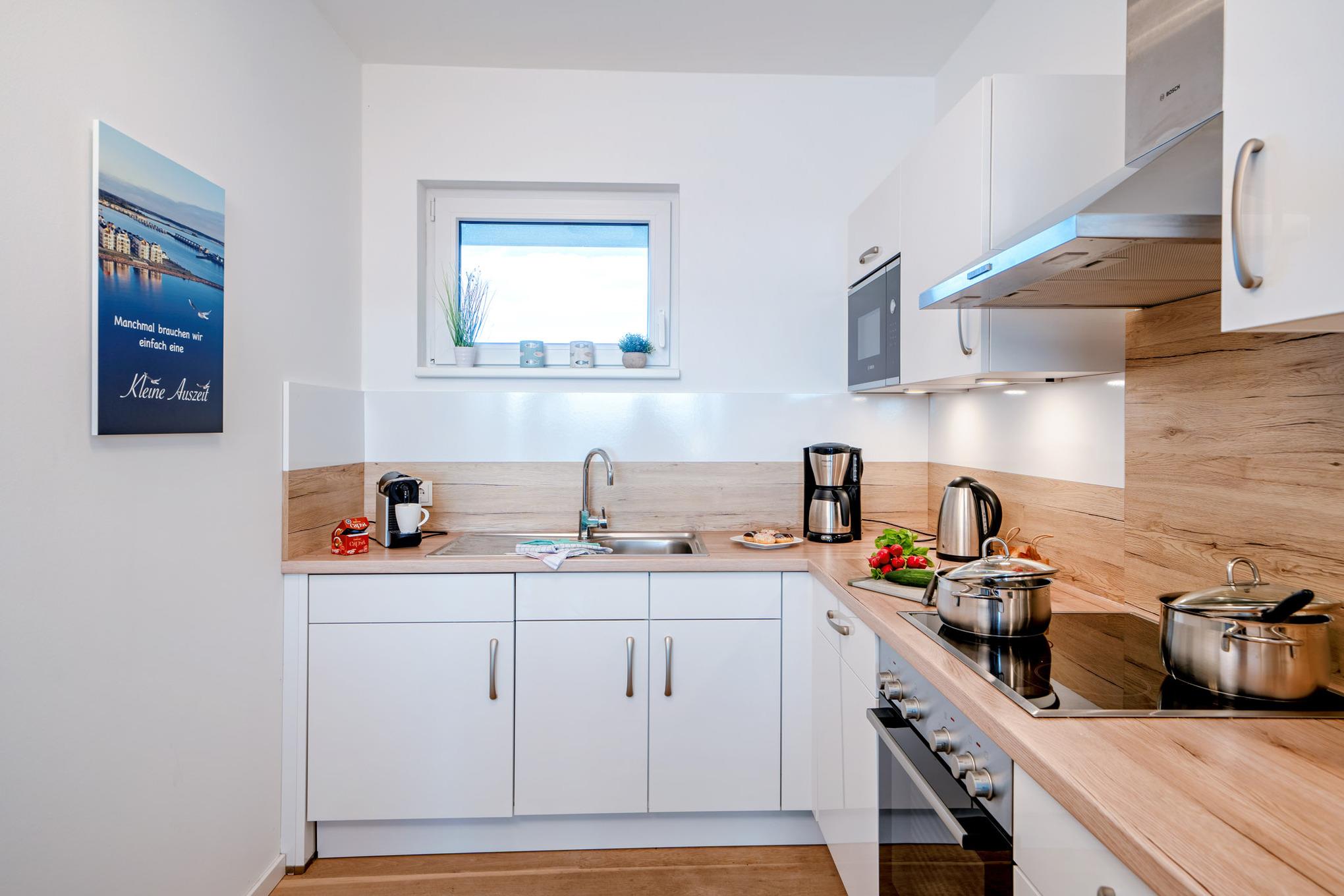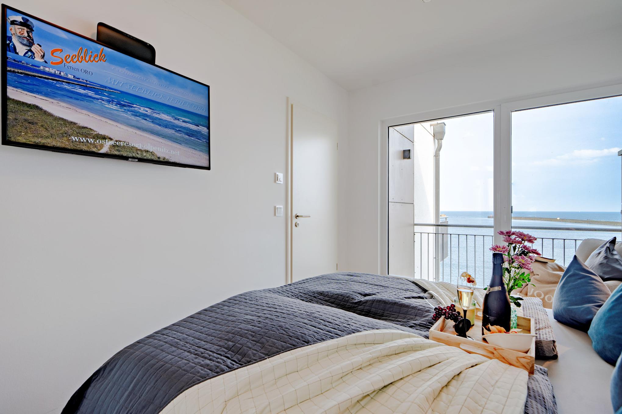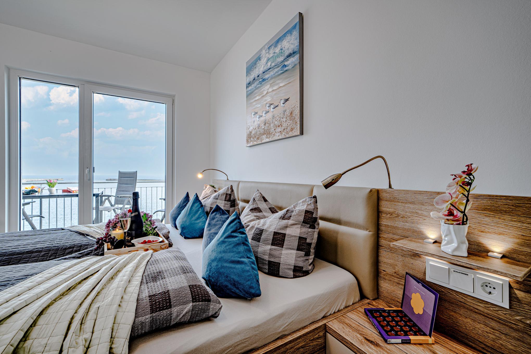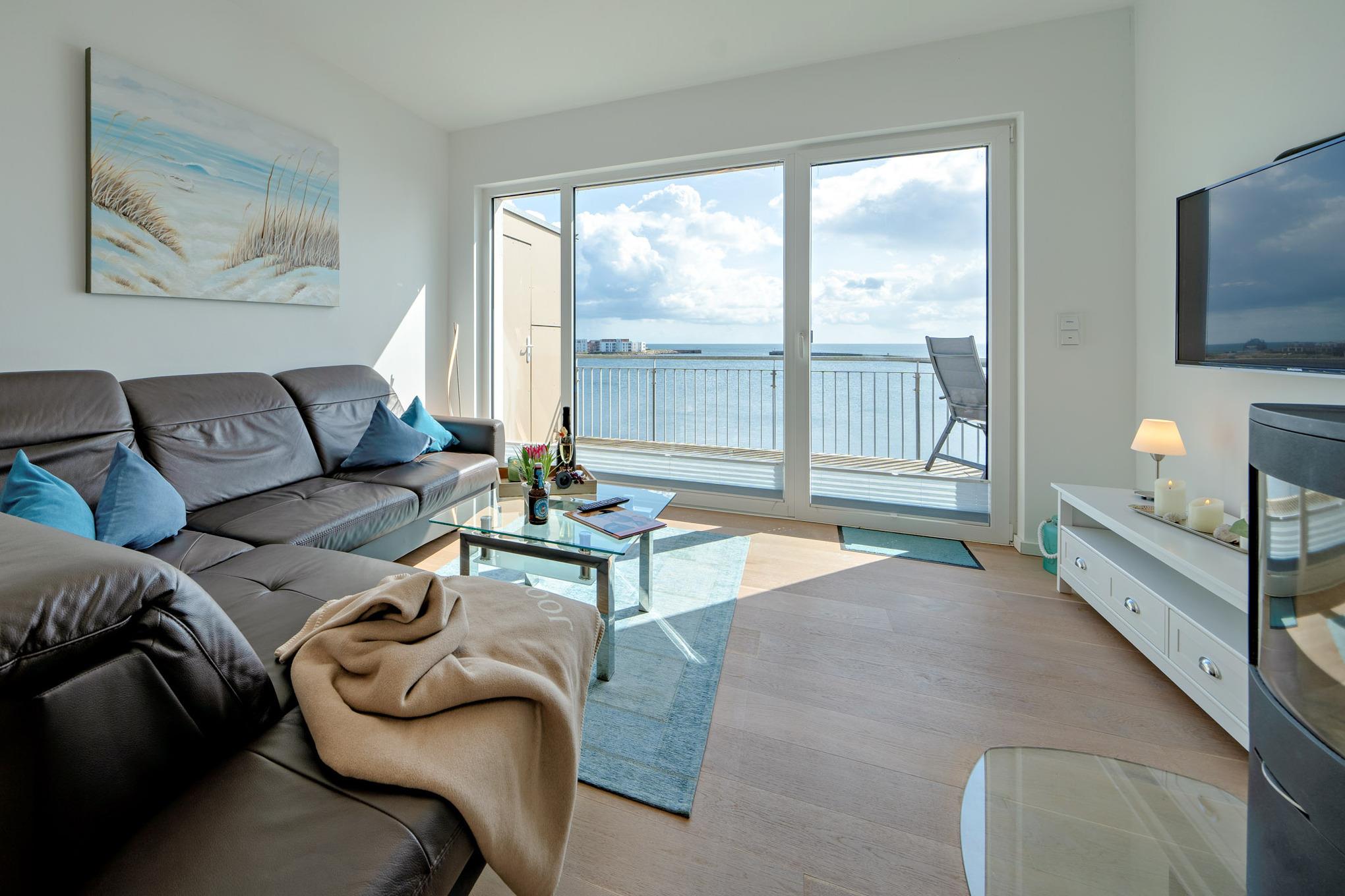 Im Fokus steht aber der perfekt umgesetzte lichtdurchflutete Wohn- und Essbereich mit Holz befeuertem Kaminofen, bodentiefen Panoramafenstern, welcher loftartig gestaltet ist, sodass alle Räume fließend ineinander übergehen und sich der Wohnbereich mit der Natur verbindet. Die Integration der offenen Küche mit hervorragender Ausstattung und funktionalem Design, steht dem gemütlichen Beisammensein auch beim Zubereiten von allerlei Köstlichkeiten nichts im Wege. Die Wasserkulisse vor dem Essbereich mit 180 Grad Panoramablick auf den gesamten Hafen und die Ostsee ist hierbei zum Greifen nah – das ist Ostseeflair. Den zweiten Nordbalkon (ca. 8m²) betritt man über den Wohnbereich, hier können es sich unsere Gäste auf einer zusätzlichen Bestuhlung gemütlich machen und bei einem Sundowner mit Abendsonne den Tag ausklingen lassen.