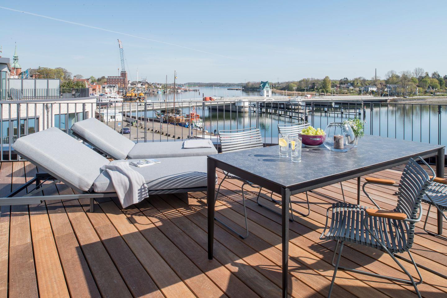 Genießen Sie den einzigartigen Schleiblick auf der großzügigen Dachterrasse, die mit bequemen Gartenmöbeln, Elektrogrill und Sonnenliegen ausgestattet ist.