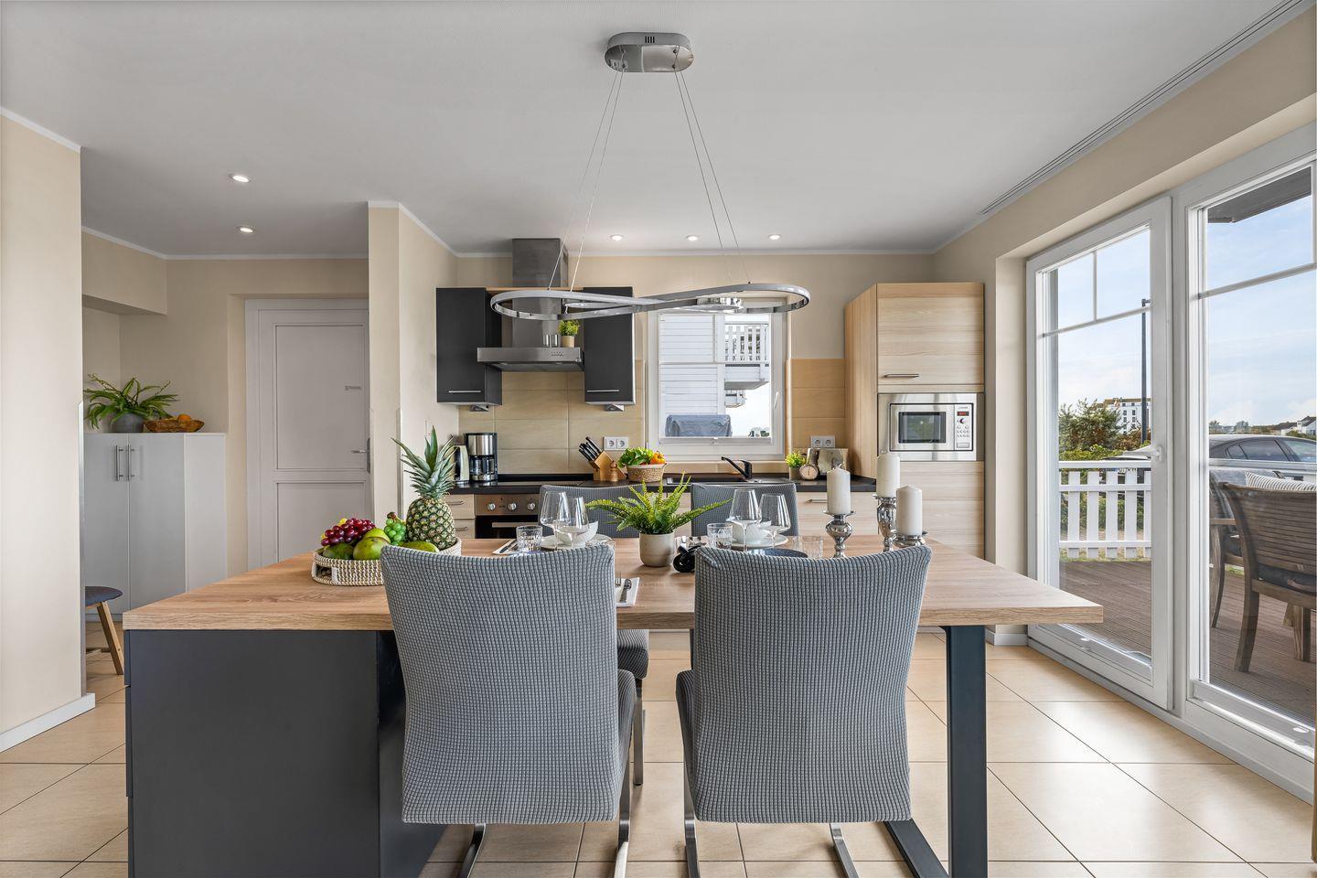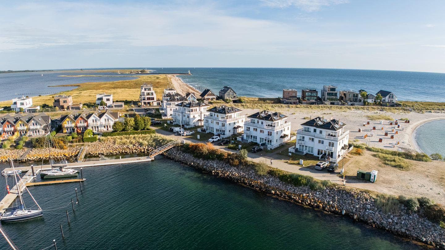 Das Herzstück von Marina Sands ist der helle Wohn- und Essbereich im Erdgeschoss. Durch bodentiefe Fenster fällt der Blick ungehindert auf das türkisblaue Wasser der Marina. Das gemütliche Sofa lädt zu entspannten Stunden ein. Ob mit einem guten Buch, bei einem Film oder einfach beim Beobachten der vorbeiziehenden Segelboote. Von hier aus treten Sie direkt auf die Terrasse, die mit ihrem maritimem Fair für ausgiebige Genussmomente sorgt. Ein Frühstück mit Sand unter den Füßen oder ein Glas Wein beim Abendlicht. Beides ist hier nur ein paar Schritte entfernt.