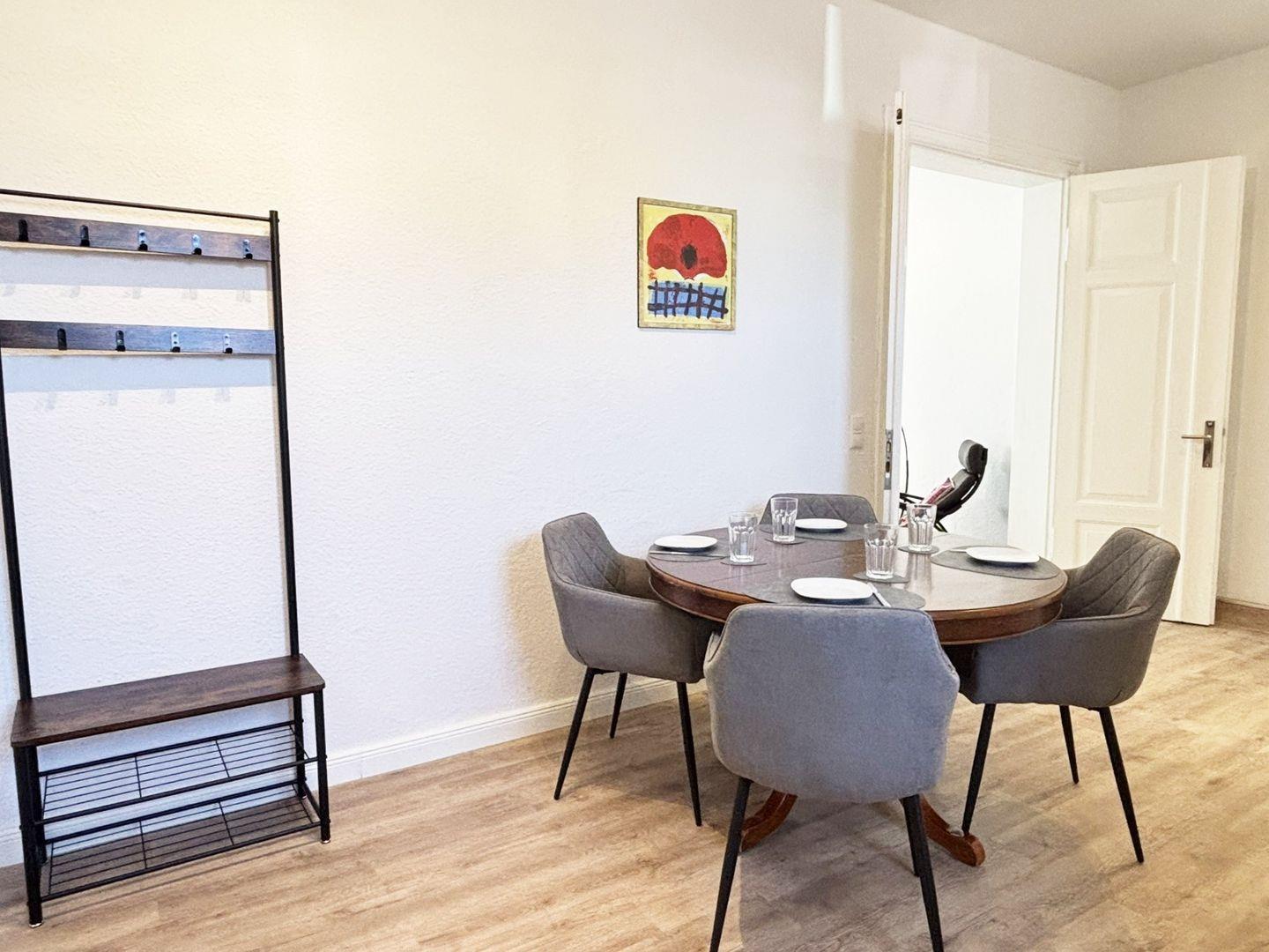 Der Essbereich mit angrenzender Küche ist funktional und modern gestaltet. Hier finden Sie einen Esstisch mit vier Stühlen sowie eine gut ausgestattete Küchenzeile mit Cerankochfeld, Backofen, Mikrowelle, Kühlschrank mit Gefrierfach, Filterkaffeemaschine, Padmaschine, Wasserkocher und Toaster – perfekt für eine komfortable Selbstverpflegung.