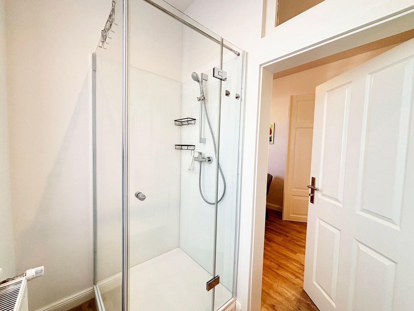 Das Badezimmer verfügt über eine Dusche mit einem niedrigen Einstieg von 10 cm, ein WC, ein Waschbecken mit Spiegel, ein Fenster für Tageslicht sowie einen Haartrockner. Für zusätzlichen Komfort stehen ein Bügeleisen, ein Bügelbrett, ein Staubsauger und ein Ganzkörperspiegel zur Verfügung.