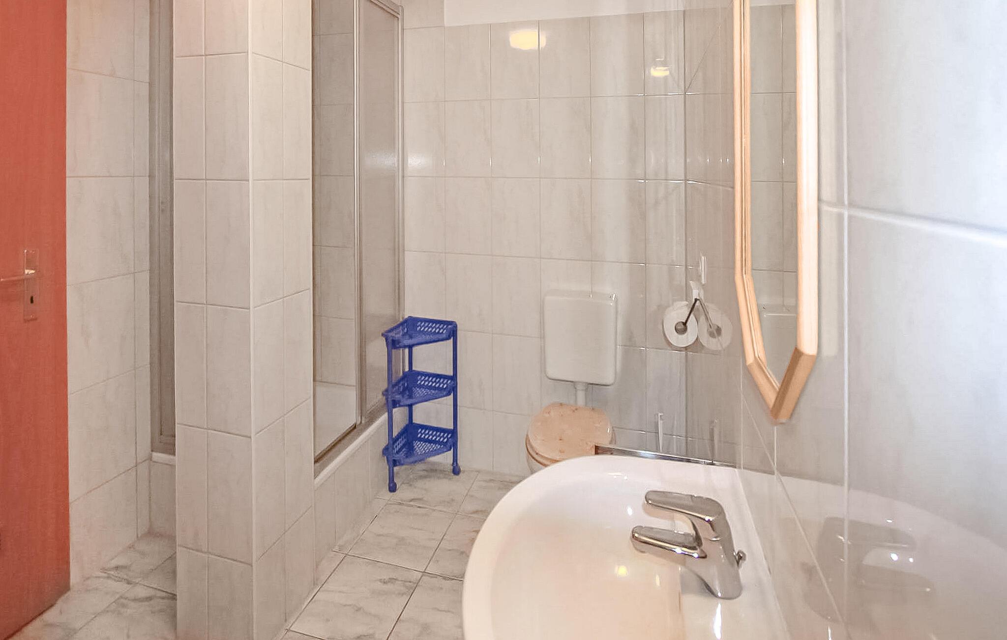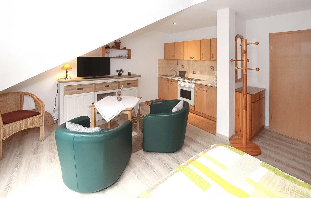 De fem ferielejligheder ligger på øverste etage i et bolig- og erhvervsbyggeri med en central beliggenhed, cirka 500 m fra Østersøstranden. Bygningerne omfatter en restaurant, et apotek og en souvenirbutik. Adgang til lejlighederne, parkeringspladser, cykelkælder og centralt udendørs opholdsområde med siddepladser og grill er til rådighed for feriegæster i et separat og afgrænset område.Den samlede pris inkluderer vand- og energiforbrug samt slutrengøring. Du skal selv medbringe sengelinned og håndklæder. Husdyr: ÉN lille hund op til en højde på 30 cm er tilladt i denne ejendom. Denne lejlighed har en størrelse på ca 20 kvadratmeter og er til 2 personer. egnet . Den har en kombineret stue/soveværelse (polstret opholdsområde med sovesofa, dobbeltseng, satellit-tv, radio), tekøkken med el-komfur, bruser/toilet, centralvarme. Karlshagen er et feriested ved Østersøen i den nordlige del af øen Usedom. Restauranter, butikker, lystbådehavn med fragtmuligheder og cykelstier ligger i byen. Ridestald, tennis og bowlingbane ca 2,5 km. Stedet har en smuk sandstrand.