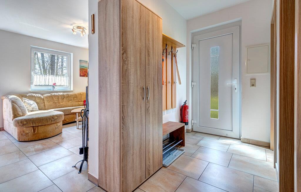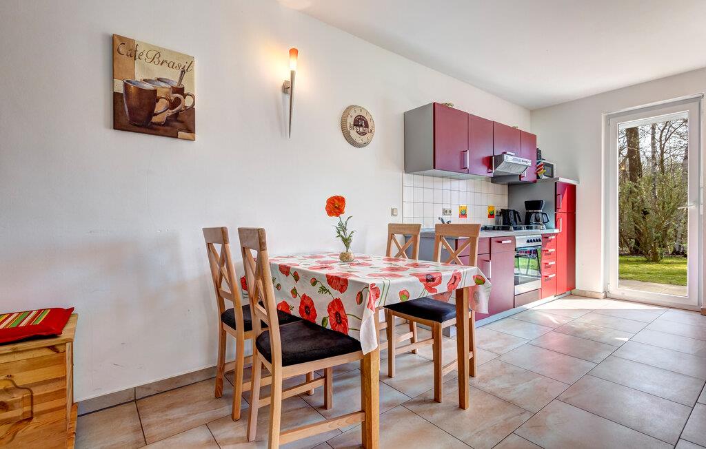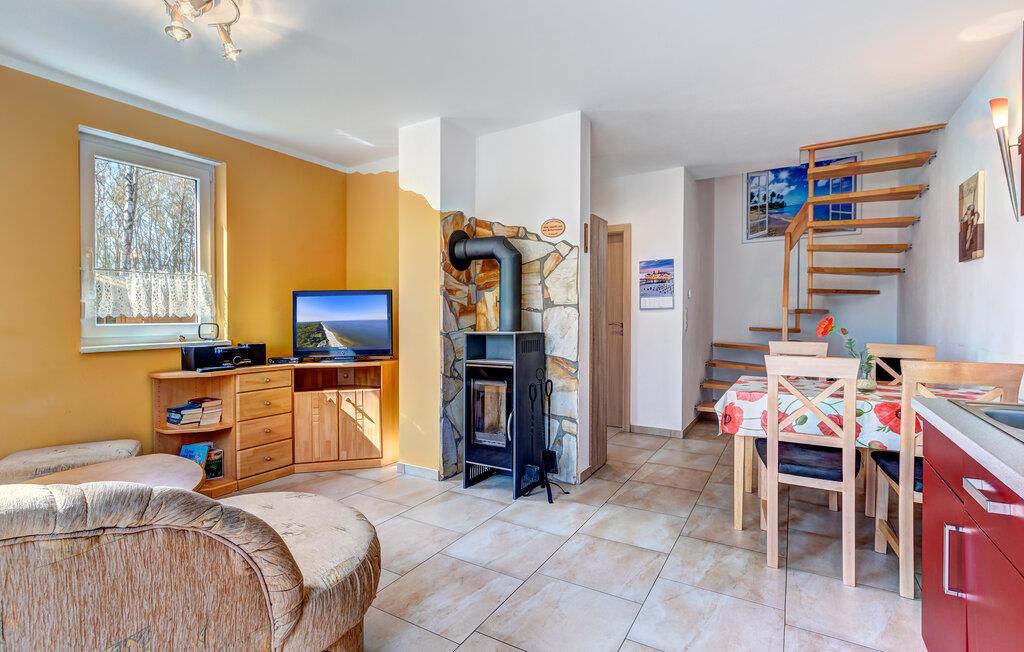 Der er tale om den ene af to ferielejligheder beliggende i et sommerhus på en 650 kvadratmeter separat fritidsejendom i en lille sommerhusbebyggelse i udkanten af by og skov. Der er ca. 1,2 km til Østersøen (i luftlinje) og ca. 1,6 km til stranden (korteste rute). Ferielejligheden har stue/spisestue (polstrede møbler med sovefunktion (mulighed for ekstra opredning til to personer)), spisebord, LCD TV, stereoanlæg og pejs. Der er et åbent tekøkken (komplet med opvaskemaskine, elektrisk ovn, køleskab, fryser og mikroovn), 2 soveværelser ovenpå (1 x dobbeltseng og LCD TV/DVD, 1 x 2 senge, ekstra barneseng), et badeværelse med bruser/toilet på øverste etage, et gæstetoilet i stueplan og centralvarme. Lejligheden har en møbleret terrasse, aflåselig cykelkælder, høj stol, grill og 2 parkeringspladser. Alt efter vejret er internet (WLAN) kun tilgængeligt i begrænset omfang via WLAN Giga-Cube. Der er også et lille saunahus på ejendommen mod betaling. Den samlede pris inkluderer: vand, energiforbrug, slutrengøring. Sengelinned/håndklæder kan medbringes eller lejes. Rygning er kun tilladt udendørs. Østersøferiestedet Karlshagen opkræver en turistskat, som opkræves via ejendomsadministrationen. Karlshagen i den nordlige del af øen Usedom udviklede sig til et Østersøresort for kun få år siden. På den ene side har den en meget smuk, bred sandstrand ved Østersøen og på den anden side en havn med skibstrafik på Peenestrom. Der er også forskellige restauranter og butikker i byen. Som alle andre steder på øen er her gode cykelstier. Mulighed for ridning, tennis og bowling ca. 2,5 km væk.