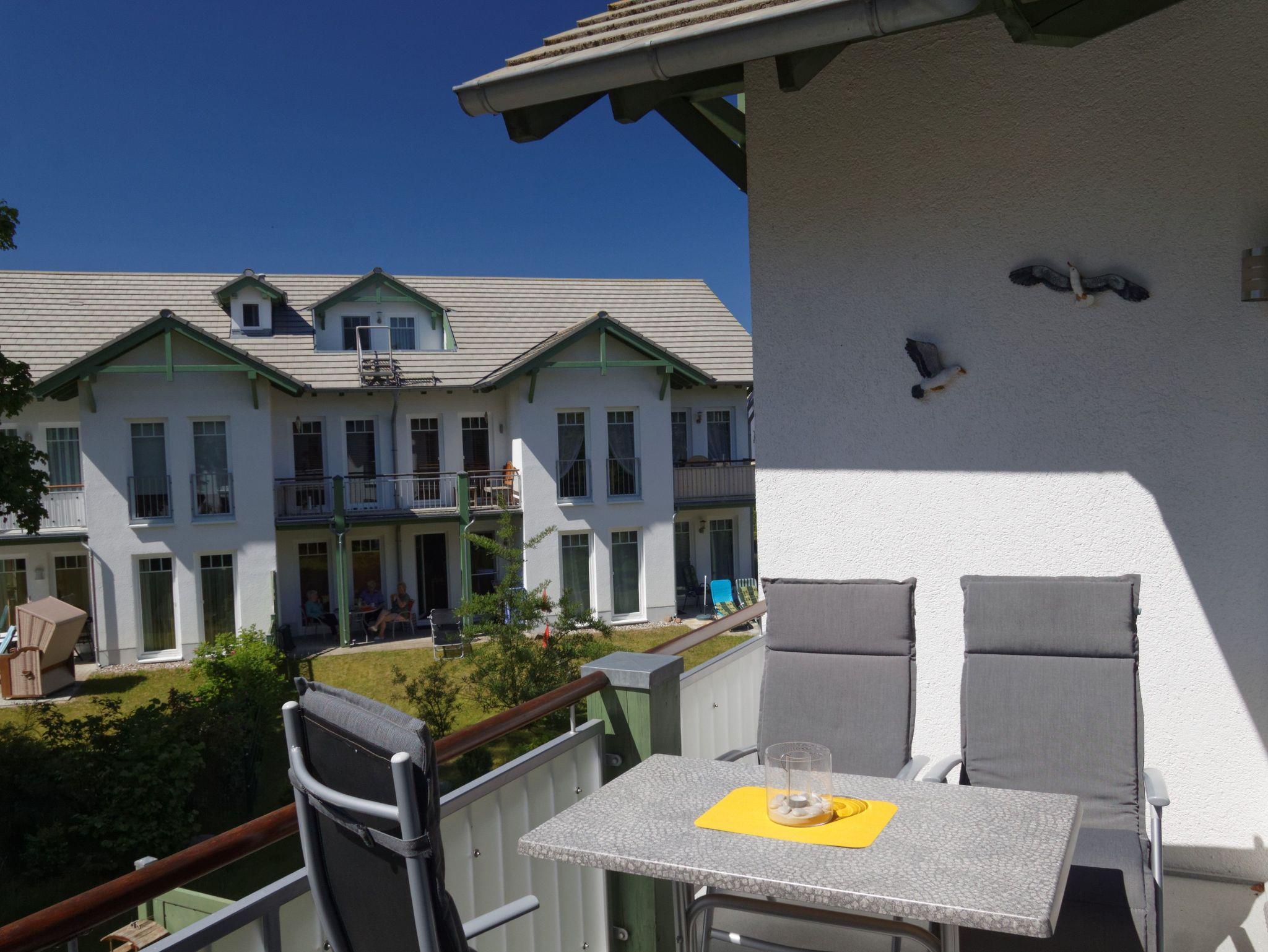 Für schöne Stunden im Freien steht Ihnen ein Balkon mit konfortablen Möbeln und Sonnenschirm bereit, ideal zum Entspannen.