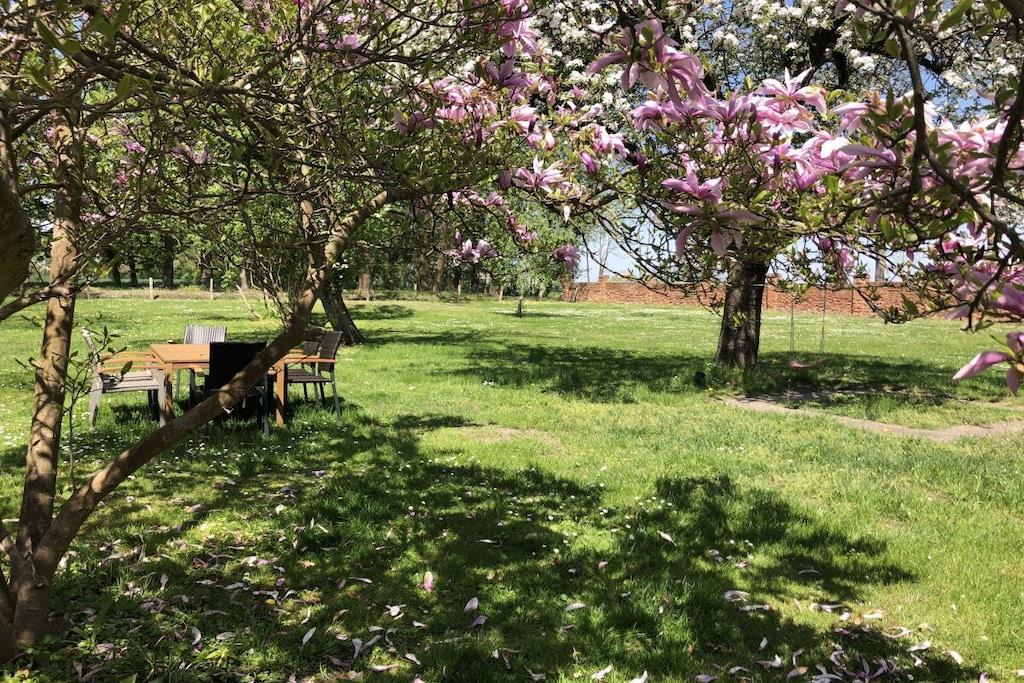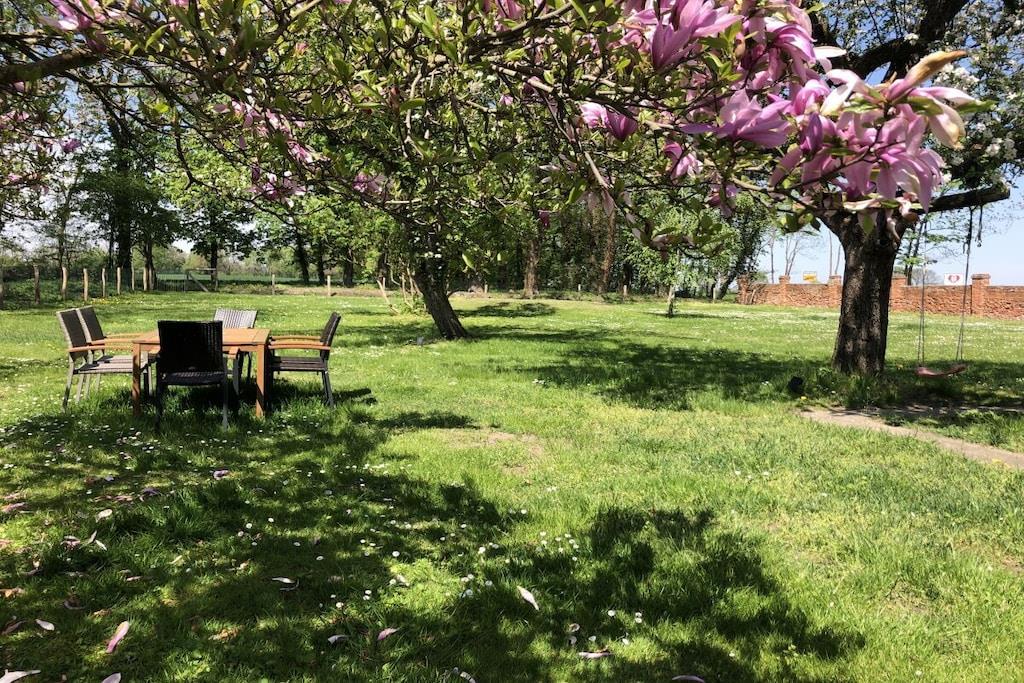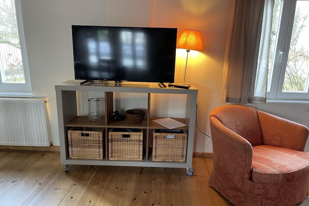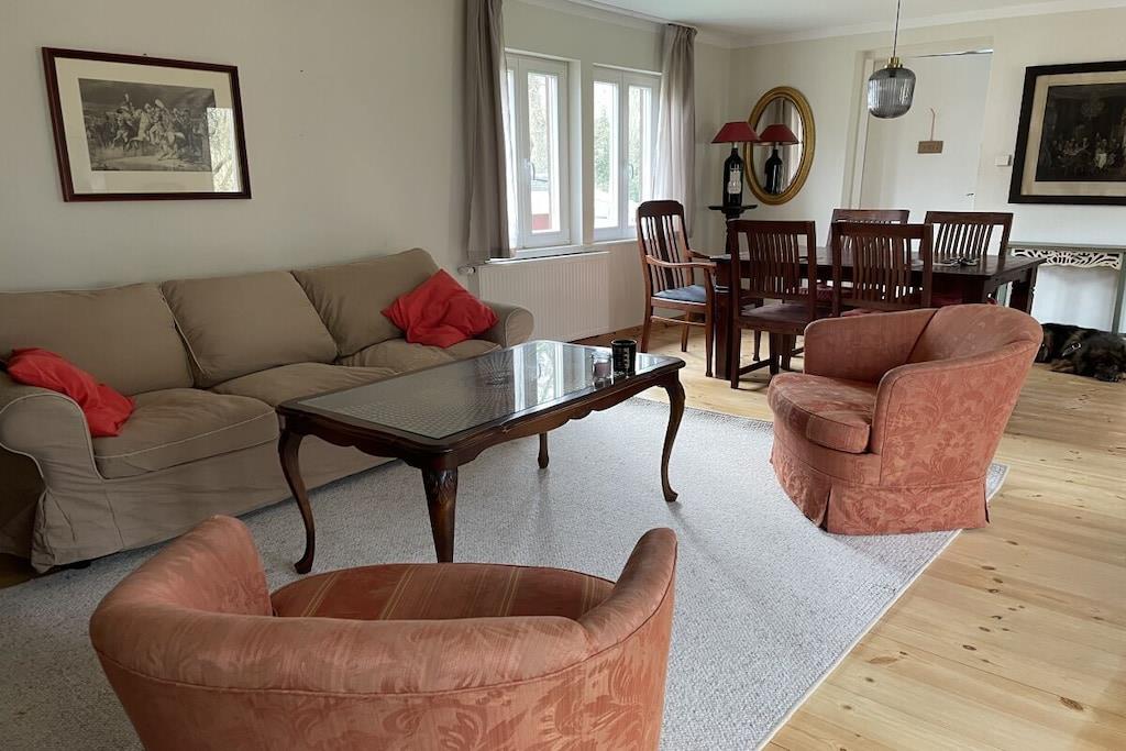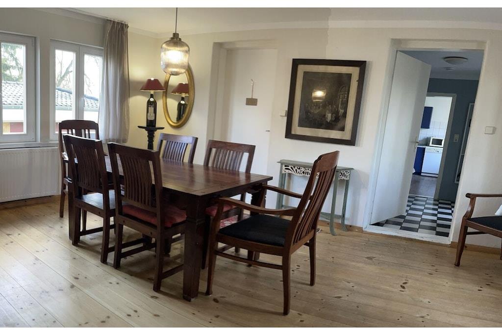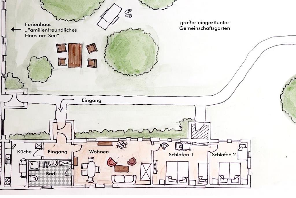 Vores feriehus (100 kvm) er særligt velegnet til børnefamilier. En stor, lukket have indbyder til at spille fodbold og løbe rundt og tilbyder masser af plads til børn og kæledyr. Den umiddelbare nærhed til et svømmeområde (100 m) ved Ruppin-søen er især tiltalende om sommeren, mens den store græsplæne i haven er perfekt til uforstyrret afslapning. Feriehuset er delvist møbleret med antikke familiemøbler. Huset har en stue/spisestue, et fuldt udstyret køkken, to soveværelser (hver med tre senge) og et badeværelse med bruser. Huset har plads til op til seks personer.