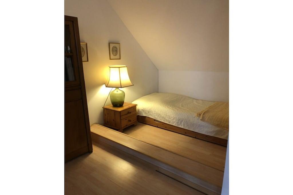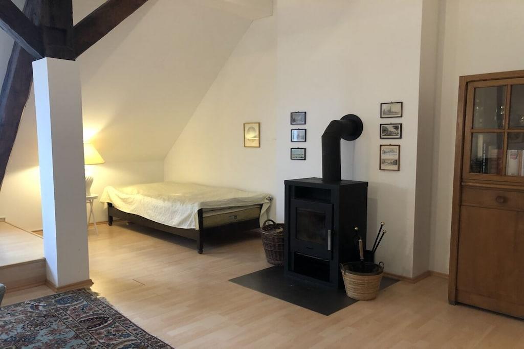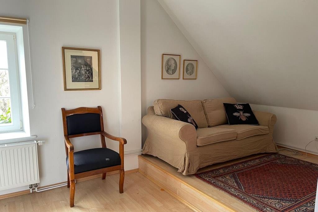 På 1. etage: (soveværelse(, , enkeltseng, dobbeltseng)) Loft: (Stue/soveværelse(, , , , enkeltseng, enkeltseng, dobbeltseng, Fjernsyn, kakkelovn, radio)) , , , åbent køkken(, tekøkken, Fjernsyn, kakkelovn, kogeplade, elkedel, brødrister, kaffemaskine, ovn, mikrobølgeovn, køleskab, fryser), badeværelse(, toilet, badekar, bruser, håndvask), Internetadgang, Internetadgang, vaskemaskine, varme, terrasse(Grill center, grill), have(havemøbler, solstole), parkering, strygejern, tørreskab