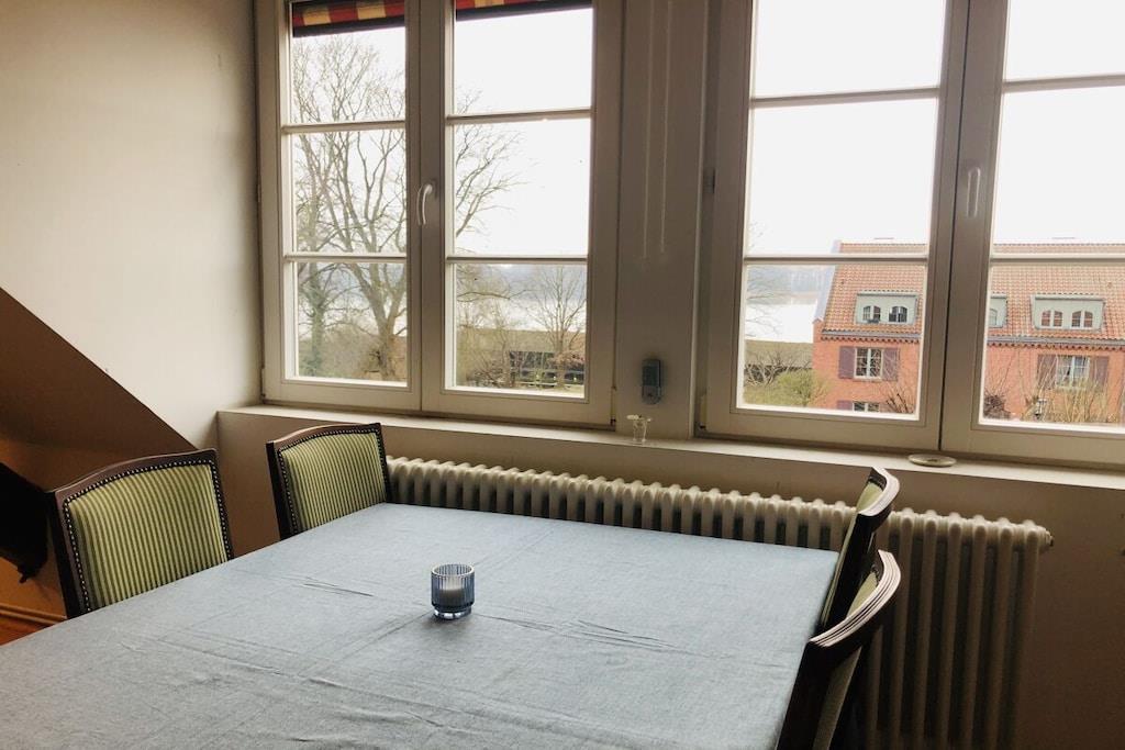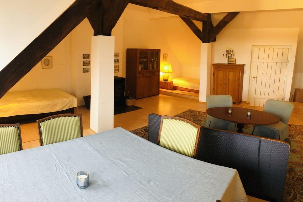 Den cirka 100 m² store "gavllejlighed" i to etager ligger på Karwer-godset, meget tæt på søen. Lejligheden har plads til op til 7 personer og er meget populær blandt børnefamilier og par, der rejser sammen med børn. Der er 3 senge i opholdsstuen ovenpå og et separat soveværelse med 2 senge på første sal. Lejligheden blev fuldstændig renoveret i 2024, inklusive installation af et nyt, fuldt udstyret køkken, og tilbyder nu betydeligt mere komfort. En privat terrasse med udsigt over Ruppin-søen er placeret foran huset.