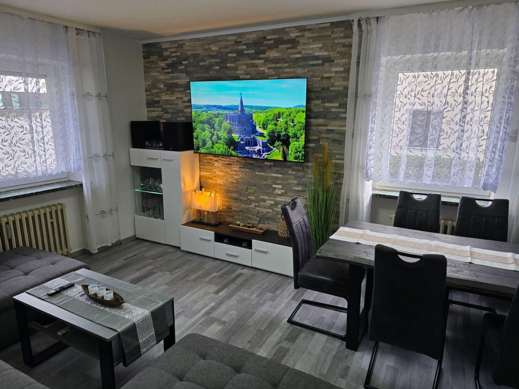 A natural stone wall in the living area creates a stylish ambience. The smart TV has numerous apps (Netflix, Amazon Prime, Disney Plus, RTL+, YouTube, etc.). The two bedrooms also have their own TV with the same apps so that there is no need to argue about the TV programme even in a large family: )
