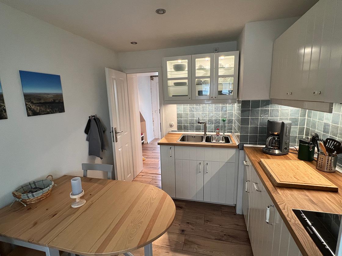 1 Küche (Induktionsherd, Backofen, Kühlschrank mit Gefrierfach, Kaffeemaschine für Filterkaffee, Toaster, Wasserkocher, Kaffeepulver, Kaffeesahne, Konfitüre, Salz, Pfeffer, Zucker, Essig und Olivenöl inkl. Geschirr, Besteck