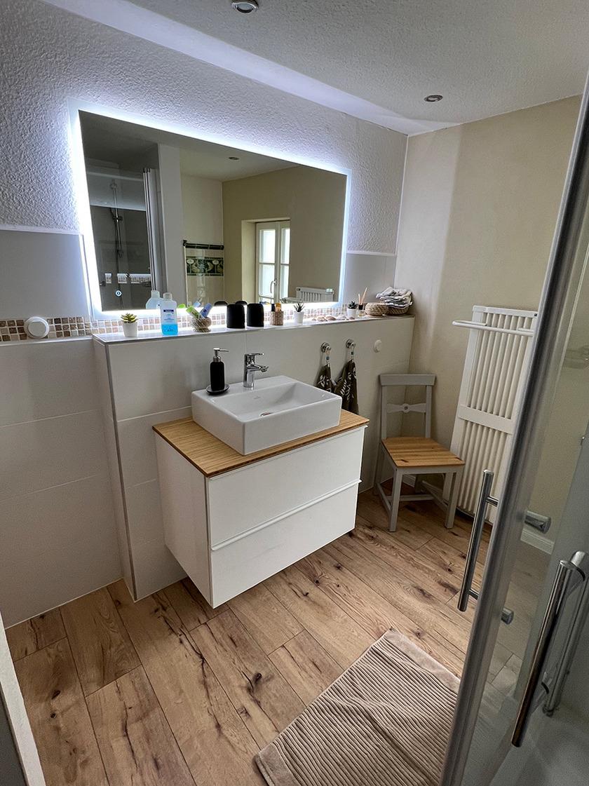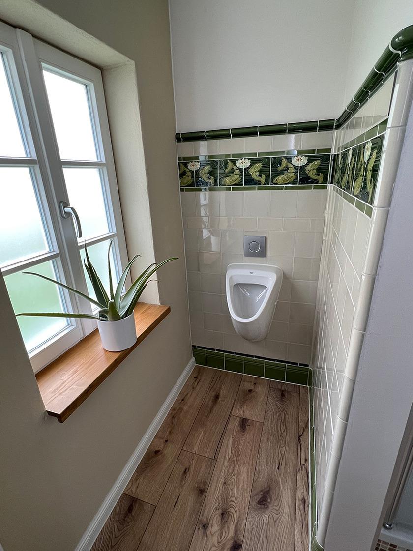 1 Bad mit WC, Urinal und Dusche (inkl. Hand- und Duschtücher, Seife). Der Bereich des Urinals ist mit alten Retro-Fliesen von Villeroy&Boch aus dem Jahr 1900 gefliest