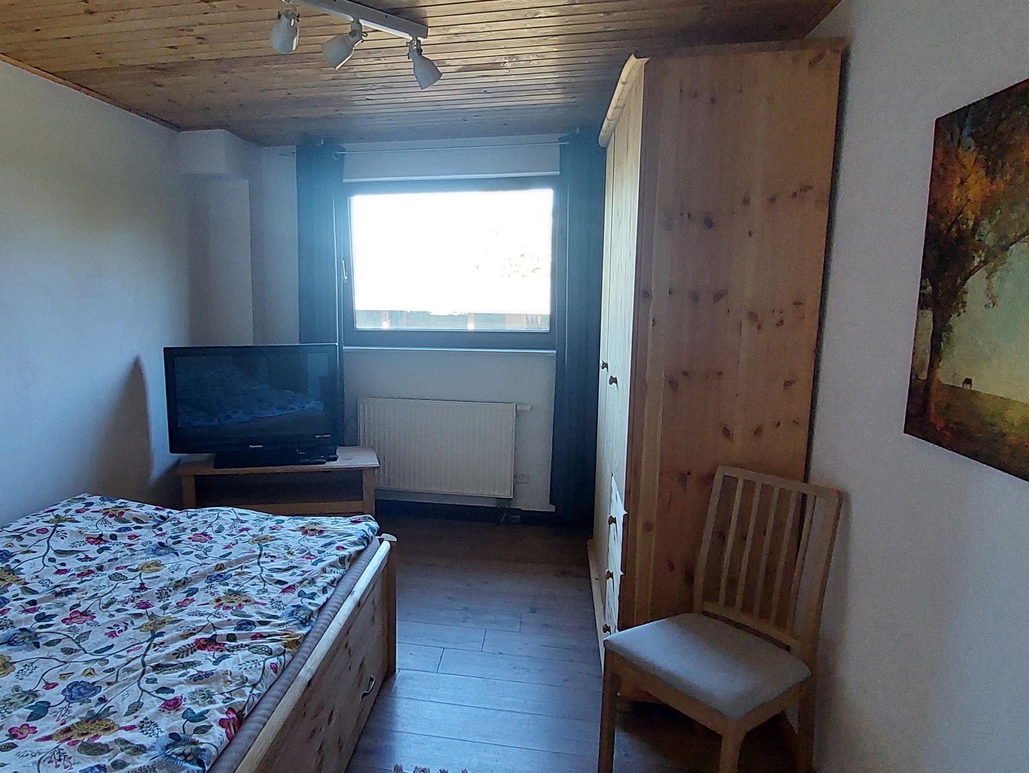 Das Doppelbett im Schlafzimmer ist 1,40m breit. Wenn gewünscht steht ein Babybett zur Verfügung. Ein großer Kleiderschrank und ein TV sind vorhanden.