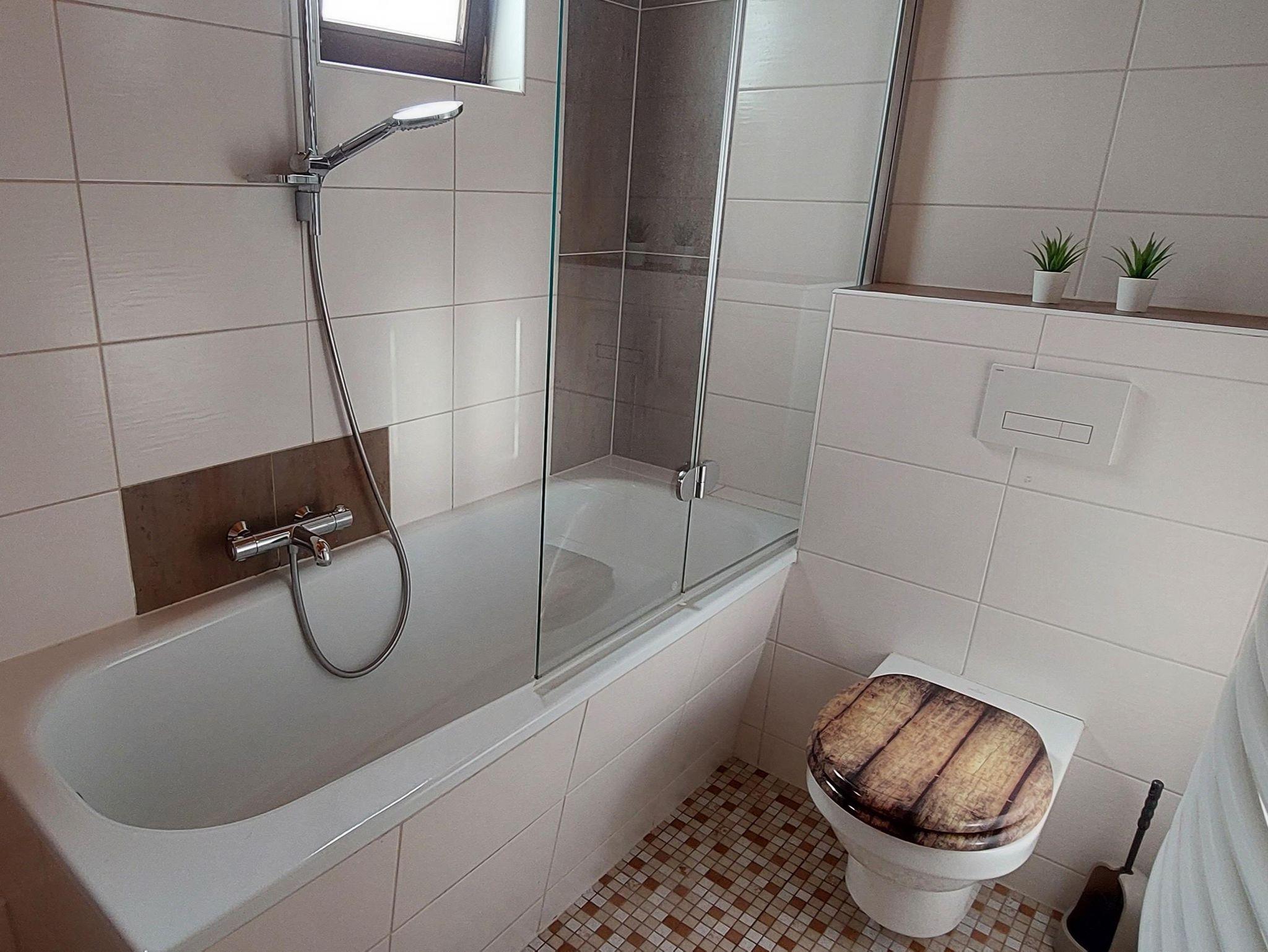 Das Badezimmer hat eine Badewanne mit Duschmöglichkeit.