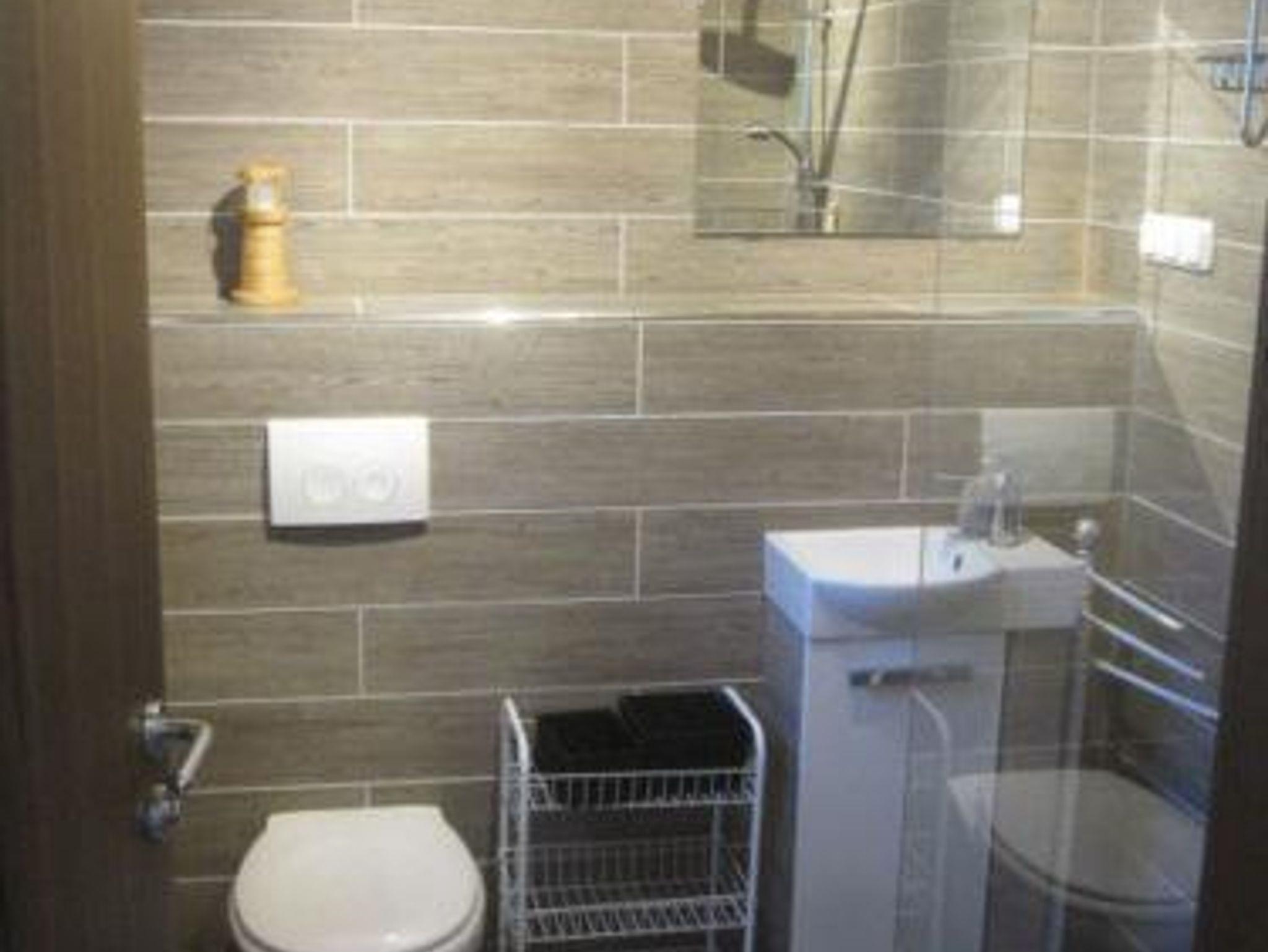 Dusche, WC, Waschbecken, Radio, Spiegel, Durchlauferhitzer und Elektroheizung
