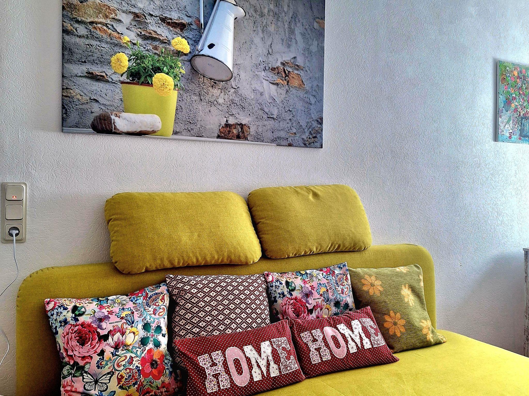 Inside, you will find a carefully furnished flat with everything you need for a comfortable stay. The bedroom can be completely darkened, guaranteeing restful nights. There is a cosy sofa bed in the living room for additional guests. Practical amenities such as a washing machine for sole use and a bathroom with shower round off the offer. Although there is no air conditioning, a fan ensures a pleasant indoor climate on hot days.