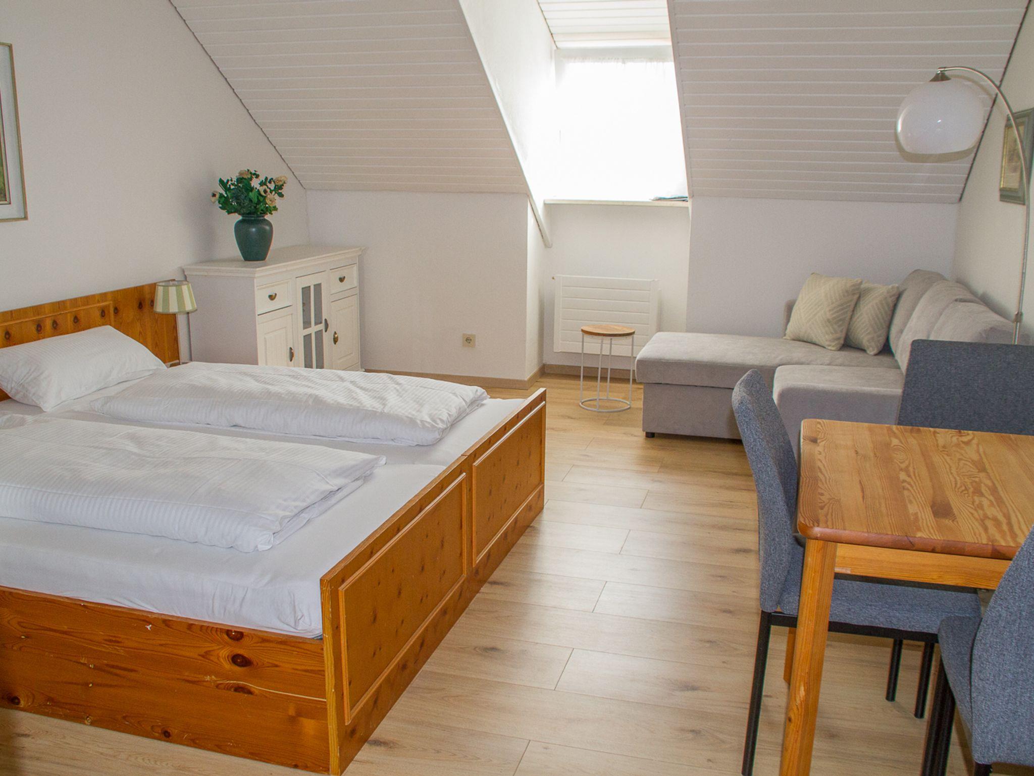 Das Apartment besticht durch eine stilvolle Einrichtung, die Komfort und Funktionalität vereint. Es verfügt über ein gemütliches Wohn-/Schlafzimmer mit einem komfortablen Doppelbett sowie einer Couch, die zu einem großen Bett umgebaut werden kann, ideal für Familien oder Freunde. Die kleine Küchenzeile ist komplett ausgestattet und lädt dazu ein, gemeinsam zu kochen und zu essen. Das helle Badezimmer mit Dusche bietet Ihnen alle Annehmlichkeiten, die Sie für einen angenehmen Aufenthalt benötigen.