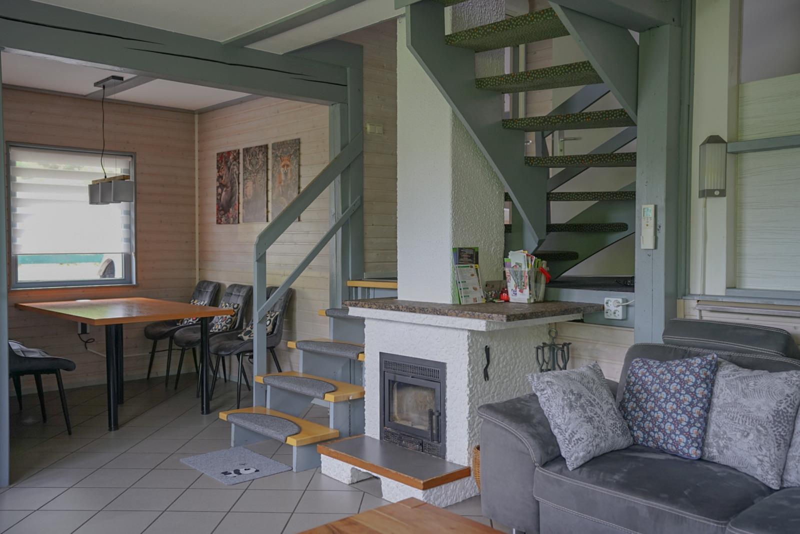 Im Erdgeschoss befindet sich der Eingang mit Windfang und Garderobe sowie der großzügige Wohnraum mit Kamin. Von dort gelangt man auf eine schöne Empore mit Küche, Bad sowie einem Gäste-WC und einem Schlafraum mit Doppelbett.