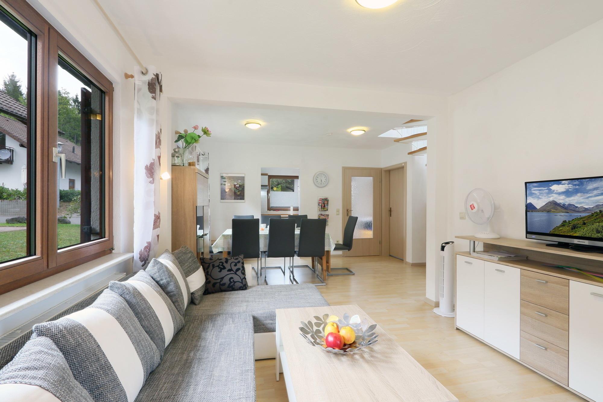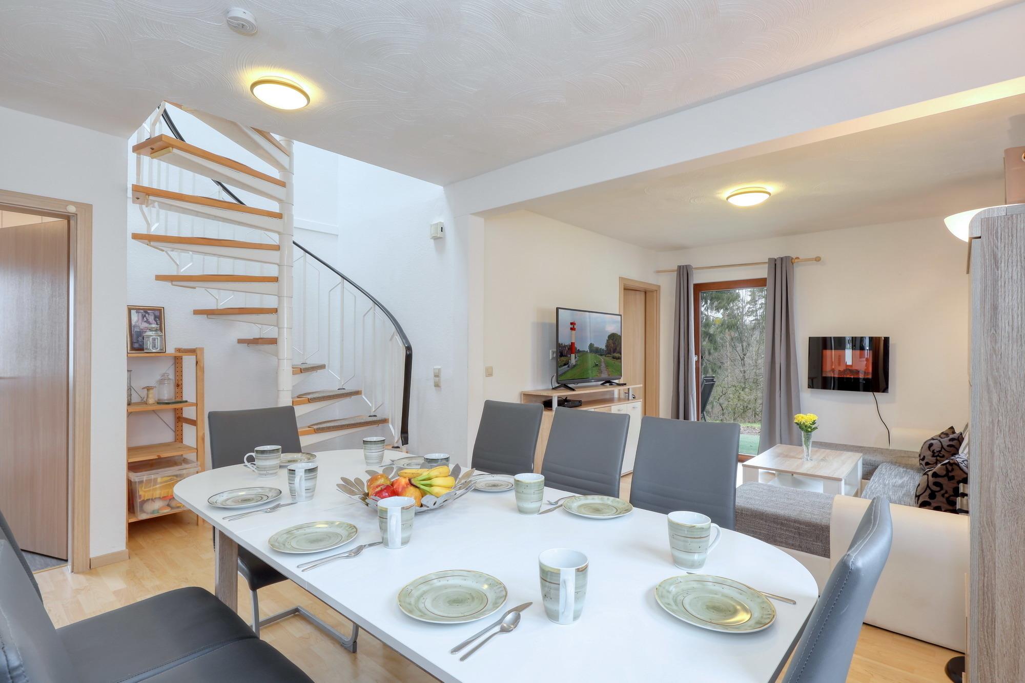 Es bietet einen großen Wohnraum mit hochwertiger Ausstattung - Großer Fernseher, DVD-Player, E-Kamin, Couch und Sessel.