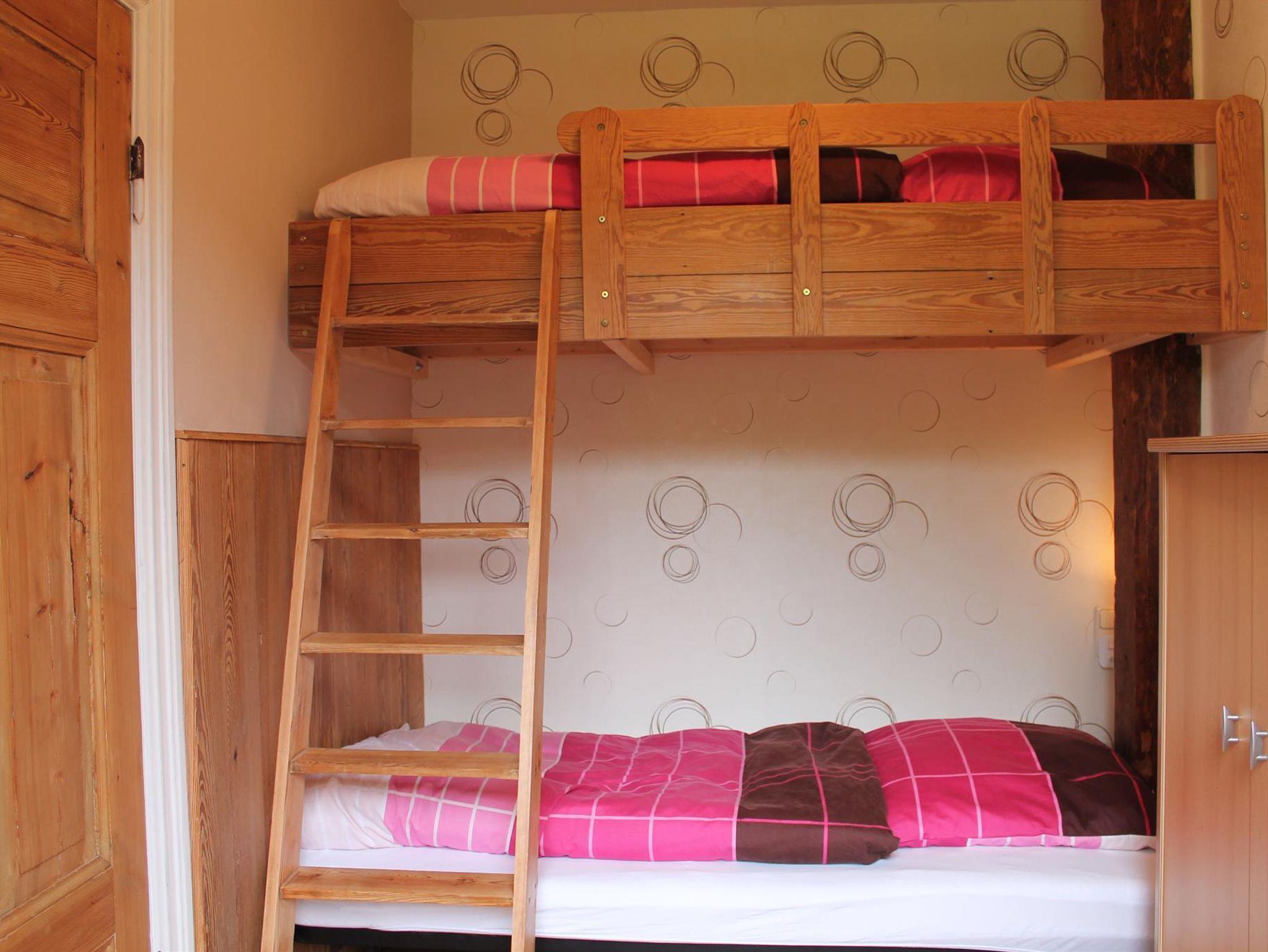 Unsere Ferienwohnung mit über 65m² Wohnfläche bietet Platz für 1-5 Personen. Das gemütliche Wohnzimmer mit Ecksofa, Sessel, moderner Flachbild-TV und Kachelofen lädt zum Verweilen ein. Die komplett ausgestattete Küche mit Backofen, Kühlschrank mit Tiefkühlfach, Geschirrspülmaschine und diverse elektrische Geräte lässt keine Wünsche offen. Die Ferienwohnung verfügt über ein Schlafzimmer mit einem Doppelbett (2,00 x 1,80 m) und ein kleines Schlafzimmer mit einem Hochbett (1,90 x 0,90m) und einem weiteren Bett (1,90 x 1,20m). Das geräumige Badezimmer mit Dusche, Badewanne, WC und Fön rundet das Gesamtbild ab. Zum Reinigen Ihrer Kleidung stehen eine Waschmaschine und ein Trockner im Haus zur Verfügung. Die Ferienwohnung ist eine Nichtraucherwohnung und ein allergikerfreundliches Haus, weswegen bei uns leider keine Haustiere unterkommen können. Verbringen Sie entspannte Abende auf unserer Außenterrasse mit Gartenstühlen und Sonnenschirm oder in der Gartenlaube mit Grill. Ihnen stehen das WLAN, einfache Fahrräder in verschiedenen Größen, ein abschließbarer Fahrradschuppen für eigene Fahrräder, Holz für den Kachelofen, eine Spielesammlung und ein großzügiger kinderfreundlicher Garten mit Kinderschaukel, Trampolin, Kinderroller und Laufrad kostenfrei zur Verfügung. Informationsmaterialien über Land und Leute sowie örtliche Aktivitäten liegen aus.