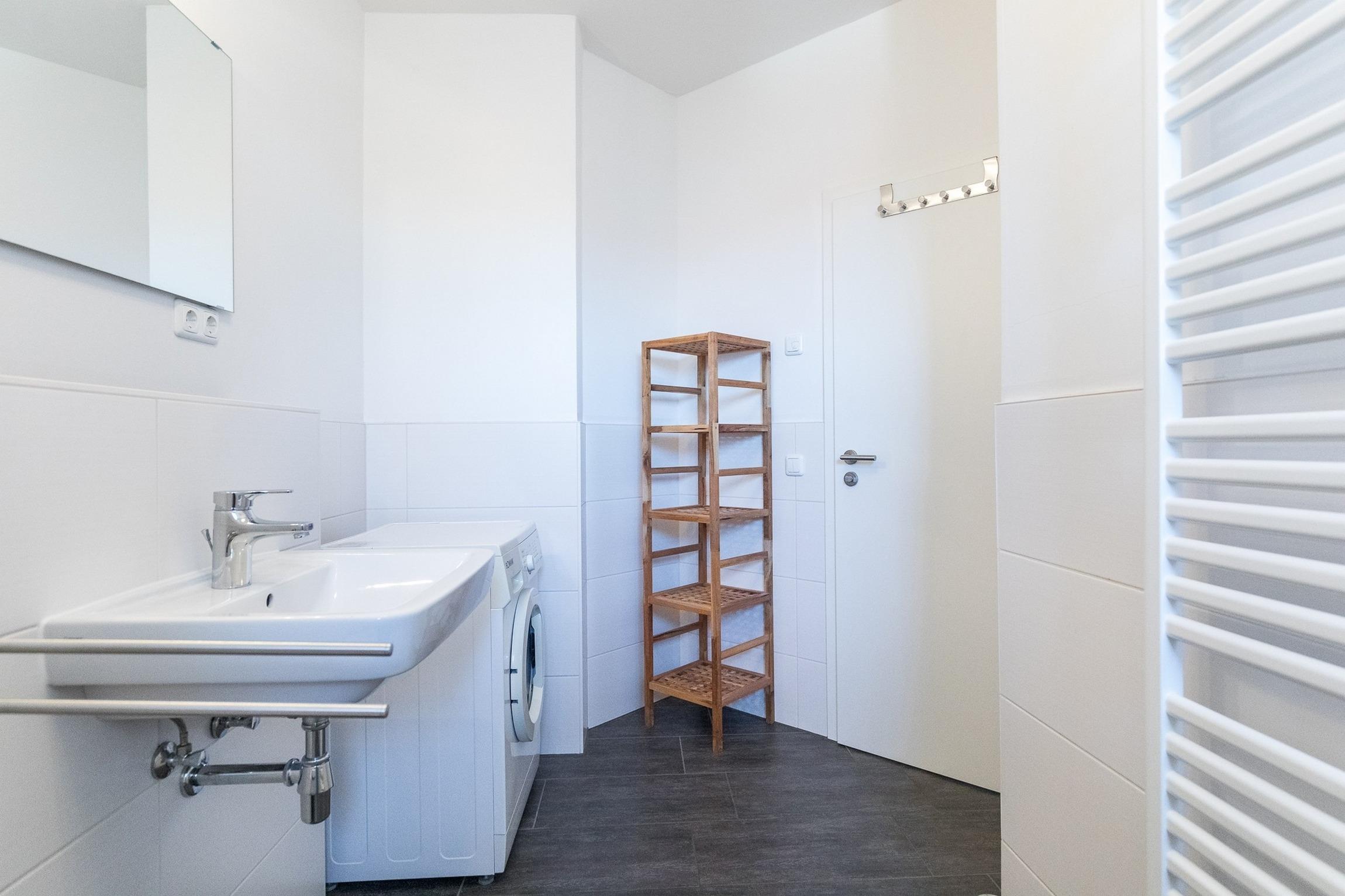 Beide Bäder sind mit Dusche/ WC ausgestattet, bieten Föhn, Kosmetikspiegel und Handtuchtrockner. Weiterhin befindet sich in einem Bad eine gebührenfreie Waschmaschine.