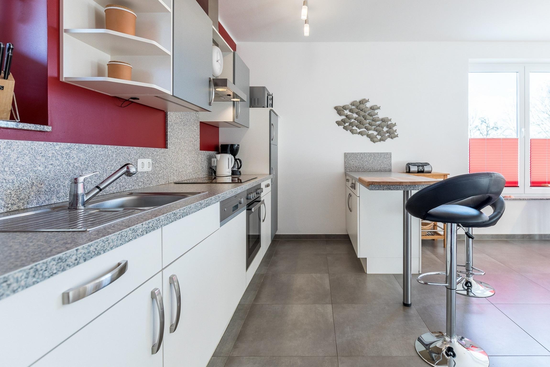 Direkt nach dem Betreten der Ferienwohnung kommen Sie in einen großen Raum, der modern ausgestatteten Küche - Wohn- und Esszimmer zugleich - in dessen Zentrum ein schöner, großer Esstisch steht, an dem Sie gemütlich sitzen und den Urlaub auf sich wirken lassen können.