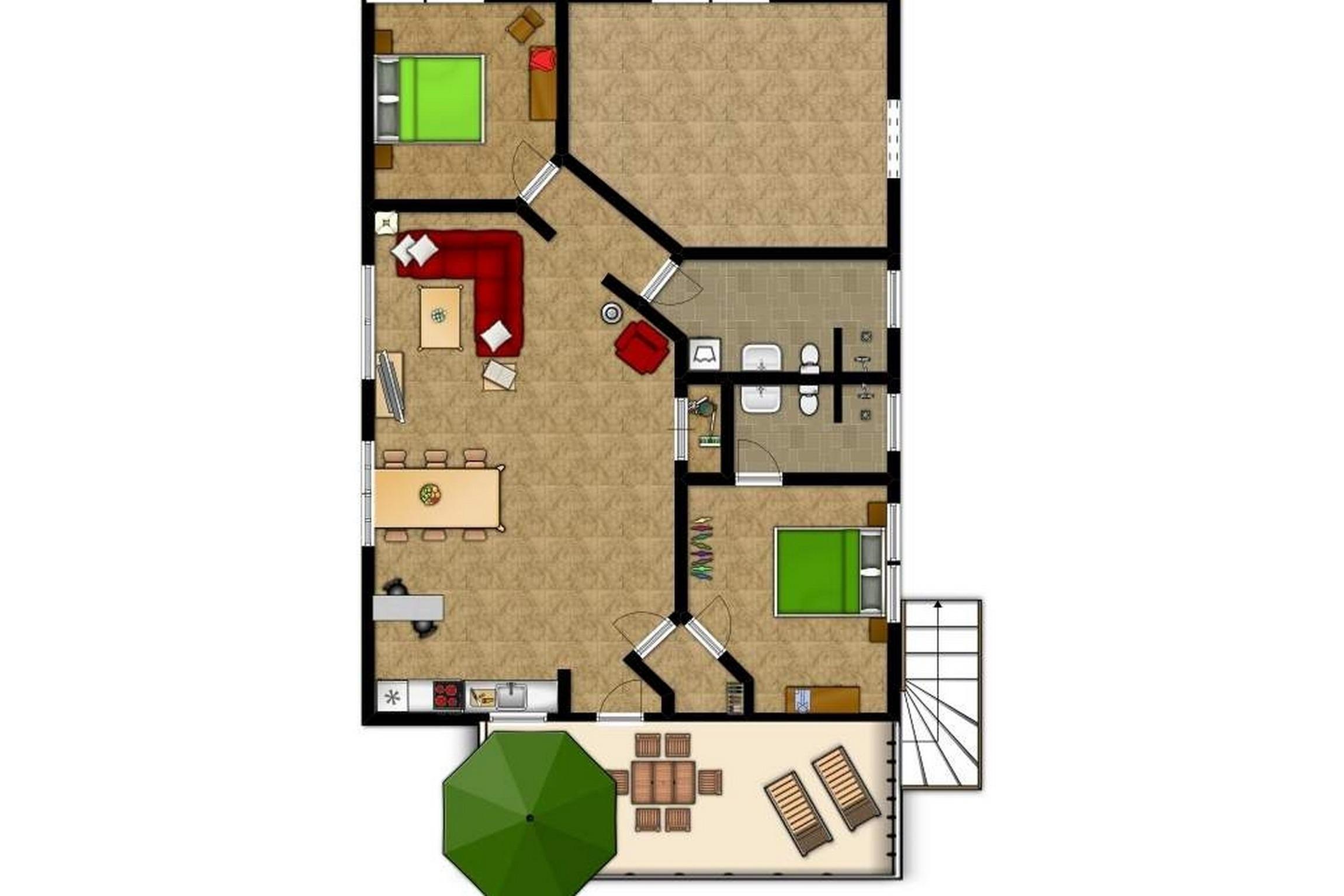Die Wohnung lässt sich separat über eine Außentreppe über die weitgehend überdachte Südost-Dachterrasse betreten. Auf dieser finden Sie Gartenmöbel, zwei Liegestühle, Sonnenschirm und einen Grill.