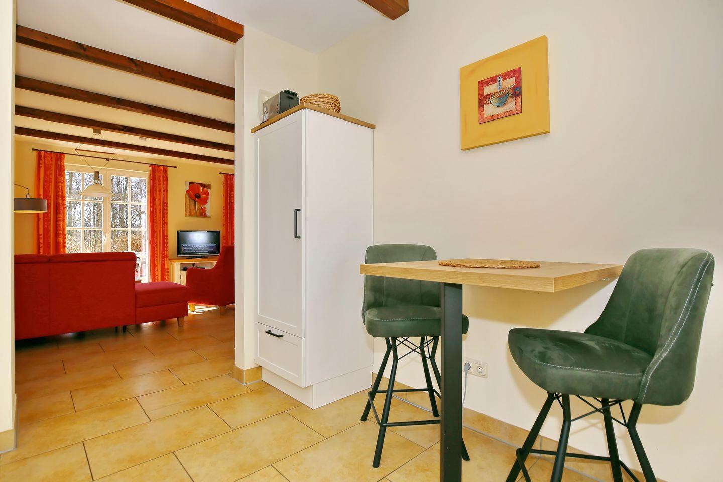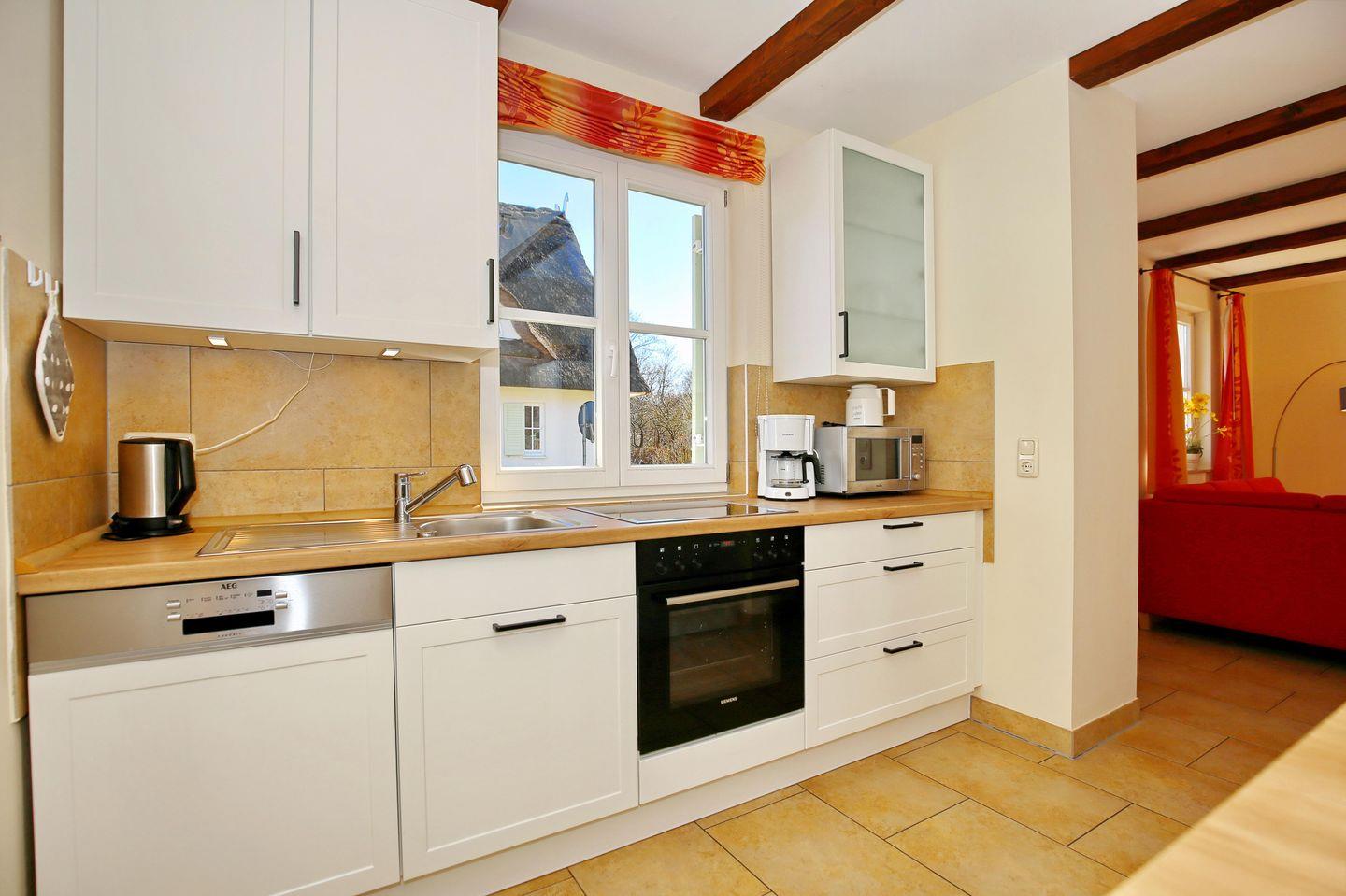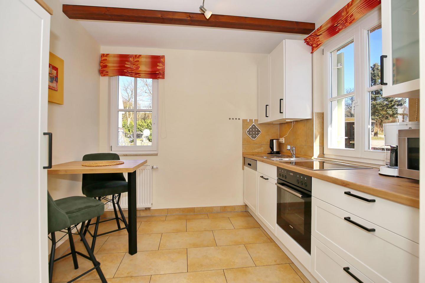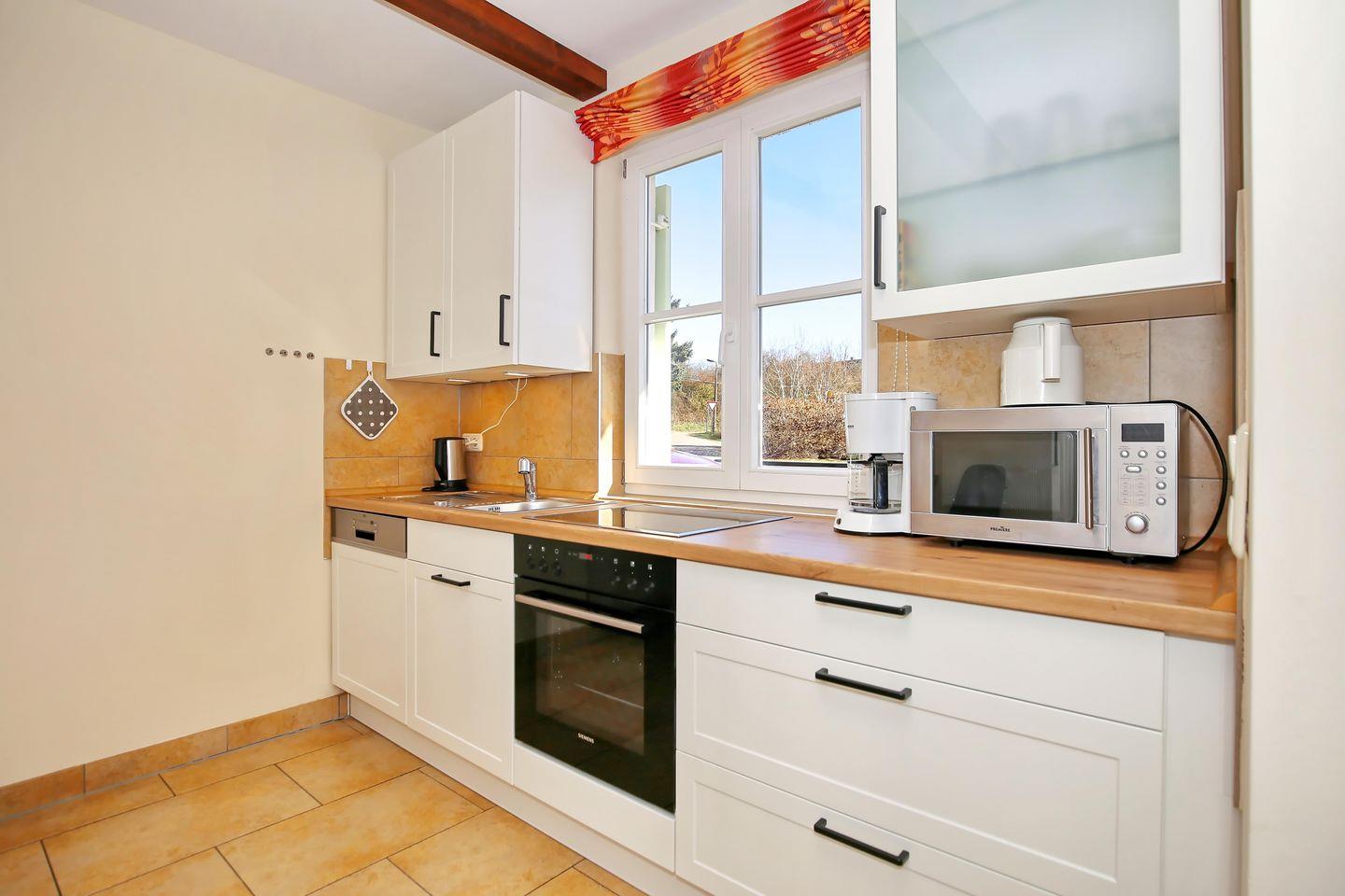Die Küche ist mit einem 4-Zonen-Cerankochfeld, einem Backofen, einem Kühlschrank mit Gefrierfach sowie einer Mikrowelle und einem Geschirrspüler ausgestattet. Ein Wasserkocher, eine Kaffeemaschine sowie ein Toaster vervollständigen die Kücheneinrichtung.