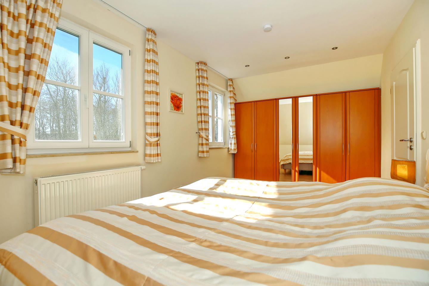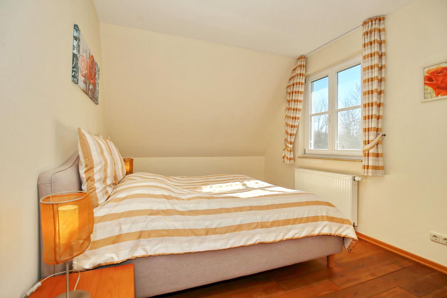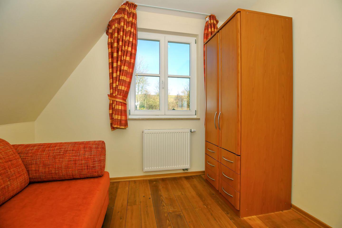 In der oberen Etage befinden sich drei Schlafzimmer. Das erste Schlafzimmer ist mit einem bequemen Doppelbett (2 x 90 x 200 cm) und einem großen Kleiderschrank eingerichtet. Im zweiten Schlafzimmer erwartet dich ein Doppelbett (2 x 80 x 200 cm) zur Nachtruhe. Für dein Urlaubsgepäck ist auch hier ein Kleiderschrank vorhanden. Die ausziehbare Schlafcouch (170 x 200 cm) im dritten Schlafzimmer bietet 2 weiteren Personen einen Schlafplatz. Ein Kleiderschrank dient als Stauraum für deine Kleidung. Zum Verdunkeln kannst du in allen Schlafzimmern Vorhänge nutzen.