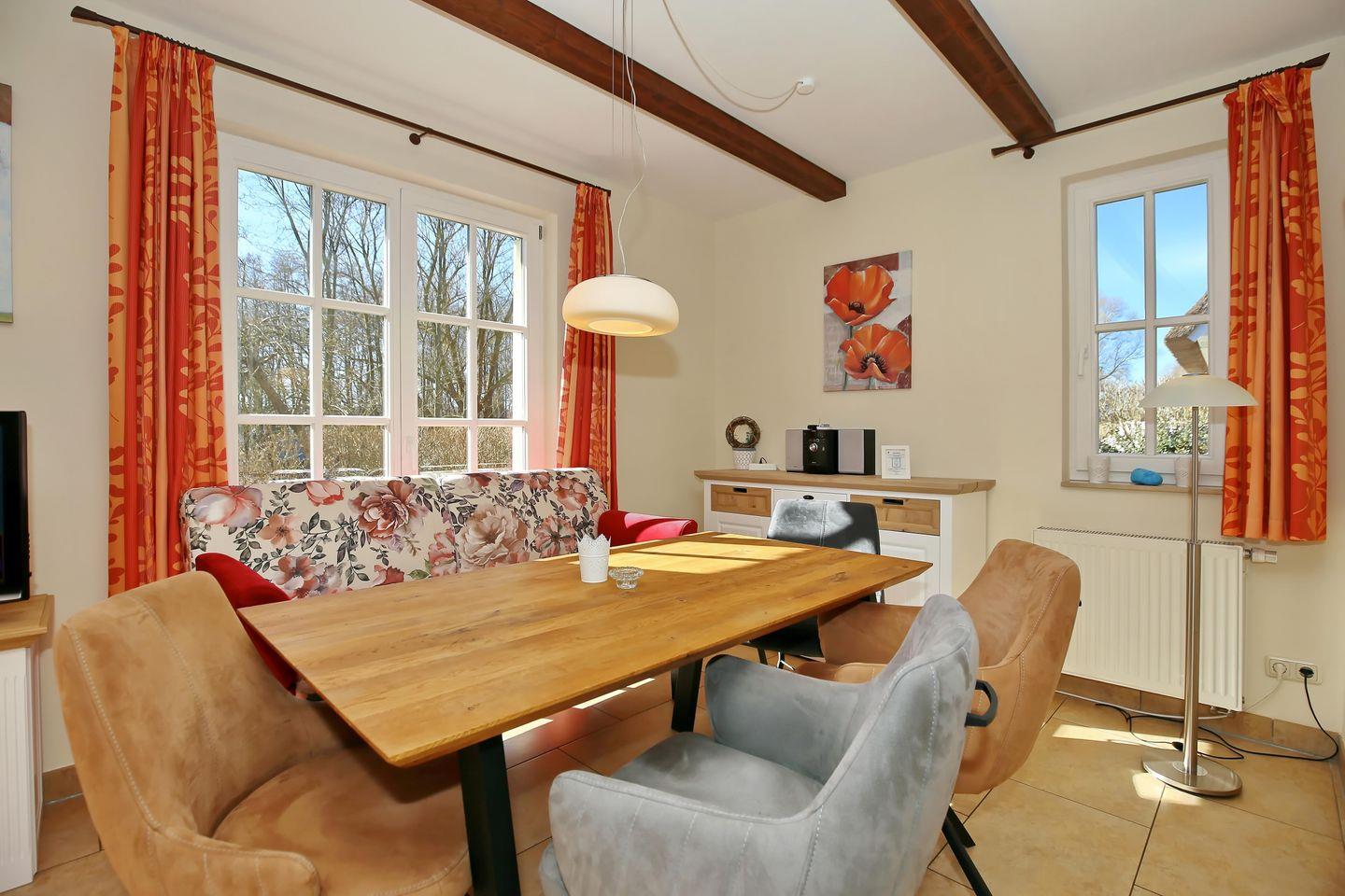 Im Erdgeschoss des Ferienhauses befindet sich der Wohnbereich. Hier laden eine Eckcouch und ein Sessel zu geselligen Abendstunden ein. Zur Unterhaltung stehen ein Flatscreen-TV, ein DVD-Player sowie eine Stereoanlage bereit. Der Essbereich ist im lichtdurchfluteten Wohnbereich integriert und bietet viel Platz für gemeinsame Mahlzeiten. Der Kamin sorgt besonders an kälteren Abenden für Gemütlichkeit und wohlige Wärme. Auf die sonnenverwöhnte Terrasse gelangst du vom Wohnbereich aus.