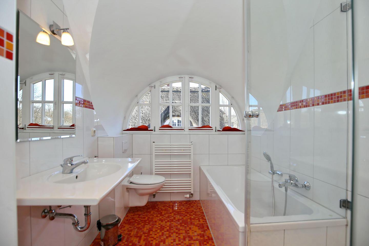 Zum Tageslichtbad im Obergeschoss mit Dusche, Wanne und WC gehören ein Waschtisch mit beleuchtetem Spiegel sowie ein Föhn und ein Handtuchtrockner. Für den Sichtschutz sind an den Fenstern Plissees angebracht. Im Bad des Obergeschosses sowie im gesamten Erdgeschoss sind Bodenfliesen verlegt. Die Schlafräume sind mit einem Holzboden ausgestattet. Das Rauchen ist im Haus „Nanni“ nicht gestattet. Haustiere sind willkommen.
