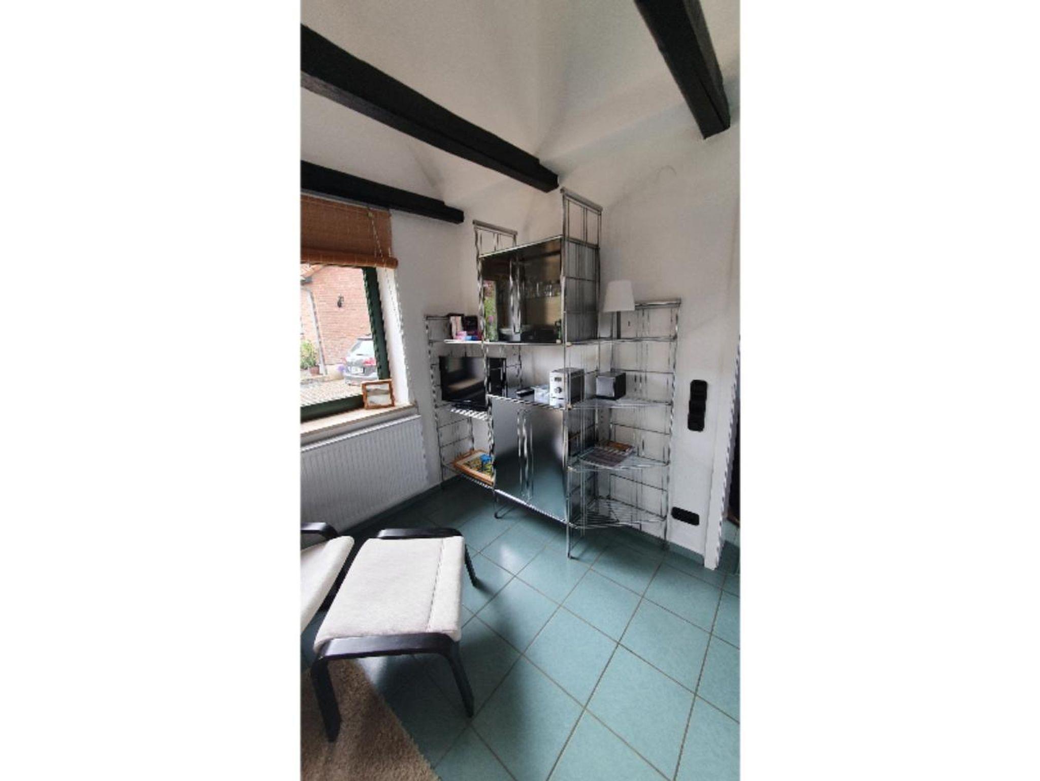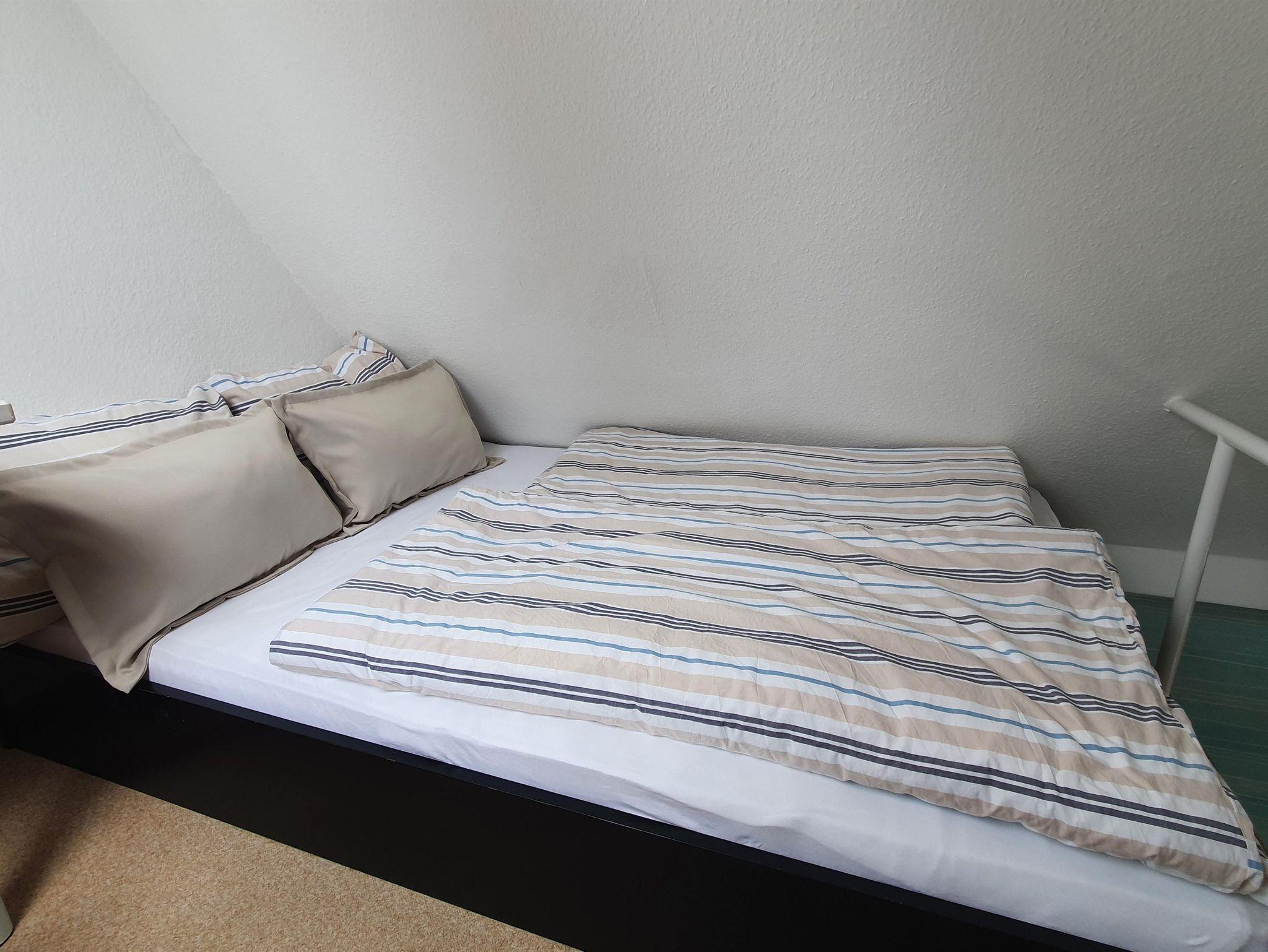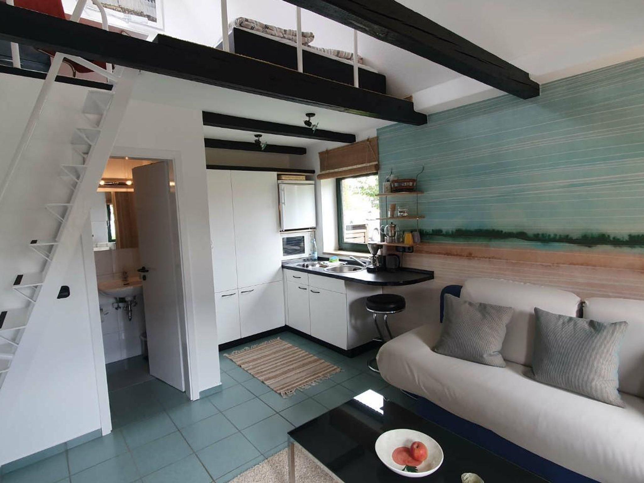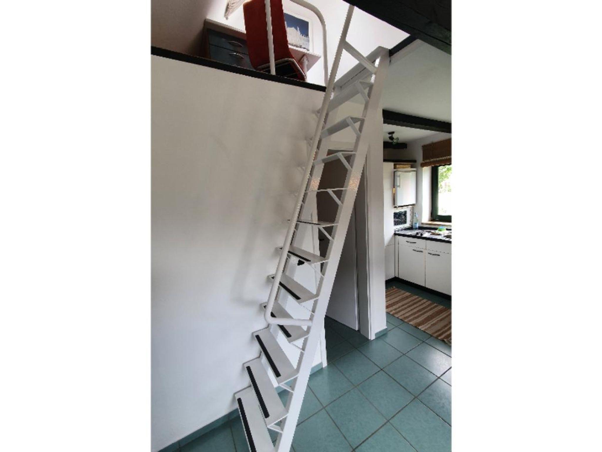Kochnische im Wohnbereich, sehr steile Treppe zum Schlafboden (Bett 140 x 200cm) auf der Galerie unter der Schräge. Duschbad.