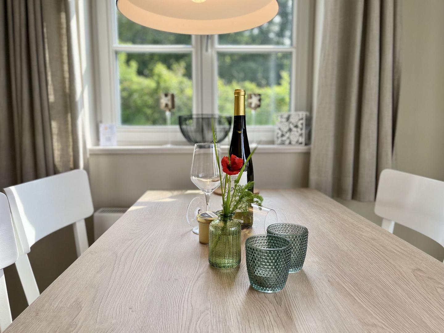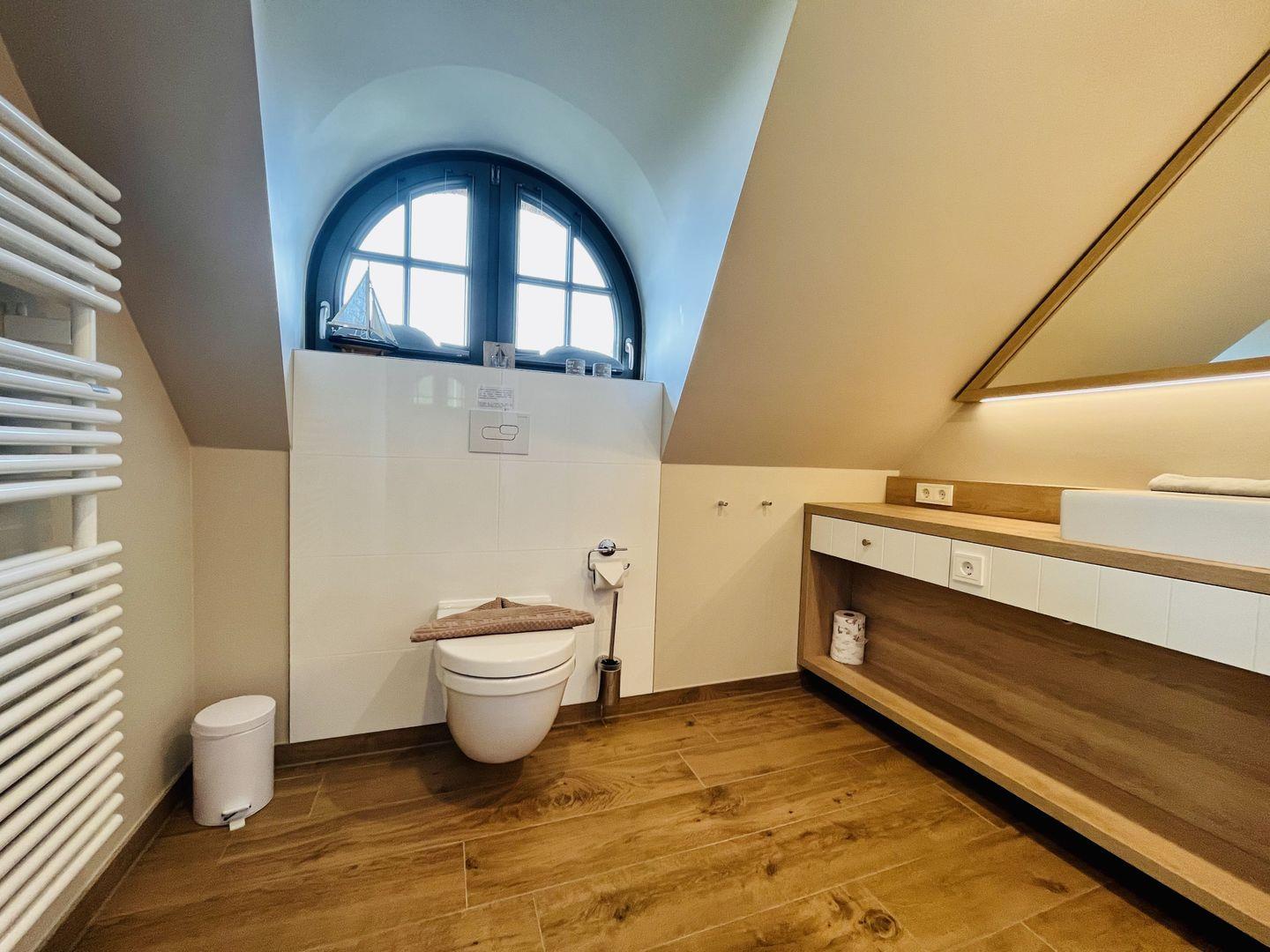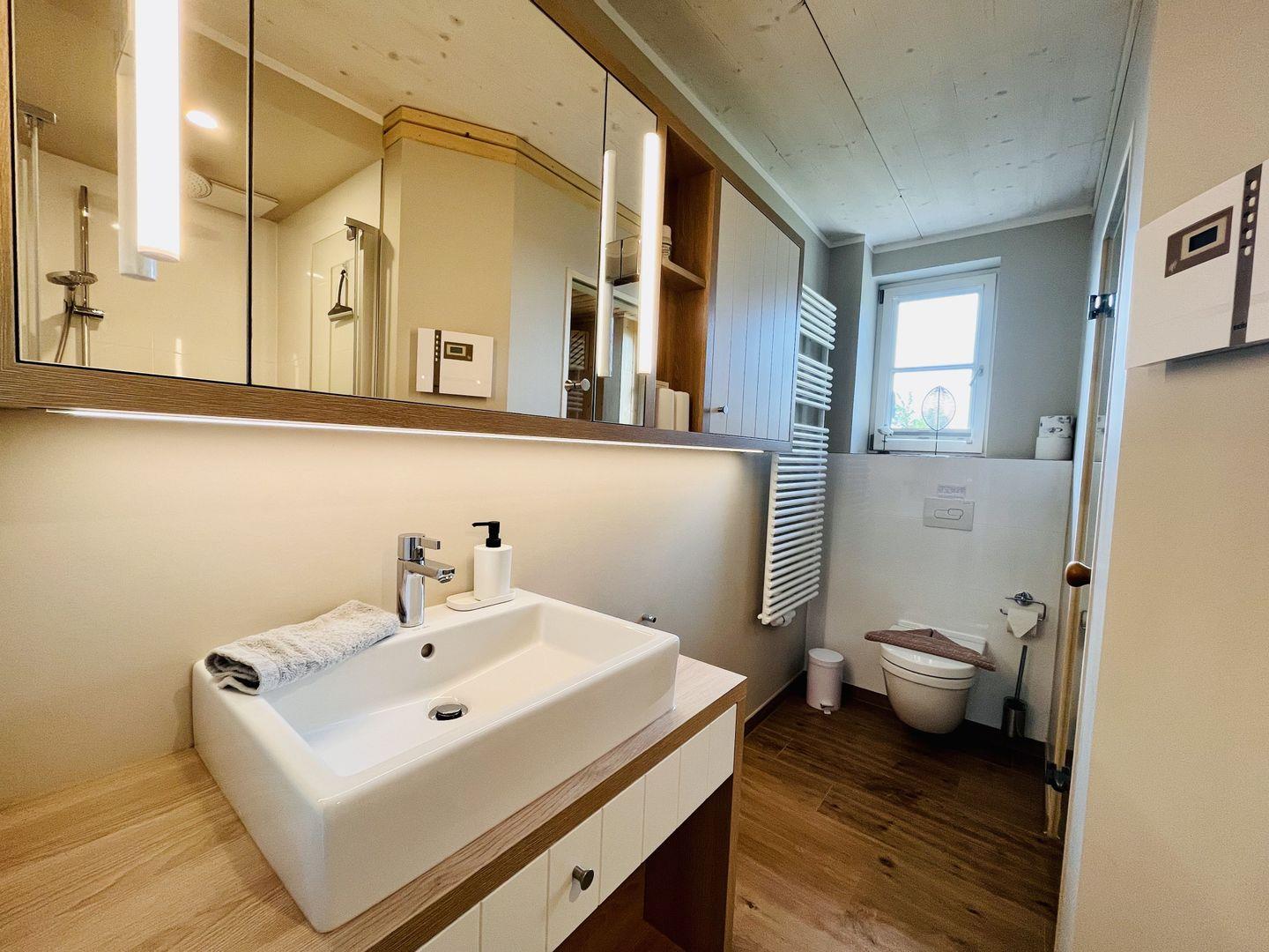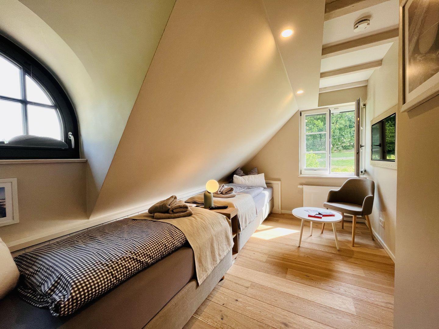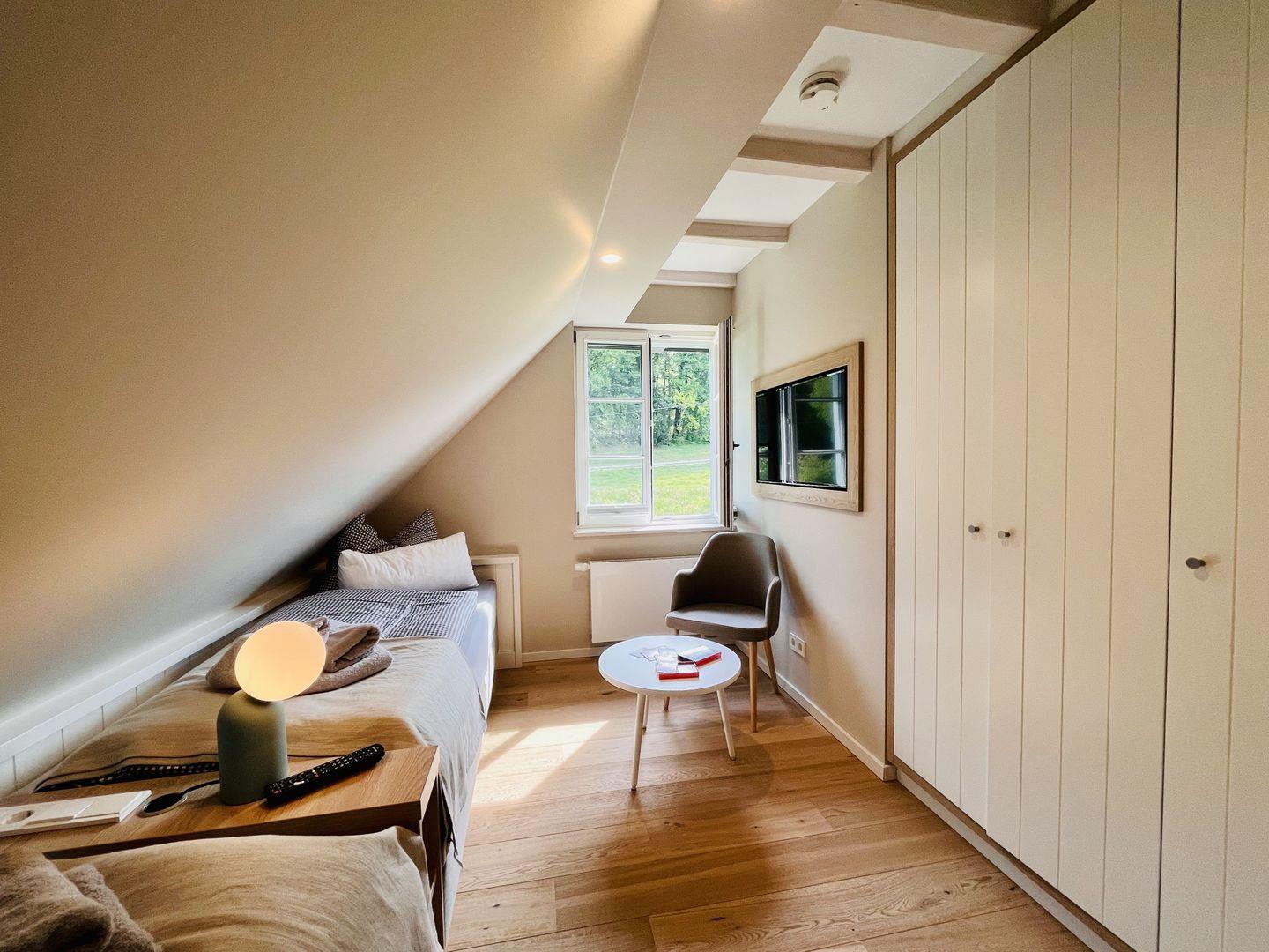 Kaffeezubereiter genossen werden. Abwaschen muss hier zum Glück niemand. Es gibt einen Geschirrspüler. Weiter geht’s mit den beiden komfortablen Schlafzimmern. Ein bequemes Boxspringdoppelbett (1,80 x 2,10) und zwei Boxspringeinzelbetten (90 x 200) versprechen erholsame Träume. Die Zimmer verfügen über je einen Kleiderschrank und ebenfalls einen Flat-TV. Zwei Bäder mit Dusche und WC sorgen für genügend Raum zum Frischmachen. Das Bad im EG ist zudem mit einer Finnischen Sauna ausgestattet. Bei Anreise liegen Handtücher und Abtrockentücher für die Küche für Sie bereit und die Betten sind bezogen.