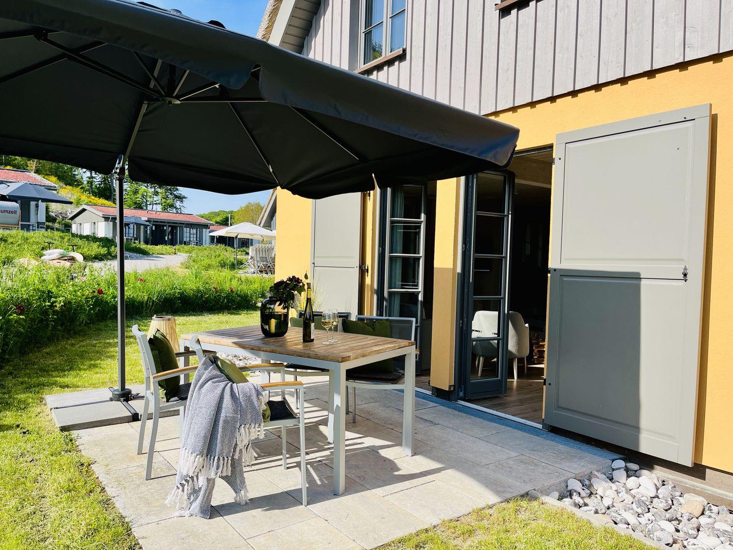 Im Feriendorf Klein Stresow werden Sie auf 61 Quadratmeter in Ihrer eigenen, stylischen Ferienhaushälfte mit Garten und Weitblick begrüßt . Hier beginnt der Urlaub für bis zu 4 Personen schon beim Eintreten. Wenn Sie es genau nehmen, schon beim Ankommen. Das Auto auf dem für Sie reservierten Stellplatz abgestellt, können Sie bei so viel sonniger Leichtigkeit erst einmal richtig durchatmen. Öffnen Sie die bodentiefen Fenster zu Ihrer Westterrasse und genießen Sie die frische Ostseebrise. Hier lässt es sich ausgezeichnet frühstücken. Das Innere Ihrer Ferienhaushälfte ist bis ins Detail aufs Feinste eingerichtet. Lampen, Möbel und Bilder sind nordisch nobel. Ein Sofa lädt zum Relaxen ein. Zur Ausstattung des Wohn-Esszimmers gehören ein Kamin und ein Flat-TV. Das WLAN können Sie kostenfrei nutzen. Ein schöner Esstisch mit vier Stühlen eignet sich bestens für die Mahlzeiten.