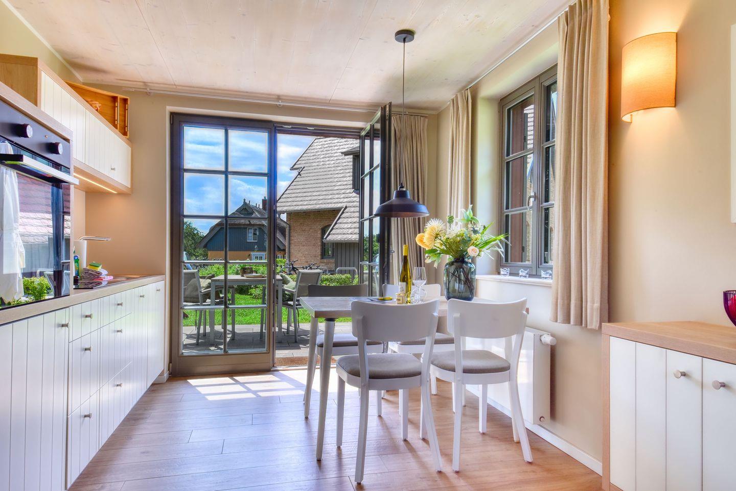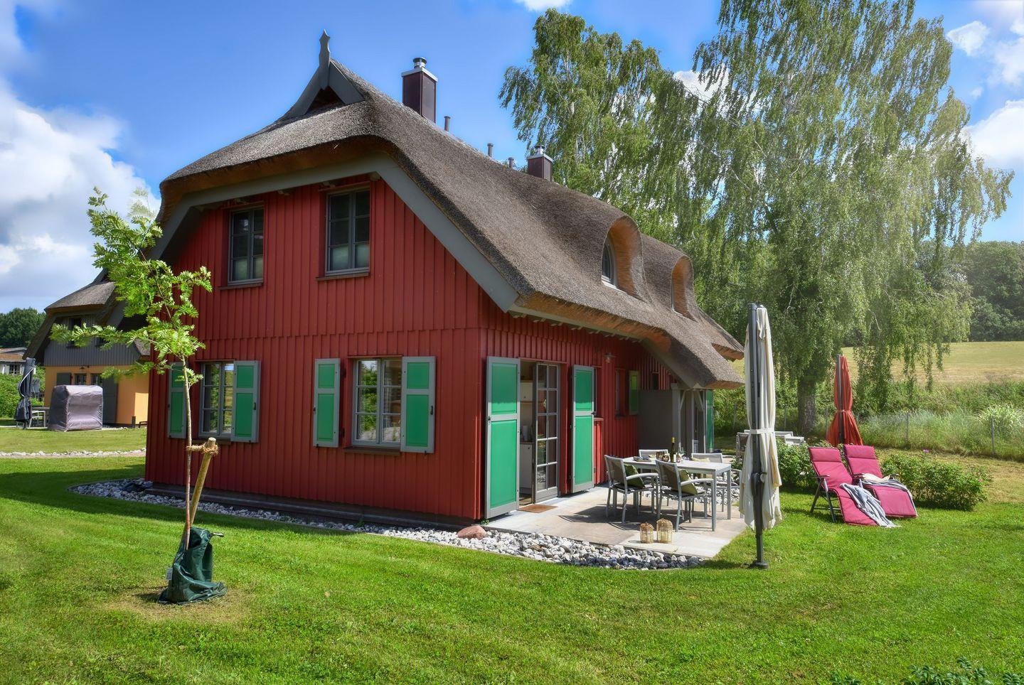 Im Feriendorf Klein Stresow werden Sie auf 61 Quadratmeter in Ihrer eigenen, stylischen Ferienhaushälfte mit Garten und Weitblick begrüßt . Hier beginnt der Urlaub für bis zu 5 Personen schon beim Eintreten. Wenn Sie es genau nehmen, schon beim Ankommen. Das Auto auf dem für Sie reservierten Stellplatz abgestellt, können Sie bei so viel sonniger Leichtigkeit erst einmal richtig durchatmen. Öffnen Sie die bodentiefen Fenster zu Ihrer Südterrasse weit und genießen Sie die frische Ostseebrise. Hier lässt es sich ausgezeichnet frühstücken. Das Innere Ihrer Ferienhaushälfte ist bis ins Detail aufs Feinste eingerichtet. Lampen, Möbel und Bilder sind nordisch nobel. Ein Sofa mit Ottomane lädt zum Relaxen ein. Zur Ausstattung des Wohn-Esszimmers gehören ein Kamin und ein Flat-TV. Das WLAN können Sie kostenfrei nutzen. Ein schöner Esstisch mit vier Stühlen eignet sich bestens für die Mahlzeiten.