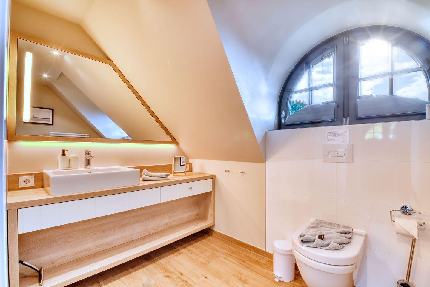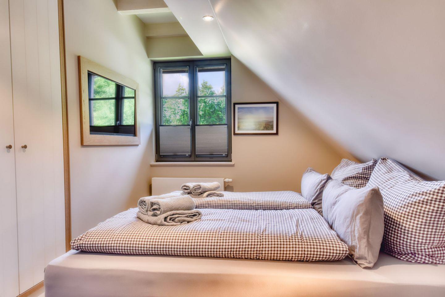 Zwei bequeme Boxspringdoppelbetten (180 x 200) versprechen erholsame Träume. Die Zimmer verfügen über je einen Kleiderschrank und ebenfalls einen Flat-TV. Eine 5. Person findet auf der Schlafcouch im Wohnzimmer Platz. Zwei Bäder mit Dusche und WC sorgen für genügend Raum zum Frischmachen. Das Bad im EG ist zudem mit einer Finnischen Sauna ausgestattet. Bei Anreise liegen Handtücher für Sie bereit und die Betten sind bezogen.