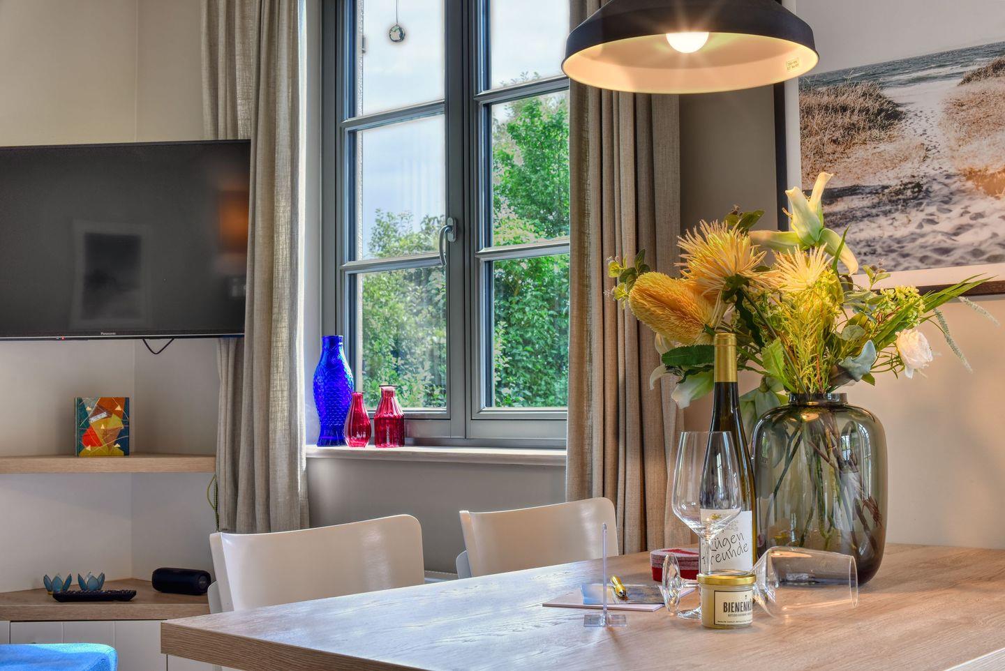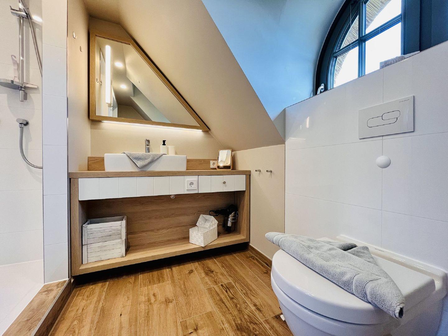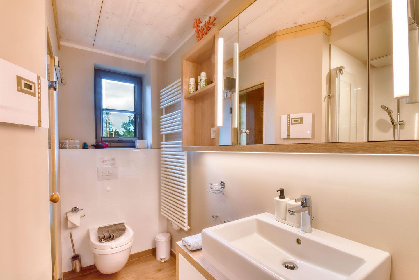 Die offene Küche ist modern und durchdacht ausgestattet, alle Geräte sind hochwertig. Ein komplettes Geschirr-Service, Gläser, WMF-Töpfe und viele nützliche Kleinigkeiten befinden sich in den Schränken. Abwaschen muss hier zum Glück keiner, denn es gibt einen Geschirrspüler. Weiter geht es zu den beiden komfortablen Schlafzimmern mit Eichenfußboden in der ersten Etage. Ein bequemes Boxspringdoppelbett (180 x 200 cm) und zwei Boxspringeinzelbetten (je 90 x 200 cm) und kuscheliges Bettzeug versprechen erholsame Träume. Die Zimmer verfügen jeweils über einen Kleiderschrank, Flat-TV und Ablagemöglichkeiten und lassen sich mittels Innenrollos gut verdunkeln. Bei Ihrer Anreise liegen Handtücher bereit und die Betten sind für Sie bezogen. Zwei vollausgestattete Badezimmer mit Regendusche und WC bieten genügend Raum zum Frischmachen. In der finnischen Sauna im Erdgeschoß können Sie nach den Aktivitäten des Tages bei einem Blick aus dem Fenster ins Grüne entspannen. Gerne können Sie hierfür ein Wellnesspaket mit Bademantel und Saunatuch hinzubuchen.