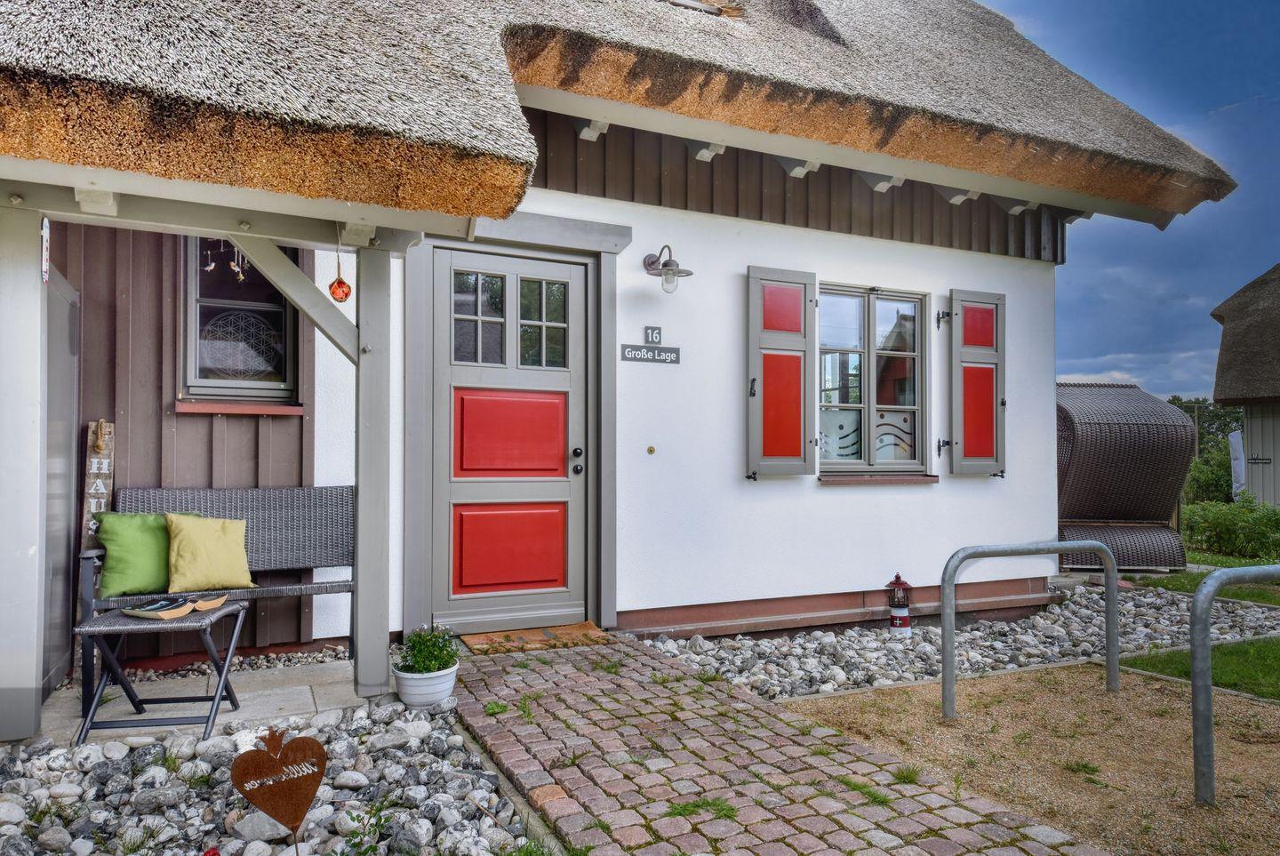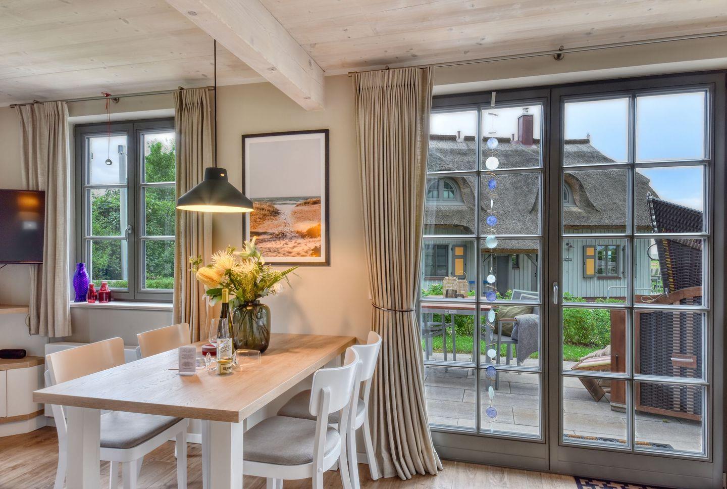 Im Feriendorf Klein Stresow werden Sie auf 60 bestens geplanten Quadratmetern in Ihrer eigenen, stylischen mit Reet gedeckten Ferienhaushälfte "Große Lage" mit Garten, Meer- und Weitblick begrüßt. Hier beginnt der Urlaub für bis zu 4 Personen schon beim Eintreten. Wenn Sie es genau nehmen, bereits bei der Ankunft. Ihren Wagen stellen Sie einfach auf dem für Sie reservierten Stellplatz ab. Machen Sie die bodentiefen Fenster zu Ihrer Südterrasse weit auf und nehmen Sie Platz im komfortablen Strandkorb oder auf den hochwertigen Terrassenmöbeln. Umweht von einer frischen Brise, dem schönen Blick aufs Meer, grünen Wiesen und Fliederhecken wird dieser Ort für Sie ganz sicher zur „Großen Lage“. Das Innere Ihrer Ferienhaushälfte ist bis ins Detail aufs Feinste eingerichtet. Lampen, Möbel und Bilder sind nordisch schlicht, aber nobel und individuell angefertigt. Ein Sofa mit Ottomane lädt zum Relaxen ein. Zur Ausstattung des Wohn-Esszimmers gehören ein Kaminofen mit Sichtfenstern und ein Flat-TV. Das WLAN können Sie kostenfrei nutzen. Ein schöner Esstisch mit vier Stühlen eignet sich bestens für die Mahlzeiten und gesellige Spielerunden.