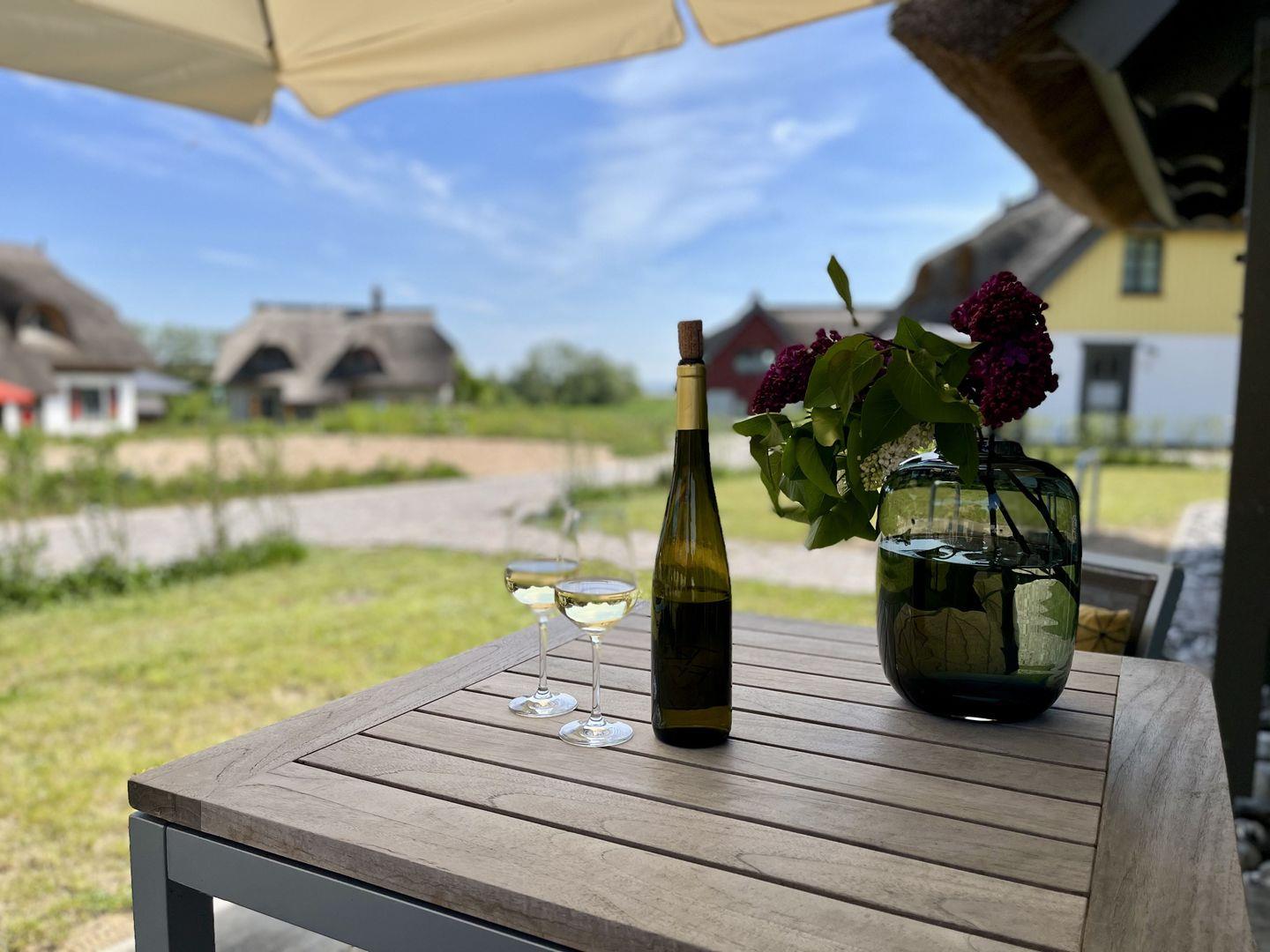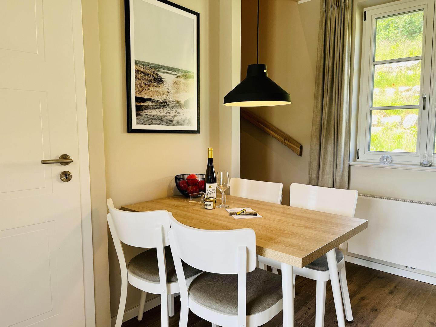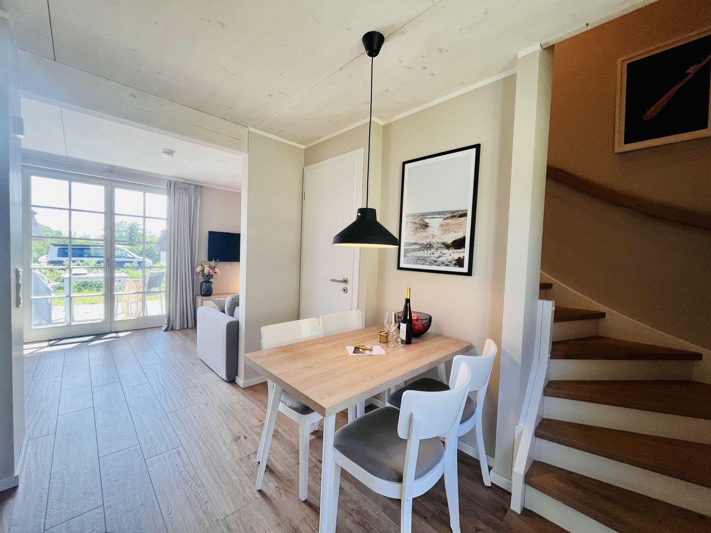 Im Feriendorf Klein Stresow werden Sie auf 43 Quadratmeter in Ihrer eigenen, stylischen Ferienhaushälfte mit Garten und Weitblick begrüßt . Hier beginnt der Urlaub für bis zu 3 Personen schon beim Eintreten. Wenn Sie es genau nehmen, schon beim Ankommen. Das Auto auf dem für Sie reservierten Stellplatz abgestellt, können Sie bei so viel sonniger Leichtigkeit erst einmal richtig durchatmen. Öffnen Sie die bodentiefen Fenster zu Ihrer Westterrasse und genießen Sie die frische Ostseebrise. Hier lässt es sich ausgezeichnet frühstücken. Das Innere Ihrer Ferienhaushälfte ist bis ins Detail aufs Feinste eingerichtet. Lampen, Möbel und Bilder sind nordisch nobel. Ein Sofa mit Ottomane lädt zum Relaxen ein. Zur Ausstattung des Wohn-Esszimmers gehört ein Flat-TV. Das WLAN können Sie kostenfrei nutzen. Ein schöner Esstisch mit vier Stühlen eignet sich bestens für die Mahlzeiten.