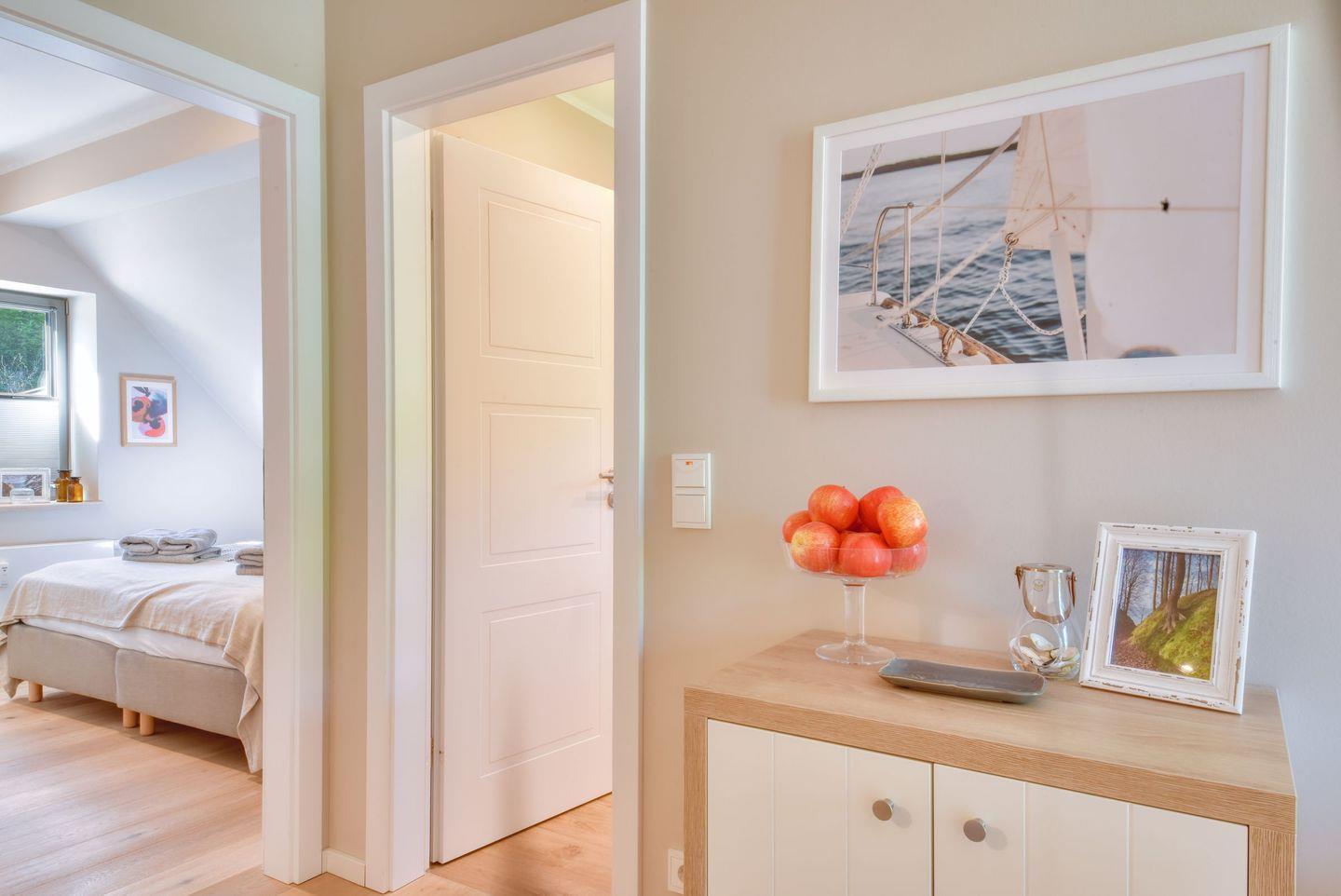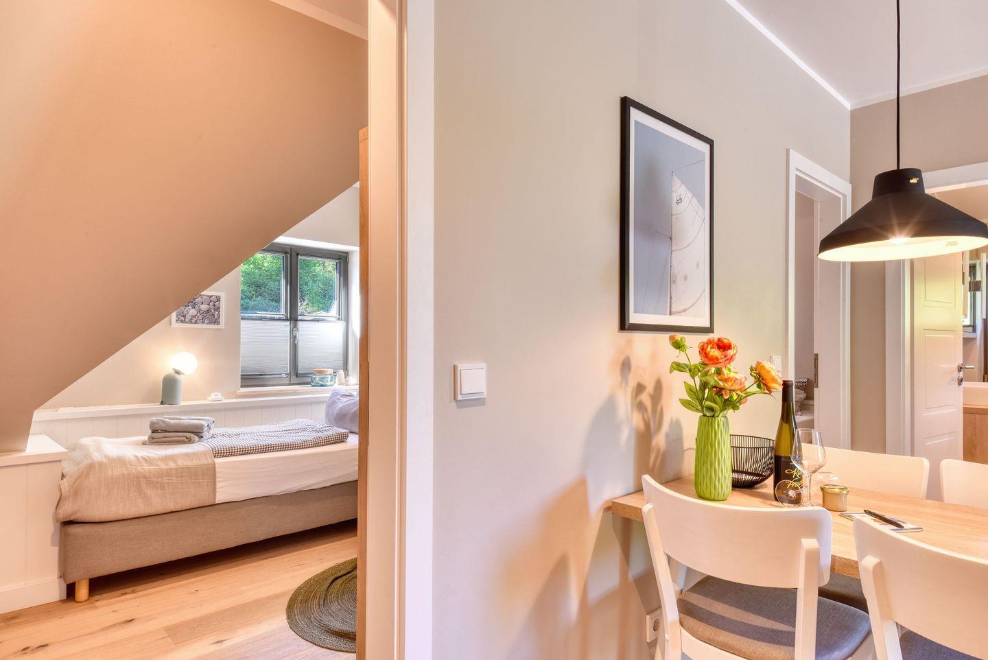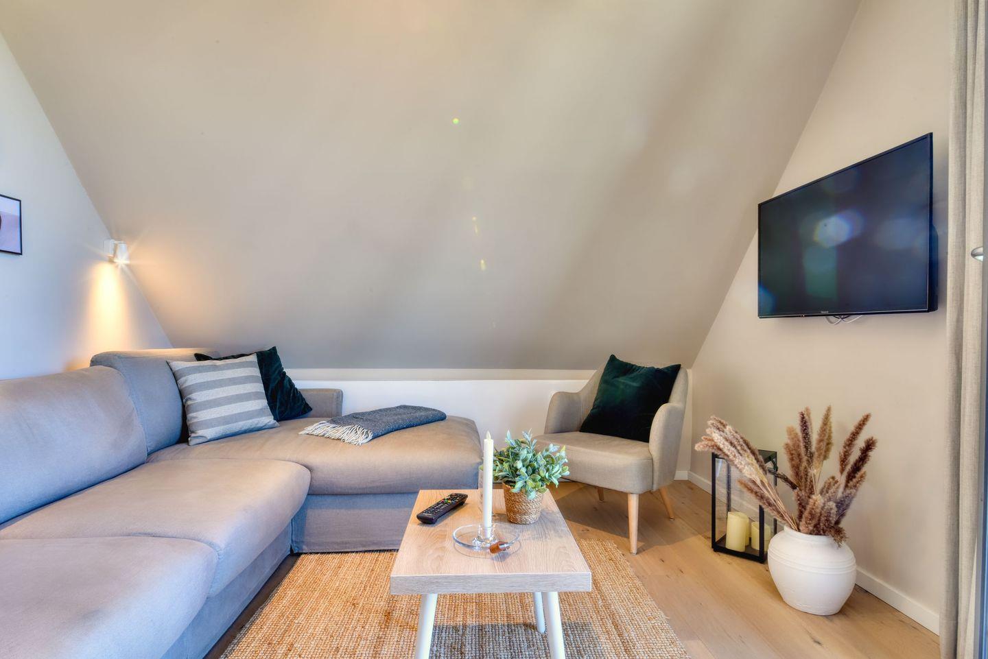 Zubereiten können Sie in der offenen und modernen Küche. Alle Geräte sind hochwertig. Ein komplettes Geschirr-Service befindet sich in den Schränken. Abwaschen muss hier zum Glück niemand. Es gibt einen Geschirrspüler. Weiter geht’s mit den beiden komfortablen Schlafzimmern. Ein bequemes Boxspringdoppelbett (180 x 200) und zwei Boxspringeinzelbetten (90 x 200) versprechen erholsame Träume. Die Zimmer verfügen über je einen Kleiderschrank und ebenfalls einen Flat-TV. Ein Bad mit Dusche und WC sorgen für genügend Raum zum Frischmachen. Bei Anreise liegen Handtücher für Sie bereit und die Betten sind bezogen.