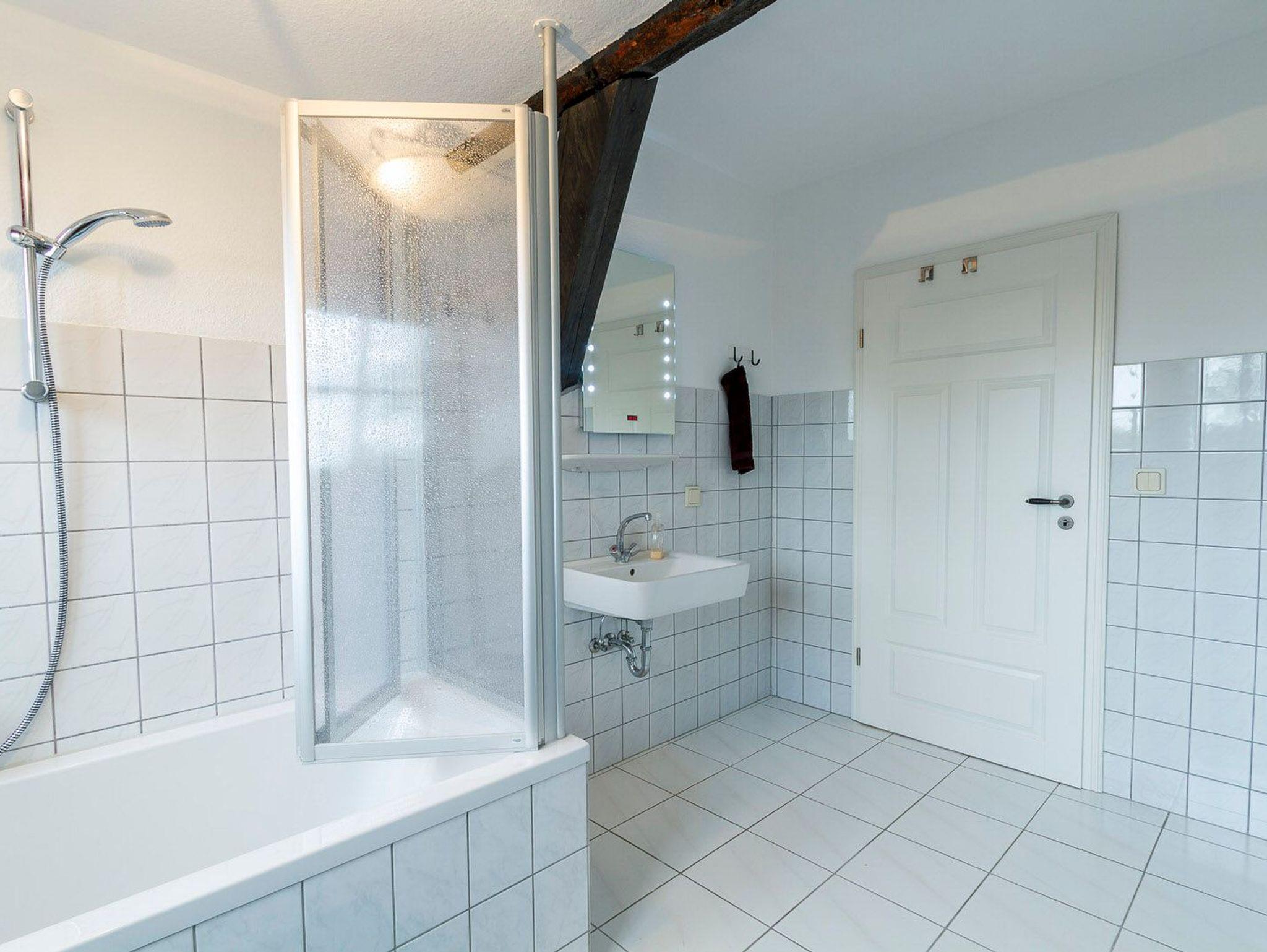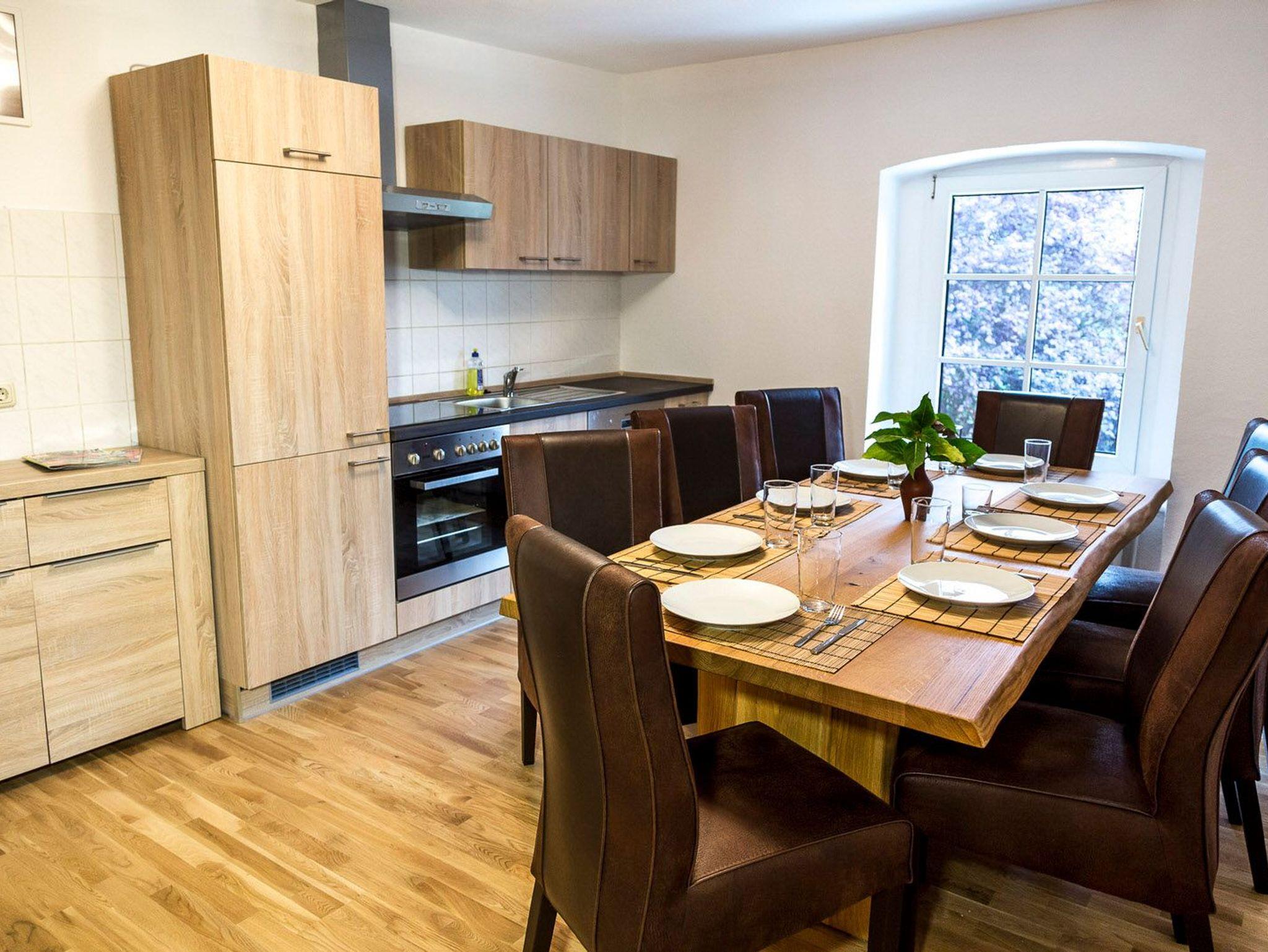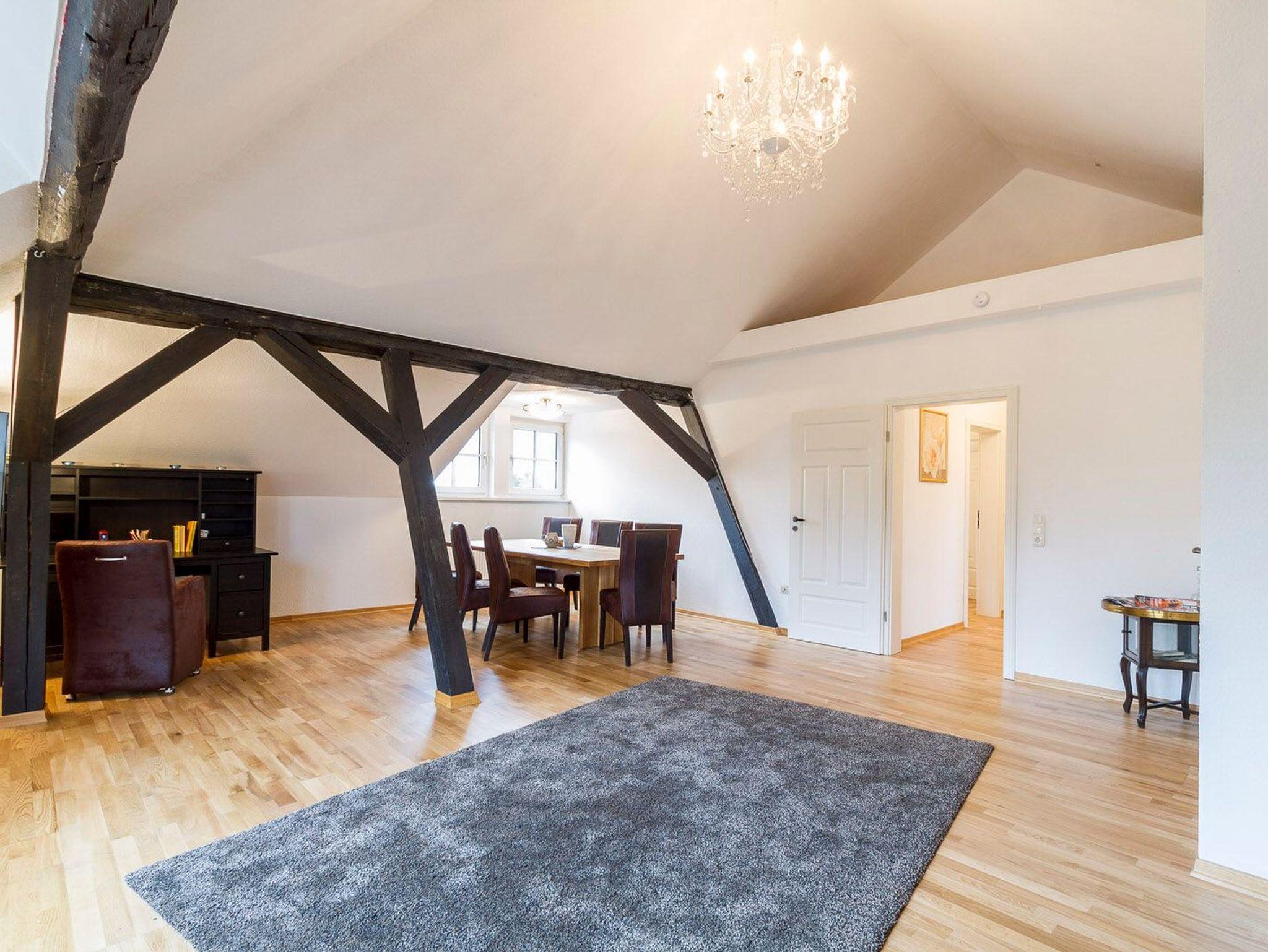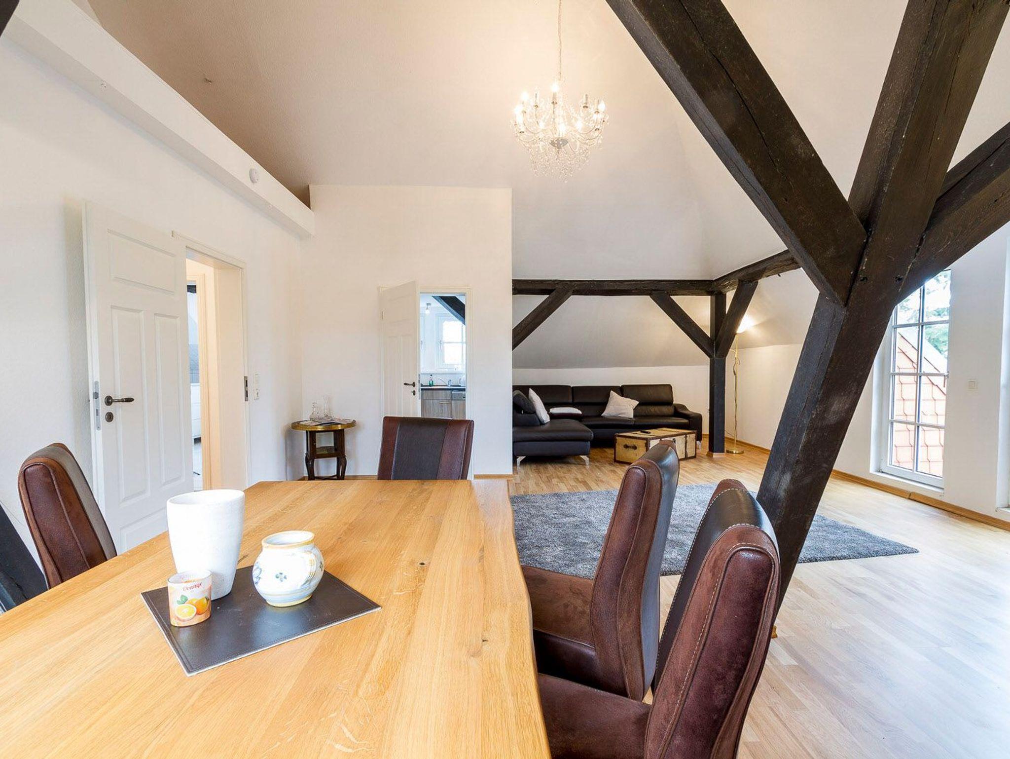 Ferienwohnung Hofblick: 120 m², 3 Schlafzimmer, für bis 6 Personen, alle mit Fernseher ausgestattet, ein schönes Bad, eine großzügige Wohnküche mit integriertem Wohnzimmer.