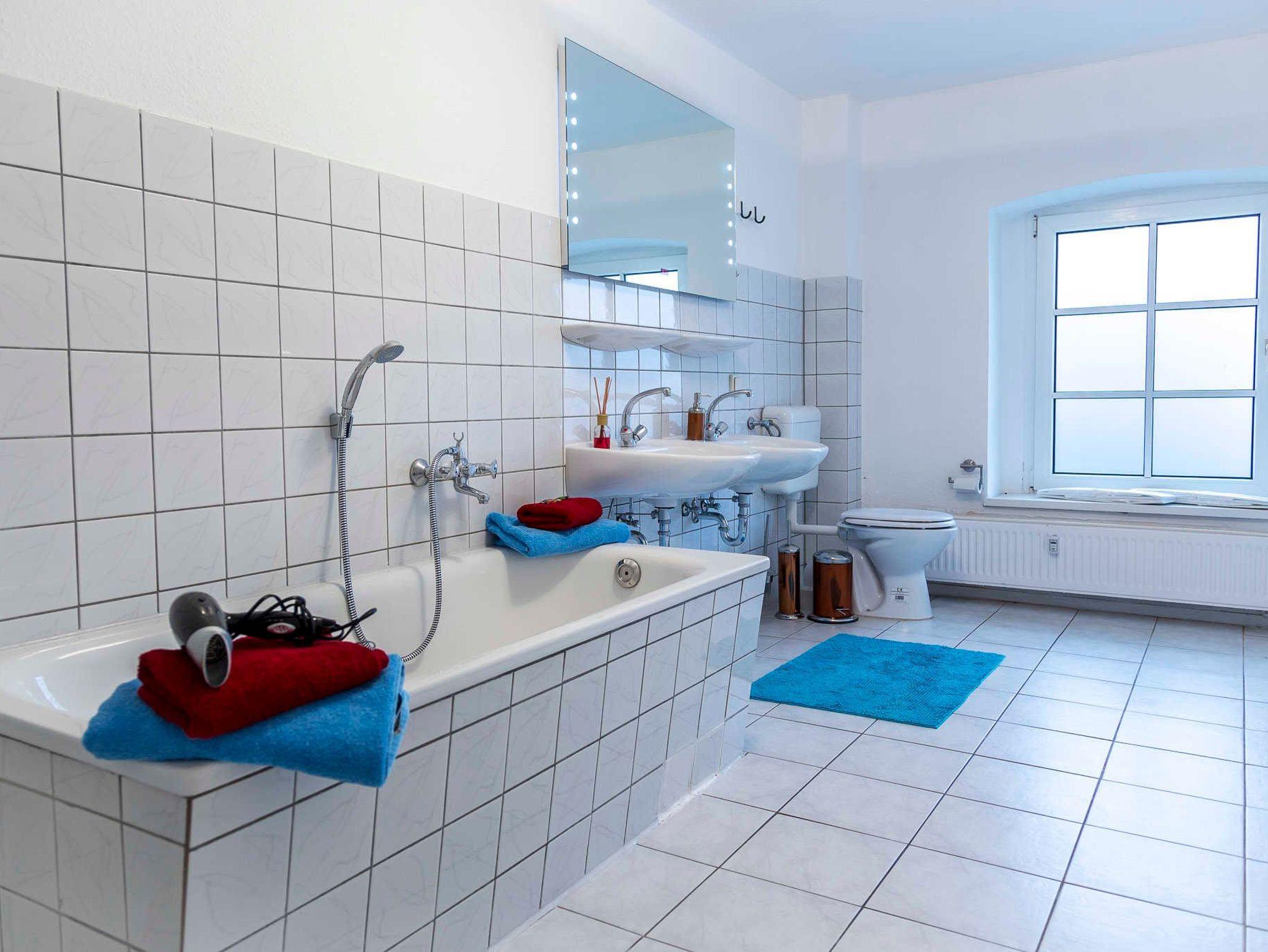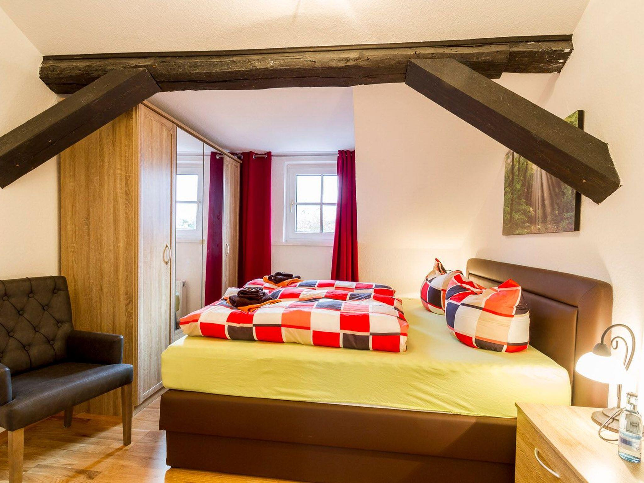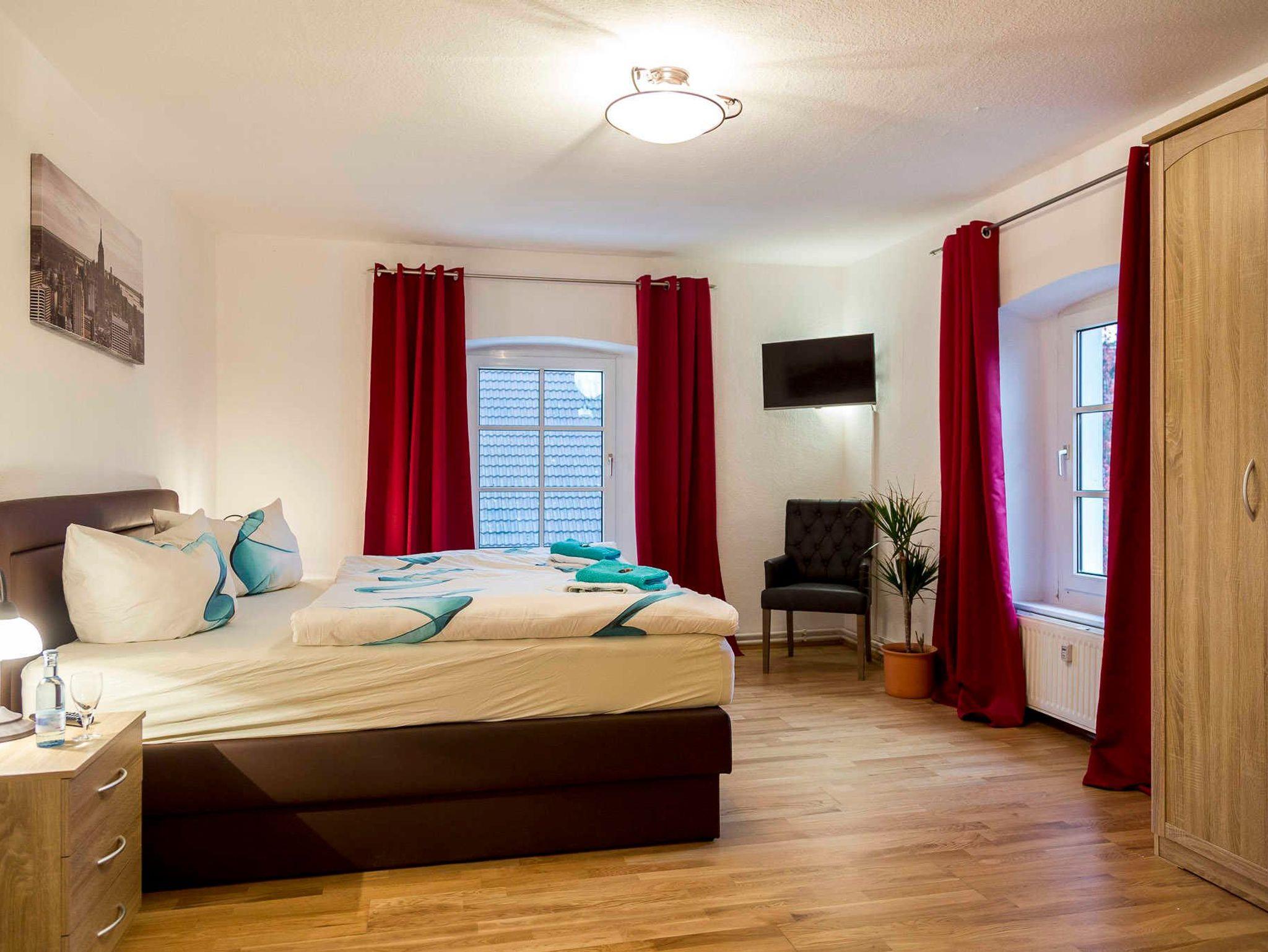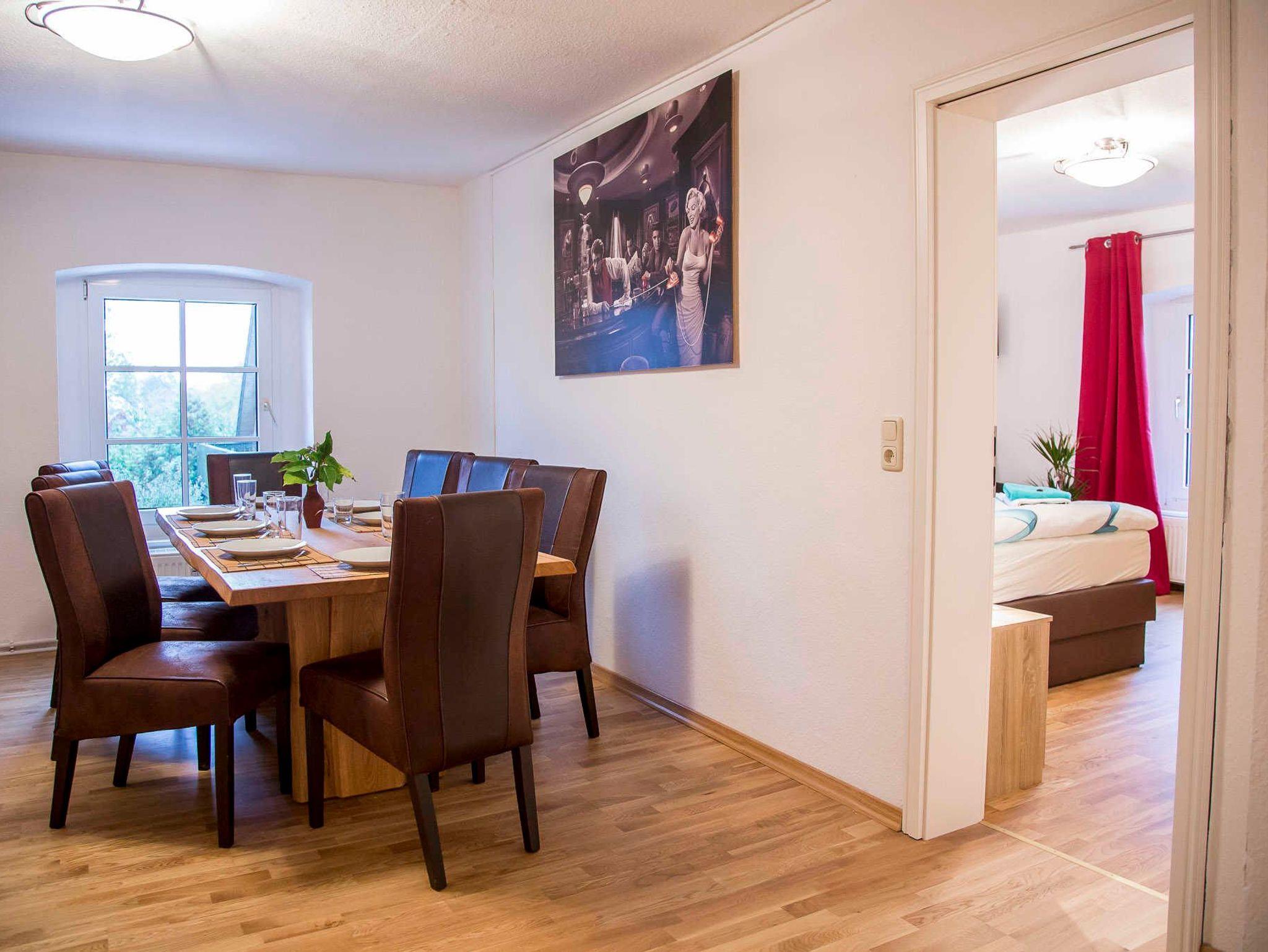 Ferienwohnung Hofblick: 120 m², 3 Schlafzimmer, für bis 6 Personen, alle mit Fernseher ausgestattet, ein schönes Bad, eine großzügige Wohnküche mit integriertem Wohnzimmer.