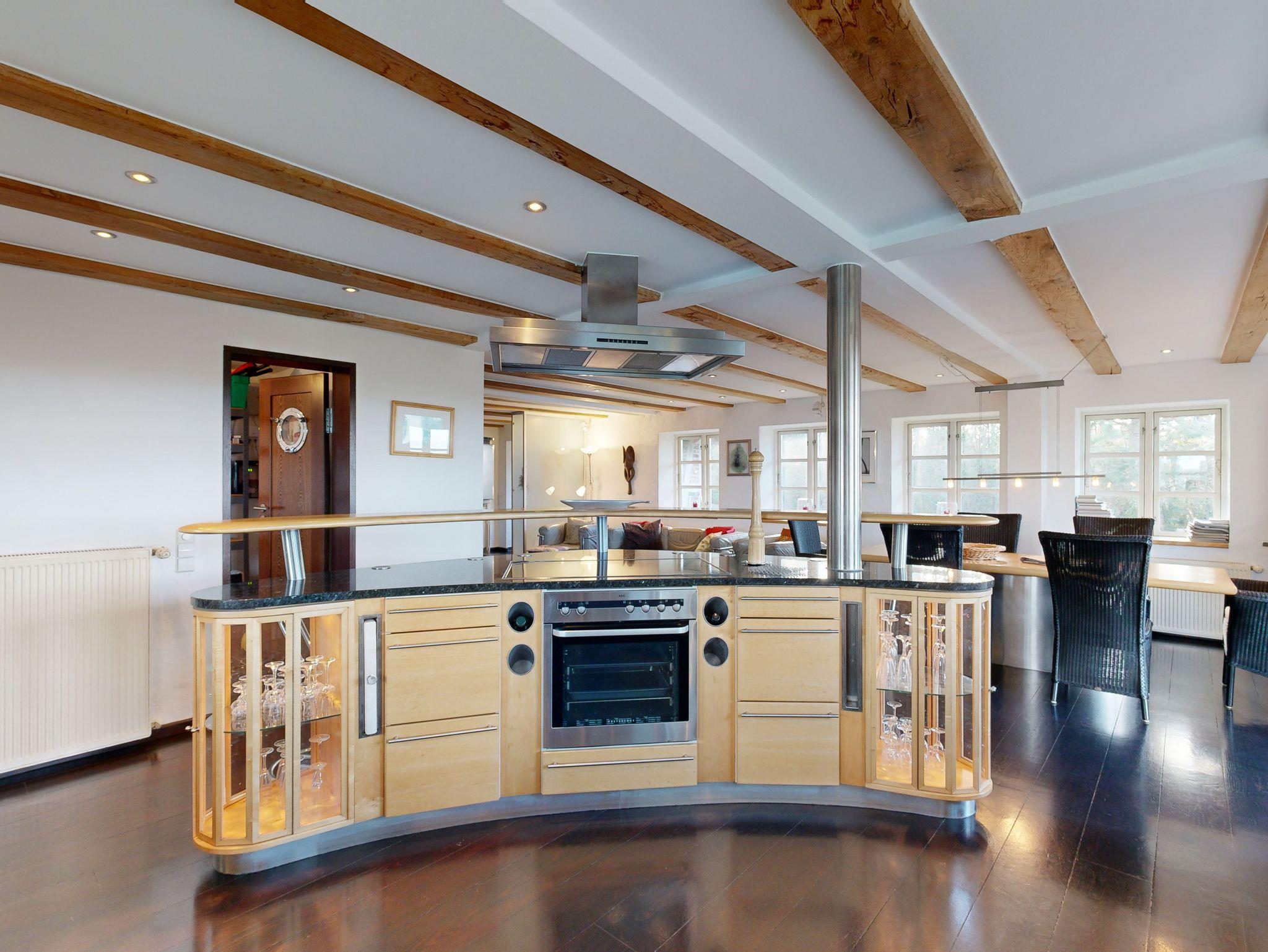 * Küche: Thekenartig (in Form eines Bummerangs) abgetrennter Küchenbereich mit modernster Ausstattung, wie Spülmaschine, Ceranfeld, Mikrowelle, Backofen, Wasserkocher, Kaffeemaschine und Toaster