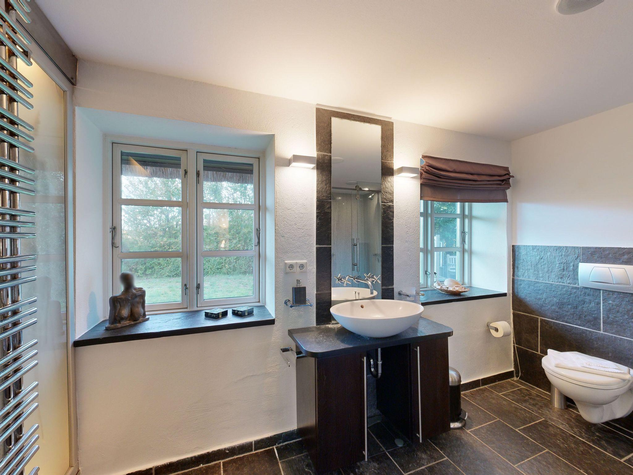 * 1 Badezimmer mit Blick auf die Ostsee, Badewanne, gläserne Dusche, WC und Föhn
