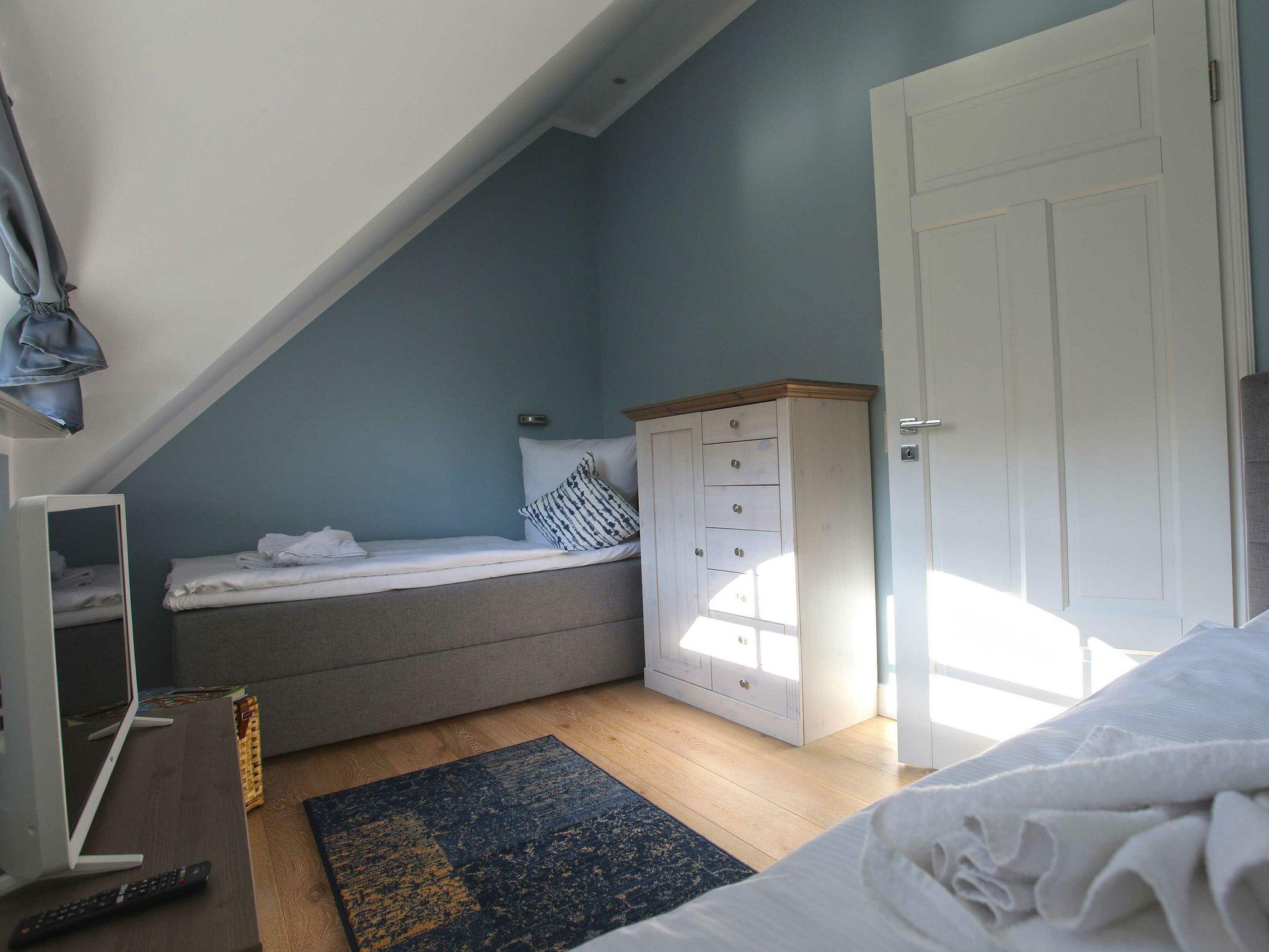 Im Obergeschoss erwarten Sie zwei weitere Schlafzimmer - eines davon mit einem Boxspringbett (180 x 200 cm) (Durchgangszimmer) mit getrennten Matratzen und durchgehender Topper sowie einem eigenen TV. Das zweite der Schlafzimmer im Obergeschoss ist mit zwei Einzelbetten (Boxspringbetten 90 x 200 cm) und ebenfalls einem eigenen TV ausgestattet. In allen Schlafzimmern im Haus besteht selbstverständlich die Möglichkeit, die Fenster mit Vorhängen abzudunkeln.